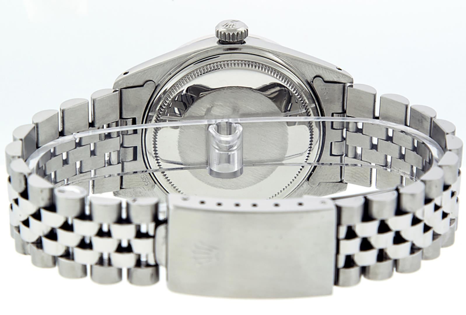 One Mens Pre Owned Rolex Datejust Polished, Serviced And Electronically Tested, Stainless Steel Case: 36mm, Stainless Steel Crown, Custom Bezel: 18K White Gold Emerald Beadset Diamond Bezel, Diamond + Gem Count: 36 Diamonds + 4 Emeralds. Custom Crystal: New Sapphire With Magnified Date Window. Custom Hands: New Luminescent Hands. Rolex Movement: Automatic Winding Movement 3035. Custom Dial: Custom Green Vignette With Added Diamond Hour Markers, 10 Diamonds In Dial. Date Window: 3 O'Clock Position Date Display, Quickset, Model: Quickset Datejust. Condition: G-6 Extra Fine. Rolex Bracelet: Stainless Steel Jubilee Band. Bright Polish And Satin Finish. 7.0 Inch Length, Adjustable. Standard Clasp, With Rolex Logo. This Watch Has Been Serviced Time Tested And Is In Excellent Condition It Is Free Of All Scratches And Dents.