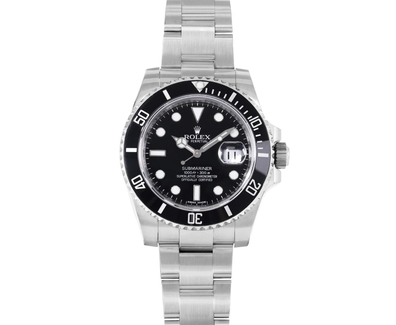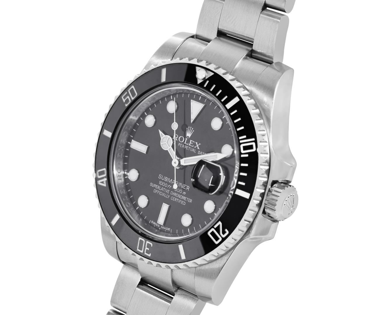 One Mens Pre Owned Ceramic Rolex Submariner With Date Polished, Serviced And Electronically Tested, Rolex Stainless Steel Case: 40mm, Rolex Stainless Steel Crown, Rolex Bezel: Stainless Steel Rotatable Bezel With Black Ceramic Insert. Rolex Crystal: Sapphire With Magnified Date Window. Rolex Movement: Automatic Winding Movement Caliber 3135. Rolex Dial: Rolex Black Submariner Dial with Luminous Index Hour Markers. Date Window: 3 O'Clock Position Date Display, Model: Ceramic Submariner, Quickset, Condition: G-6 Extra Fine. Rolex Bracelet: Stainless Steel Oyster Band. Bright Polish & Satin Finish. 7.0 Inch Length, Adjustable. Standard Clasp, With Rolex Logo. This Watch Has Been Serviced And Polished It Is Free Of All Scratches And Dents.