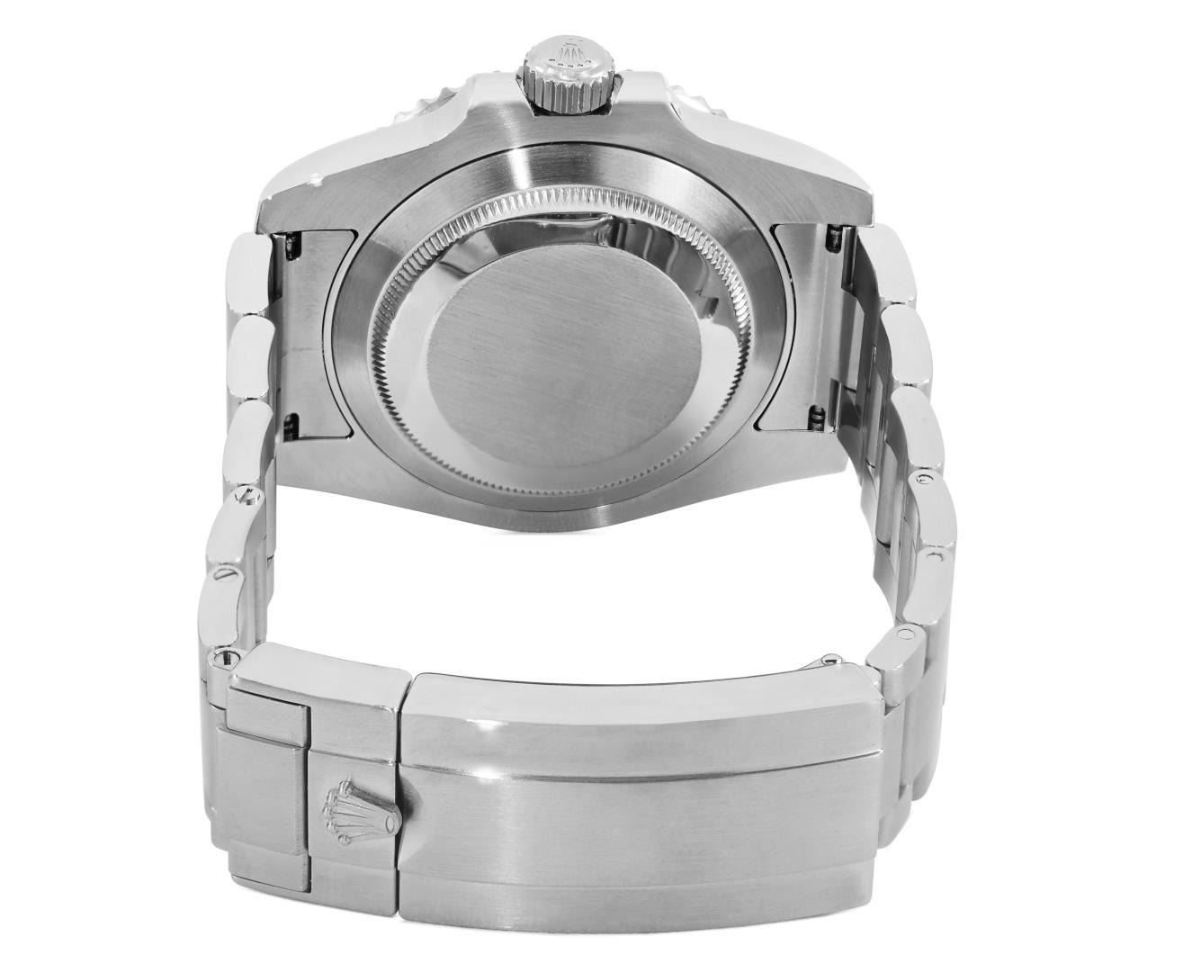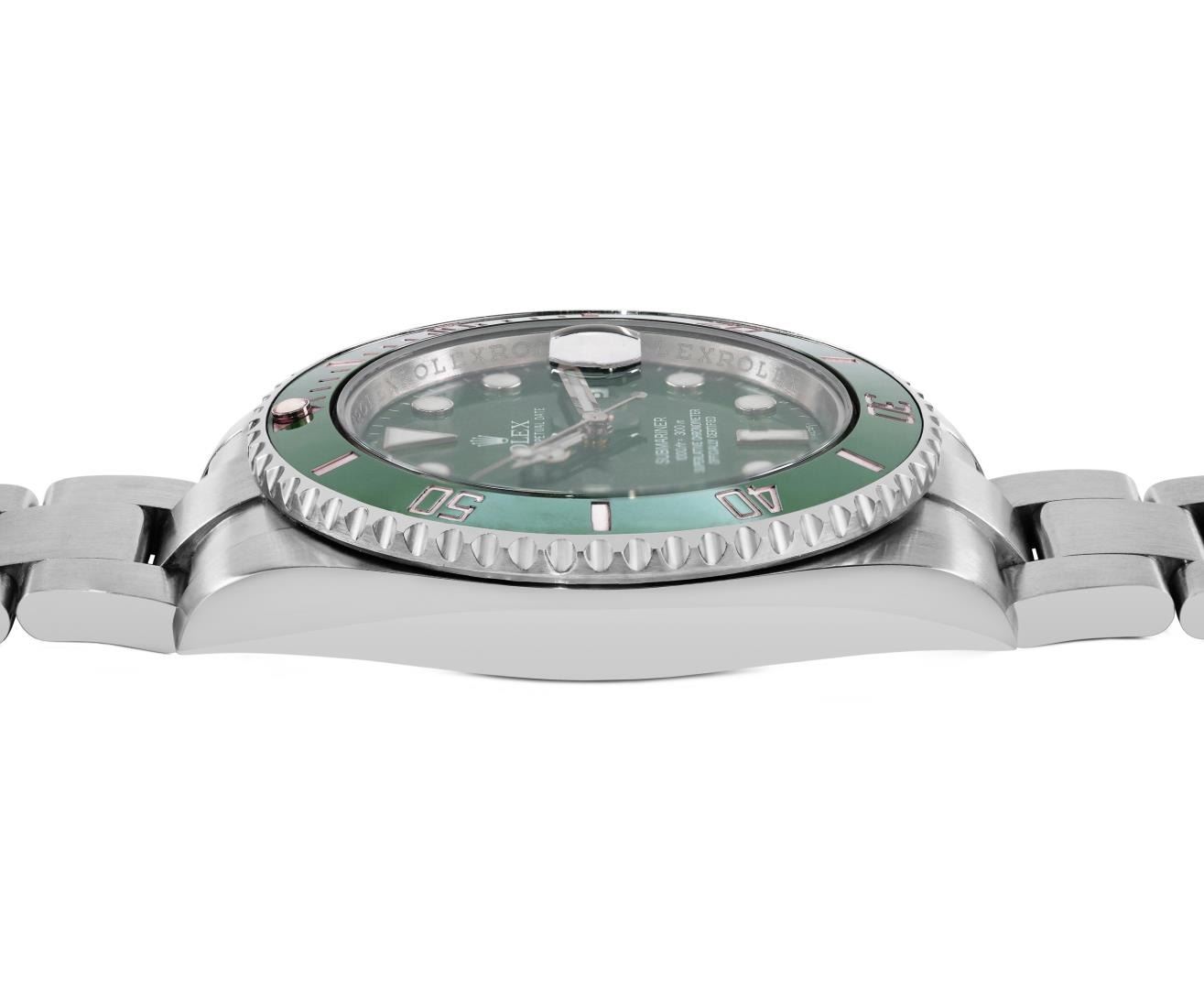 One Mens Pre Owned Rolex Stainless Steel Submariner With Date Polished, Serviced And Electronically Tested, Rolex Stainless Steel Case: 40mm, Rolex Stainless Steel Crown, Rolex Bezel: Stainless Steel Rotatable Bezel With Ceramic Green Insert. Crystal: Sapphire With Magnified Date Window. Rolex Movement: Automatic Winding Movement Caliber 3135. Rolex Dial: Green Submariner Dial with Luminous Index Hour Markers And Dash Track. Date Window: 3 O'Clock Position Date Display, Model: Date Submariner, Quickset, Condition: G-6 Extra Fine. Rolex Bracelet: Stainless Steel Oyster Band. Bright Polish And Satin Finish. 7.0 Inch Length, Adjustable. Standard Clasp, With Rolex Logo.