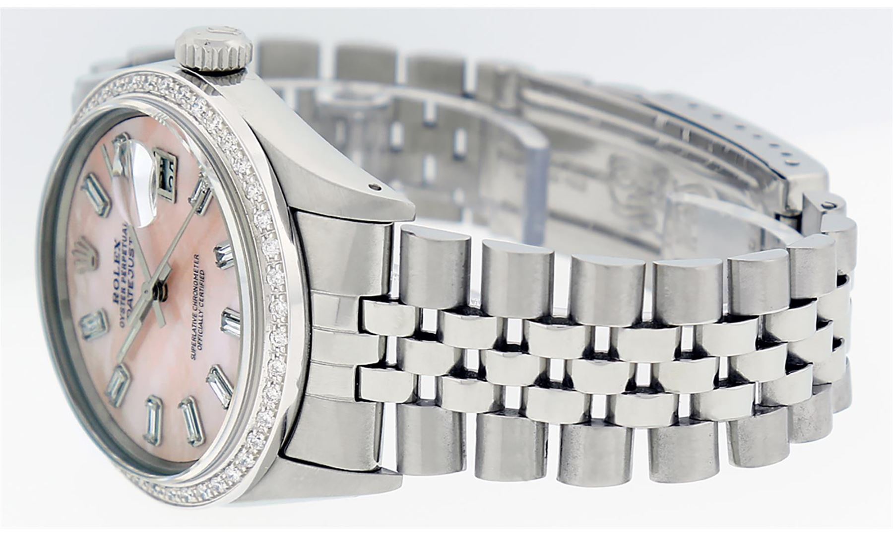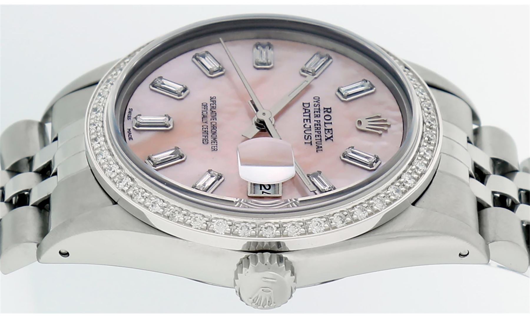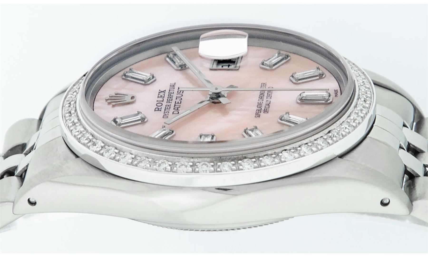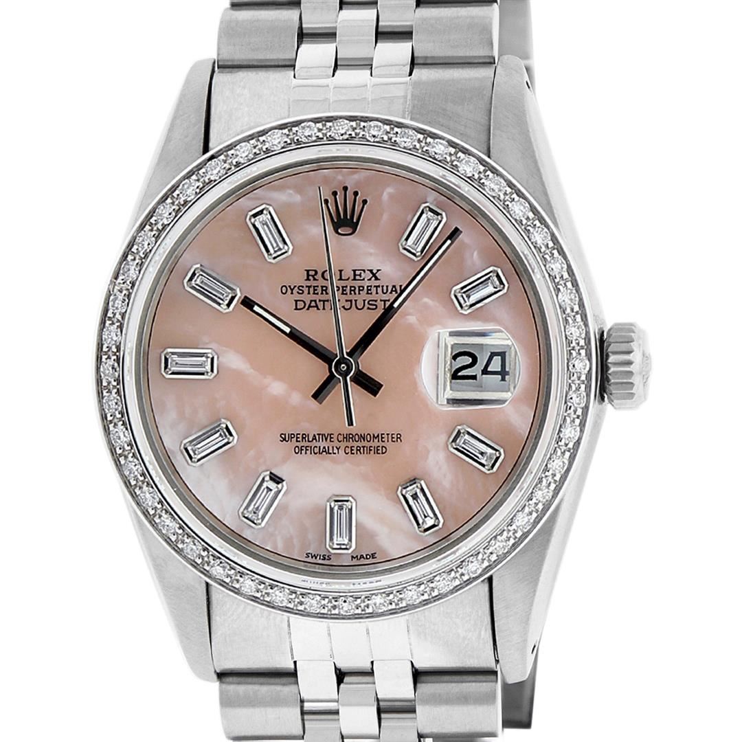 One Mens Stainless Steel Rolex Datejust Polished, Serviced & Electronically Tested, Stainless Steel Case: 36mm, Stainless Steel Crown, New Custom Bezel: 18K White Gold Beadset Diamond Bezel, Diamond Count: 44 Diamonds. Total Weight 1.00 Carat, Clarity: SI-VS, Color: G to H. Custom Crystal: New Scratch Resistant Synthetic Sapphire Cyclops Lens. Custom Hands: New Luminescent Hands. Movement: Automatic Winding Movement Caliber 3035. Custom Dial: Light Pink Mother Of Pearl With Baguette Diamond Hour Markers, Stone Count: 10 Diamond Baguettes In Dial. G To H In Color, Clarity: SI-VS. Date Window: 3 O'Clock Position Date Display, Quickset, Model: Datejust. Condition: G-6 Extra Fine. Bracelet: Stainless Steel Jubilee. Bright Polish & Satin Finish. 7.0 Inch Length, Adjustable. Standard Clasp, With Rolex Logo. This Watch Has Been Serviced Time Tested And Is In Excellent Condition It Is Free Of All Scratches And Dents.