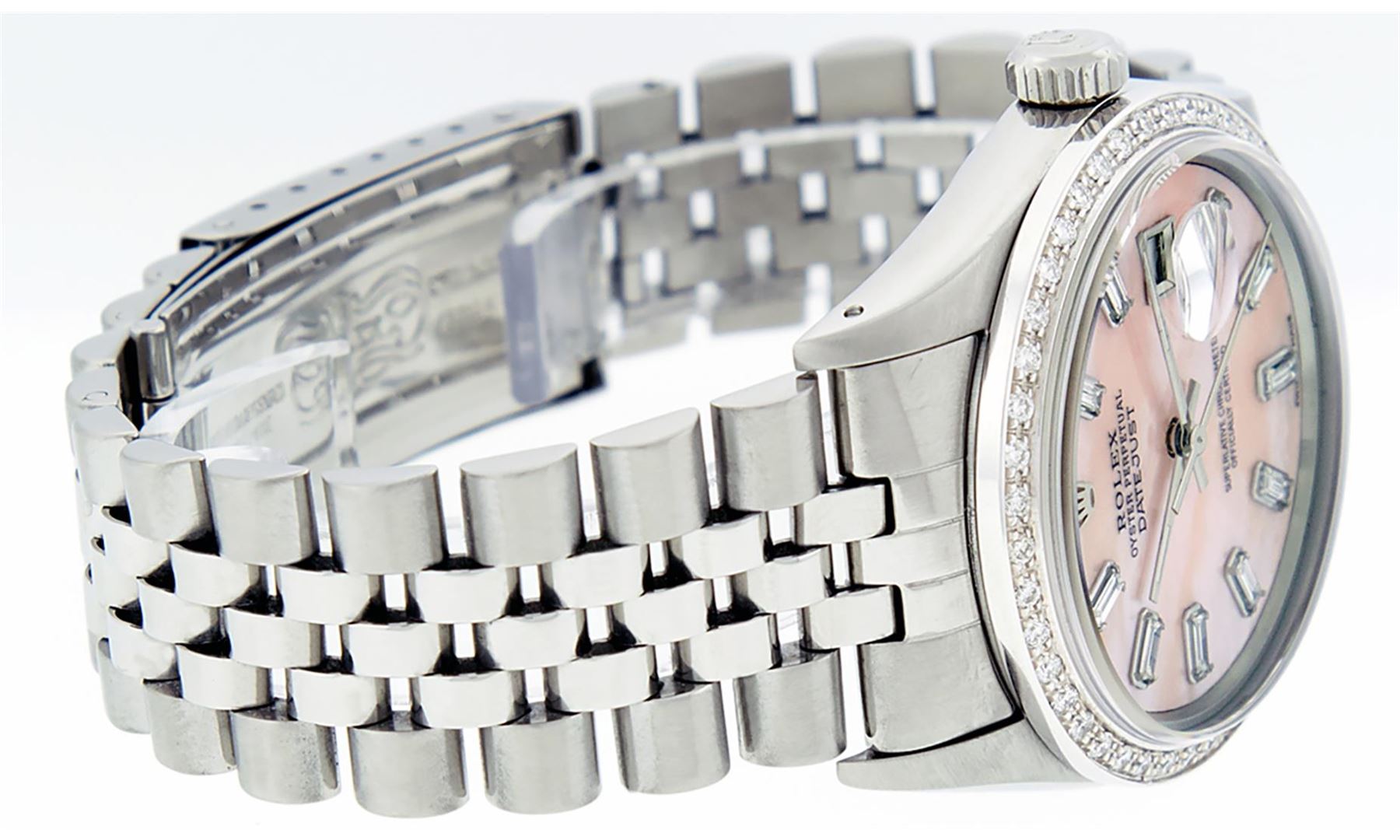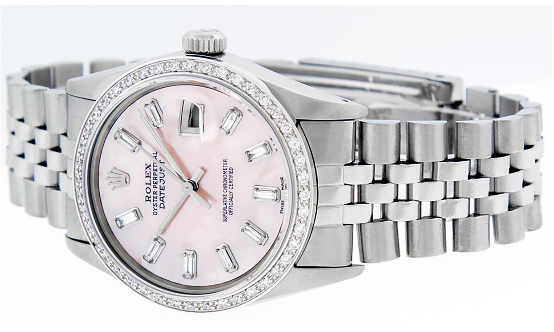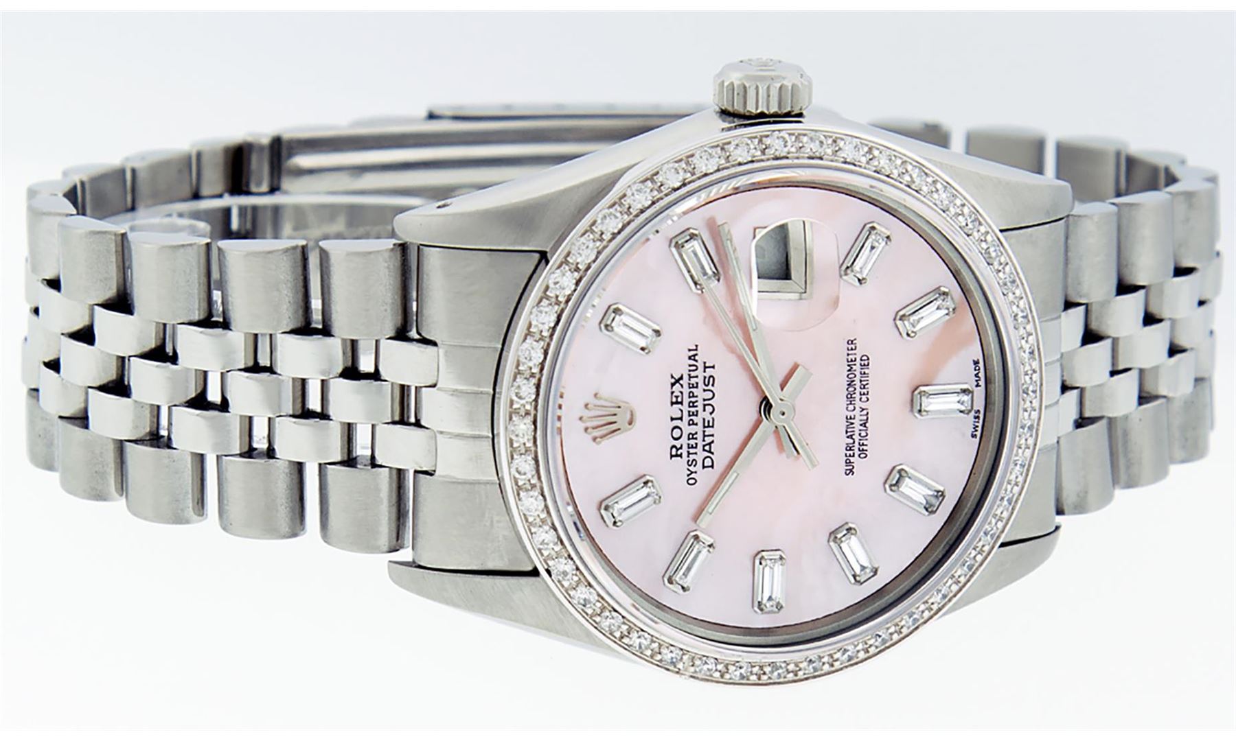 One Mens Stainless Steel Rolex Datejust Polished, Serviced & Electronically Tested, Stainless Steel Case: 36mm, Stainless Steel Crown, New Custom Bezel: 18K White Gold Beadset Diamond Bezel, Diamond Count: 44 Diamonds. Total Weight 1.00 Carat, Clarity: SI-VS, Color: G to H. Custom Crystal: New Scratch Resistant Synthetic Sapphire Cyclops Lens. Custom Hands: New Luminescent Hands. Movement: Automatic Winding Movement Caliber 3035. Custom Dial: Light Pink Mother Of Pearl With Baguette Diamond Hour Markers, Stone Count: 10 Diamond Baguettes In Dial. G To H In Color, Clarity: SI-VS. Date Window: 3 O'Clock Position Date Display, Quickset, Model: Datejust. Condition: G-6 Extra Fine. Bracelet: Stainless Steel Jubilee. Bright Polish & Satin Finish. 7.0 Inch Length, Adjustable. Standard Clasp, With Rolex Logo. This Watch Has Been Serviced Time Tested And Is In Excellent Condition It Is Free Of All Scratches And Dents.