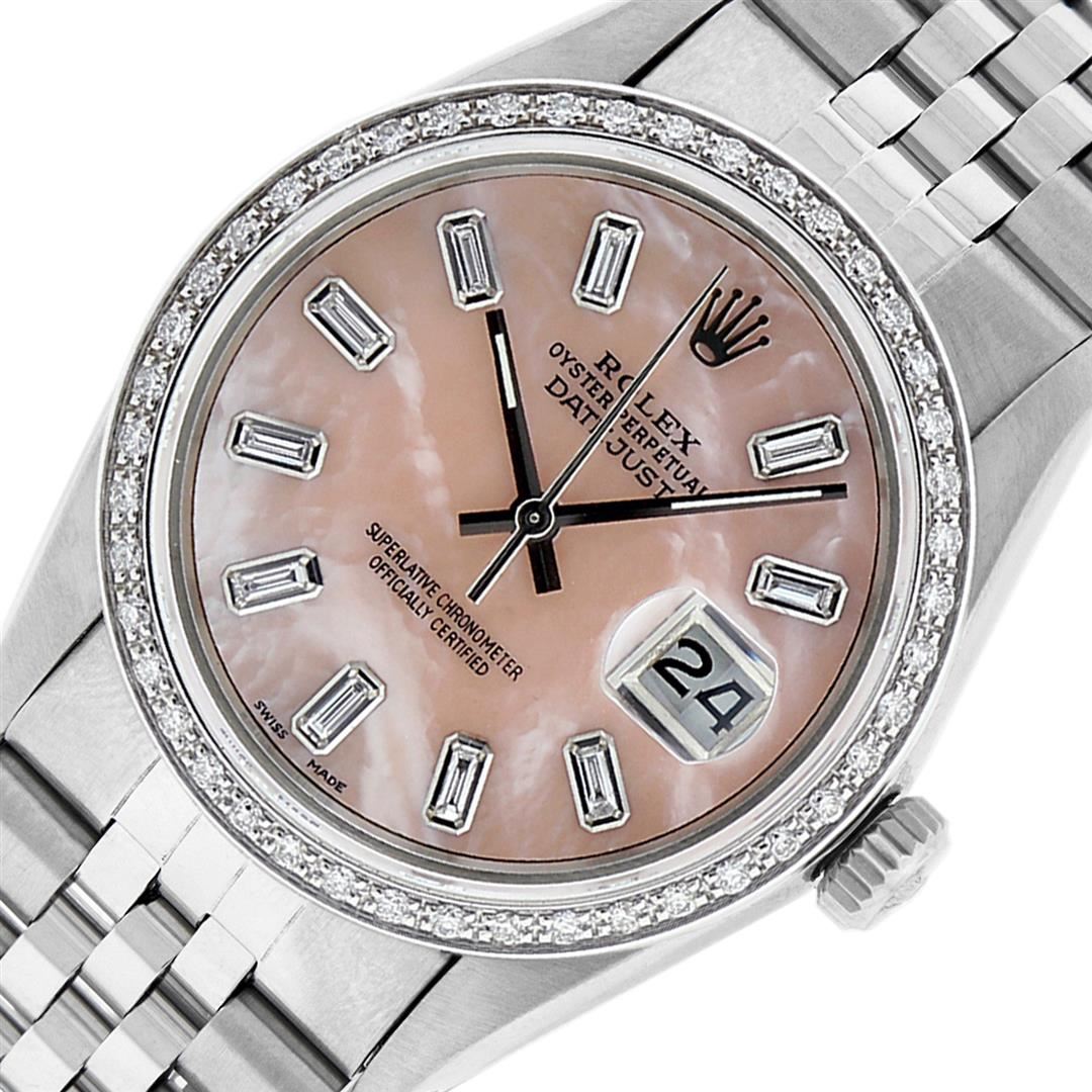 One Mens Stainless Steel Rolex Datejust Polished, Serviced & Electronically Tested, Stainless Steel Case: 36mm, Stainless Steel Crown, New Custom Bezel: 18K White Gold Beadset Diamond Bezel, Diamond Count: 44 Diamonds. Total Weight 1.00 Carat, Clarity: SI-VS, Color: G to H. Custom Crystal: New Scratch Resistant Synthetic Sapphire Cyclops Lens. Custom Hands: New Luminescent Hands. Movement: Automatic Winding Movement. Custom Dial: Light Pink Mother Of Pearl With Baguette Diamond Hour Markers, Stone Count: 10 Diamond Baguettes In Dial. G To H In Color, Clarity: SI-VS. Date Window: 3 O'Clock Position Date Display, Quickset, Model: Datejust. Condition: G-6 Extra Fine. Bracelet: Stainless Steel Jubilee. Bright Polish & Satin Finish. 7.0 Inch Length, Adjustable. Standard Clasp, With Rolex Logo. This Watch Has Been Serviced Time Tested And Is In Excellent Condition It Is Free Of All Scratches And Dents.