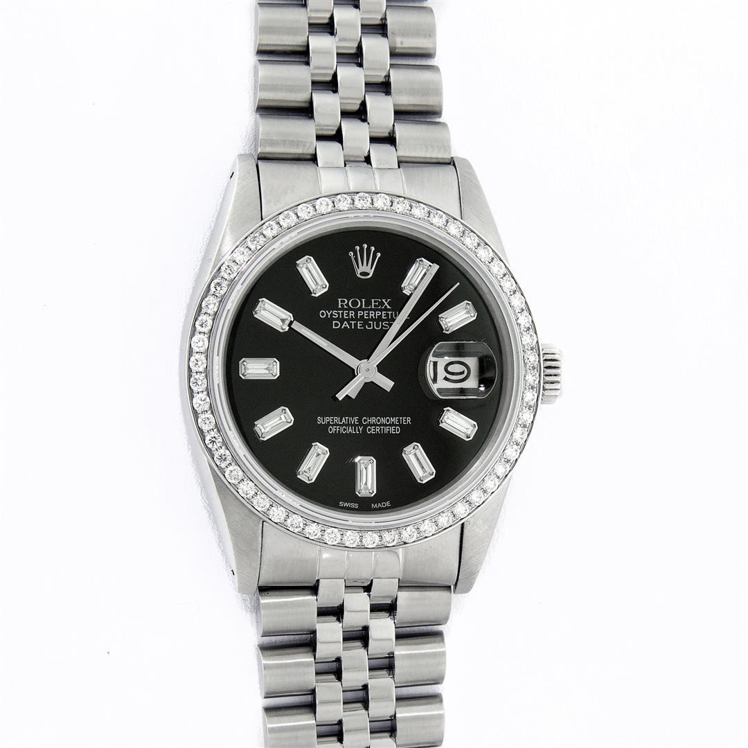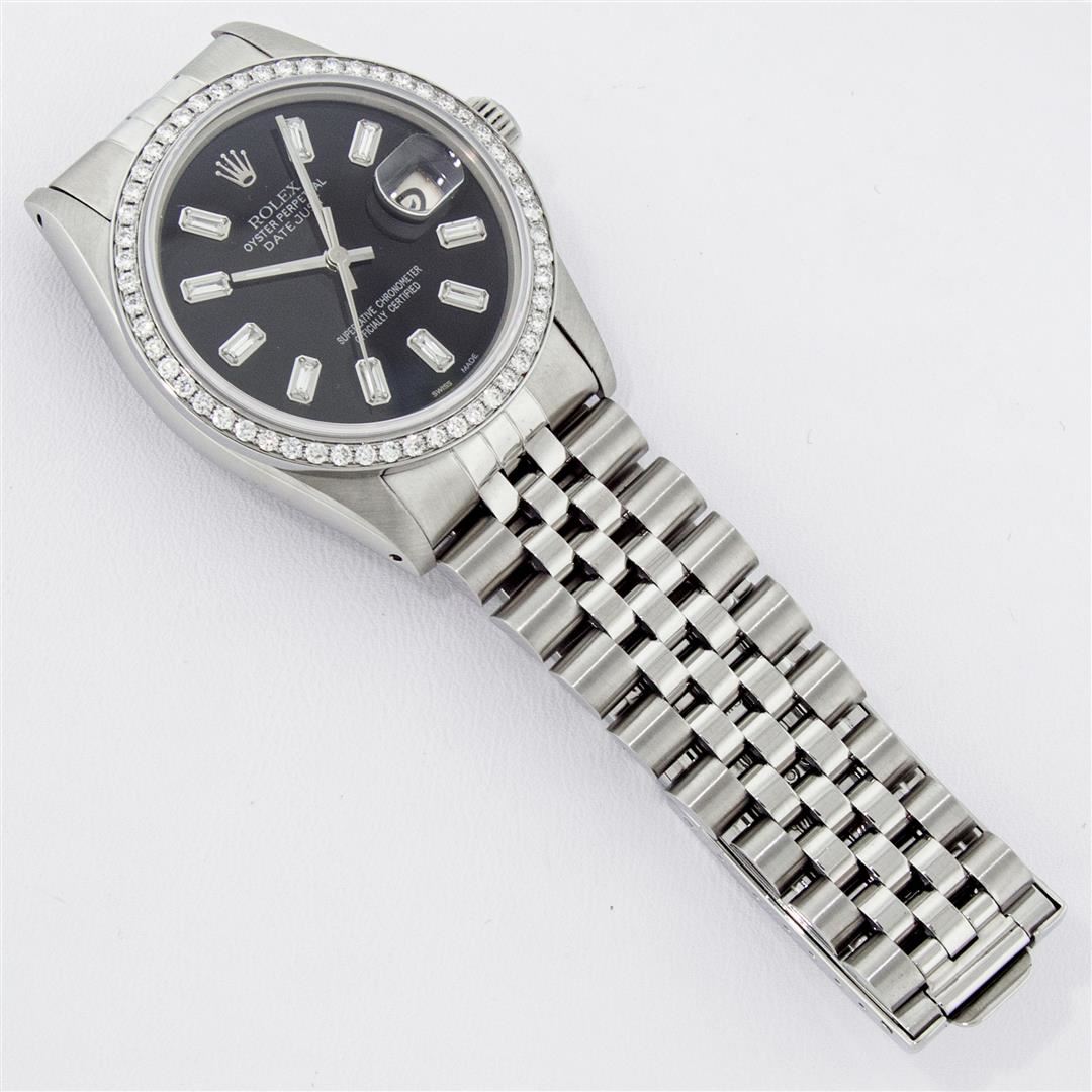 One Mens Rolex Stainless Steel Datejust Polished Bright with Satin Finish, This Watch Has Been Serviced & Electronically Tested, Stainless Steel Case: 36mm, Stainless Steel Crown, Custom Bezel: New Stainless Steel Beadset Diamond Bezel, Diamond Count: 54 Diamonds In Bezel, Total Weight 1.00 Carat, Clarity: SI-VS, Color: G to H. Custom Crystal: New Scratch Resistant Synthetic Sapphire Cyclops Lens. Custom Hands: New Luminescent Hands. Movement: Automatic Winding Movement Caliber 3035. Custom Dial: Black Baguette Diamond Dial, Diamond Count: 10 Baguette Diamonds On Dial, Color: G to H, Clarity: VS2-SI1. Date Window: 3 O'Clock Position Date Display, Quickset, Model: Datejust. Condition: G-6 Extra Fine. Bracelet: Stainless Steel Jubilee Band. Bright Polish & Satin Finish. 7.0 Inch Length, Adjustable. Standard Clasp, With Rolex Logo. This Watch Has Been Serviced Time Tested And Is In Excellent Condition It Is Free Of All Scratches And Dents. This Watch Comes With A Rolex Box.