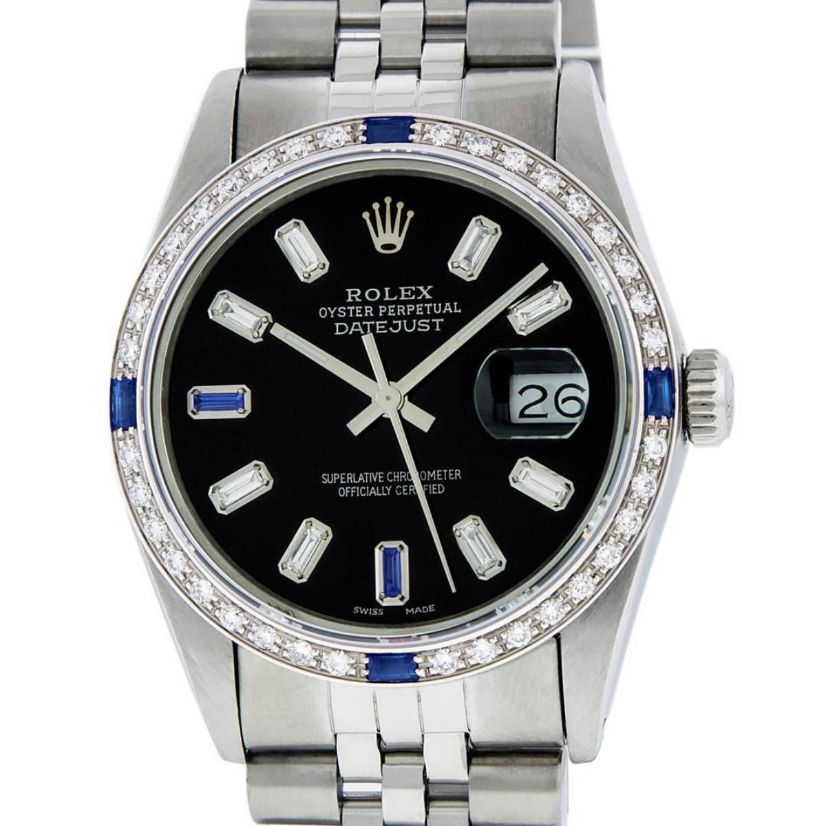 One Mens Stainless Steel Rolex Datejust Polished, Serviced & Electronically Tested, Stainless Steel Case: 36mm, Stainless Steel Crown, New Custom Bezel: 18K White Gold Sapphire Beadset Diamond Bezel, Diamond + Gem Count: 36 Diamonds + 4 Sapphires. Total Weight 1.00 Carat, Clarity: SI-VS, Color: G to H. Custom Crystal: New Synthetic Sapphire Cyclops Lens. Custom Hands: New Luminescent Hands. Movement: Automatic Winding Movement Caliber 3035. Custom Dial: Black Baguette + 2 Synthetic Sapphire Baguette Diamond Hour Markers, Stone Count: 8 Diamonds + 2 Synthetic Sapphire Baguettes. G To H In Color, Clarity: SI-VS. Date Window: 3 O'Clock Position Date Display, Quickset, Model: Datejust. Condition: G-6 Extra Fine. Bracelet: Stainless Steel Jubilee. Bright Polish & Satin Finish. 7.0 Inch Length, Adjustable. Standard Clasp, With Rolex Logo. This Watch Has Been Serviced Time Tested And Is In Excellent Condition It Is Free Of All Scratches And Dents.