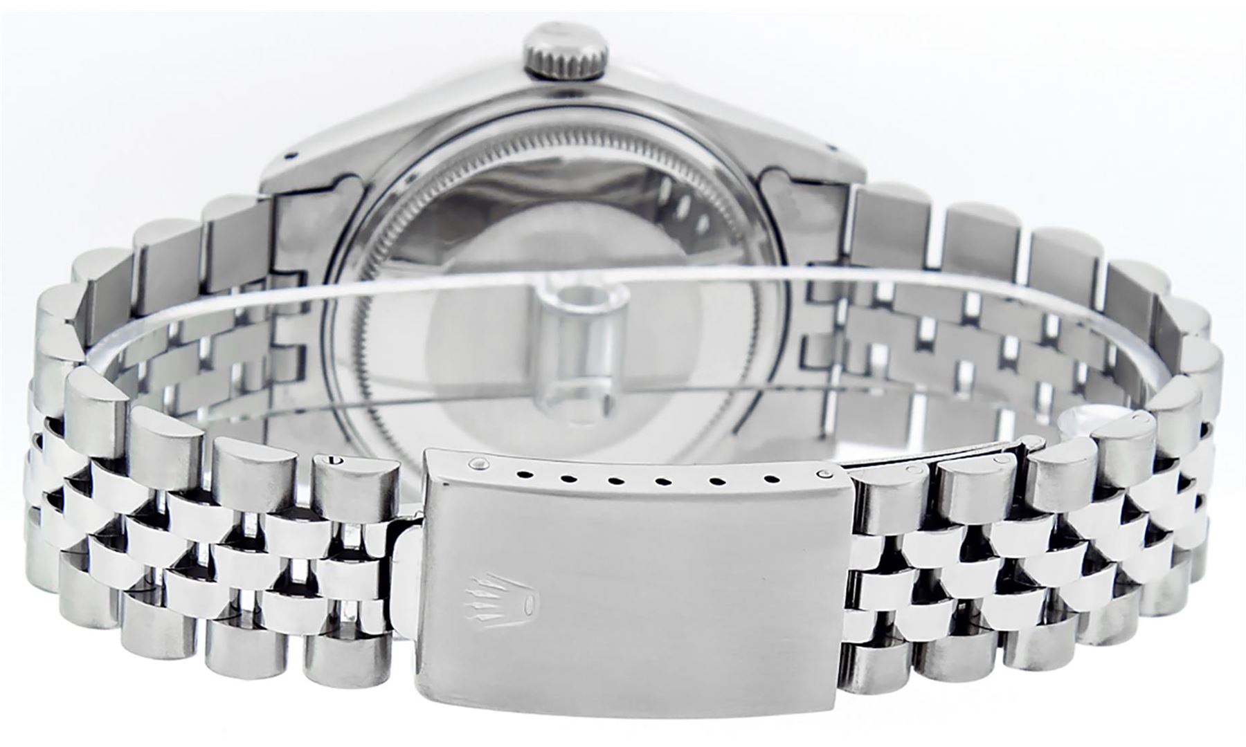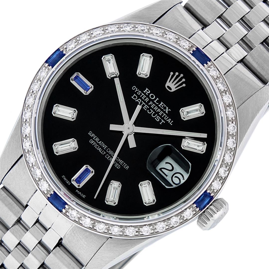 One Mens Stainless Steel Rolex Datejust Polished, Serviced & Electronically Tested, Stainless Steel Case: 36mm, Stainless Steel Crown, New Custom Bezel: 18K White Gold Sapphire Beadset Diamond Bezel, Diamond + Gem Count: 36 Diamonds + 4 Sapphires. Total Weight 1.00 Carat, Clarity: SI-VS, Color: G to H. Custom Crystal: New Synthetic Sapphire Cyclops Lens. Custom Hands: New Luminescent Hands. Movement: Automatic Winding Movement. Custom Dial: Black Baguette + 2 Synthetic Sapphire Baguette Diamond Hour Markers, Stone Count: 8 Diamonds + 2 Synthetic Sapphire Baguettes. G To H In Color, Clarity: SI-VS. Date Window: 3 O'Clock Position Date Display, Quickset, Model: Datejust. Condition: G-6 Extra Fine. Bracelet: Stainless Steel Jubilee. Bright Polish & Satin Finish. 7.0 Inch Length, Adjustable. Standard Clasp, With Rolex Logo. This Watch Has Been Serviced Time Tested And Is In Excellent Condition It Is Free Of All Scratches And Dents.