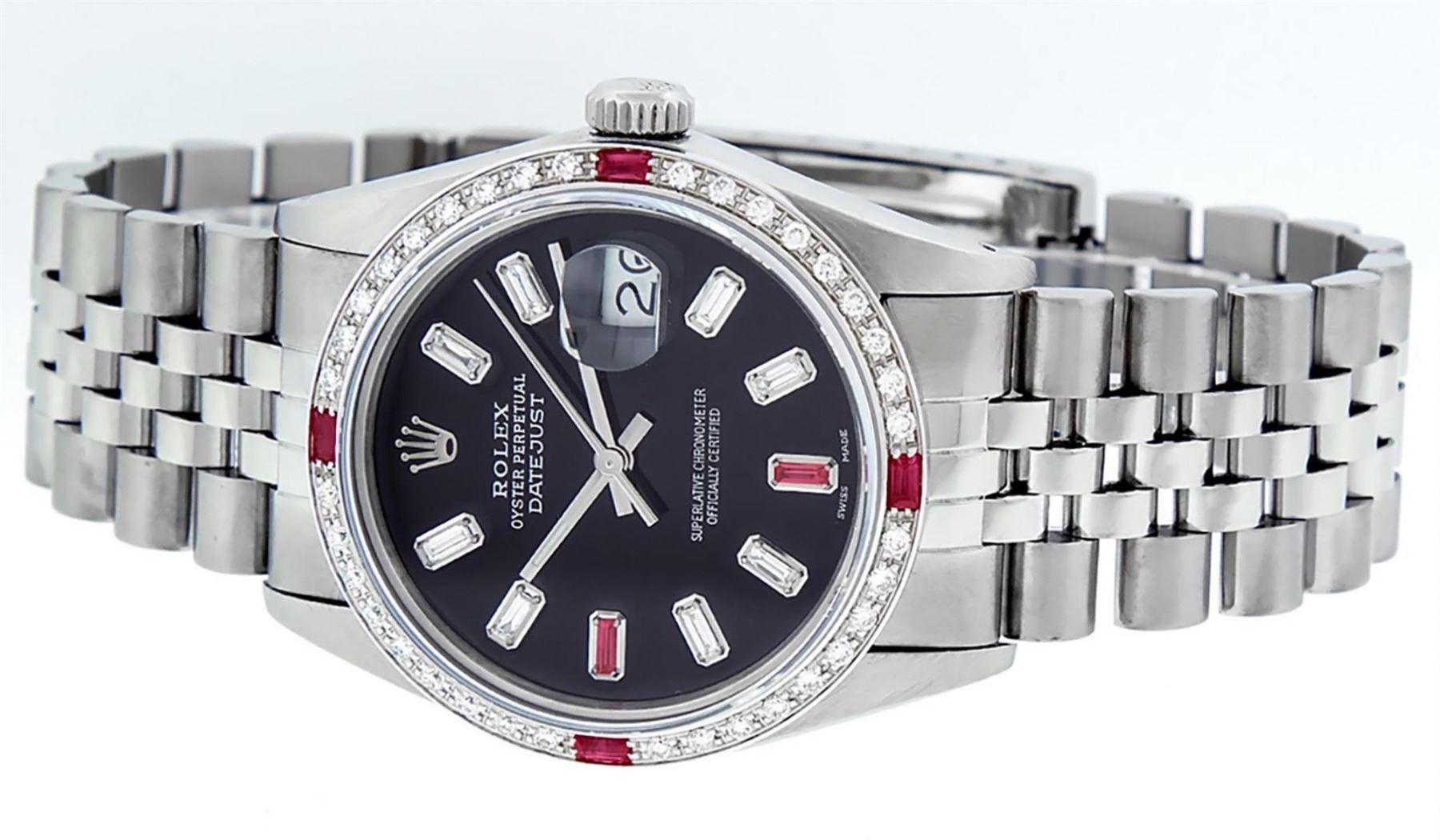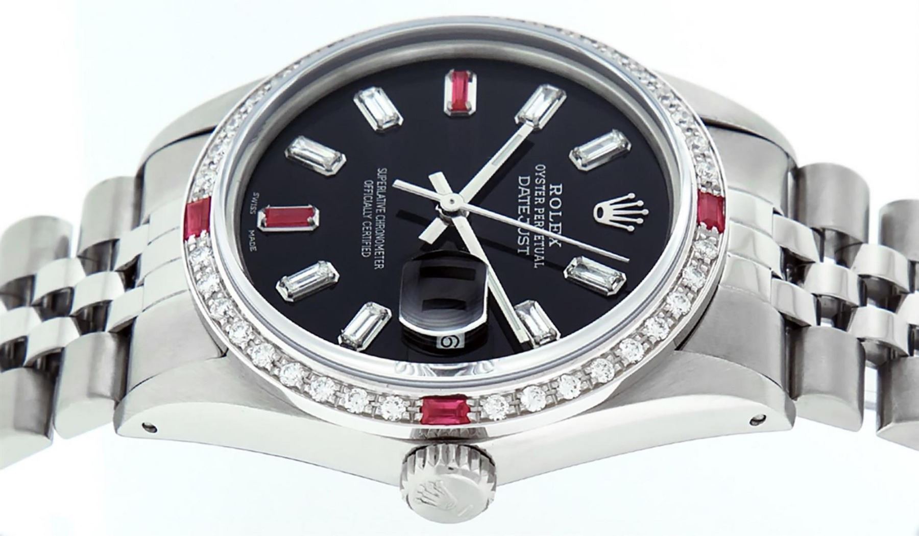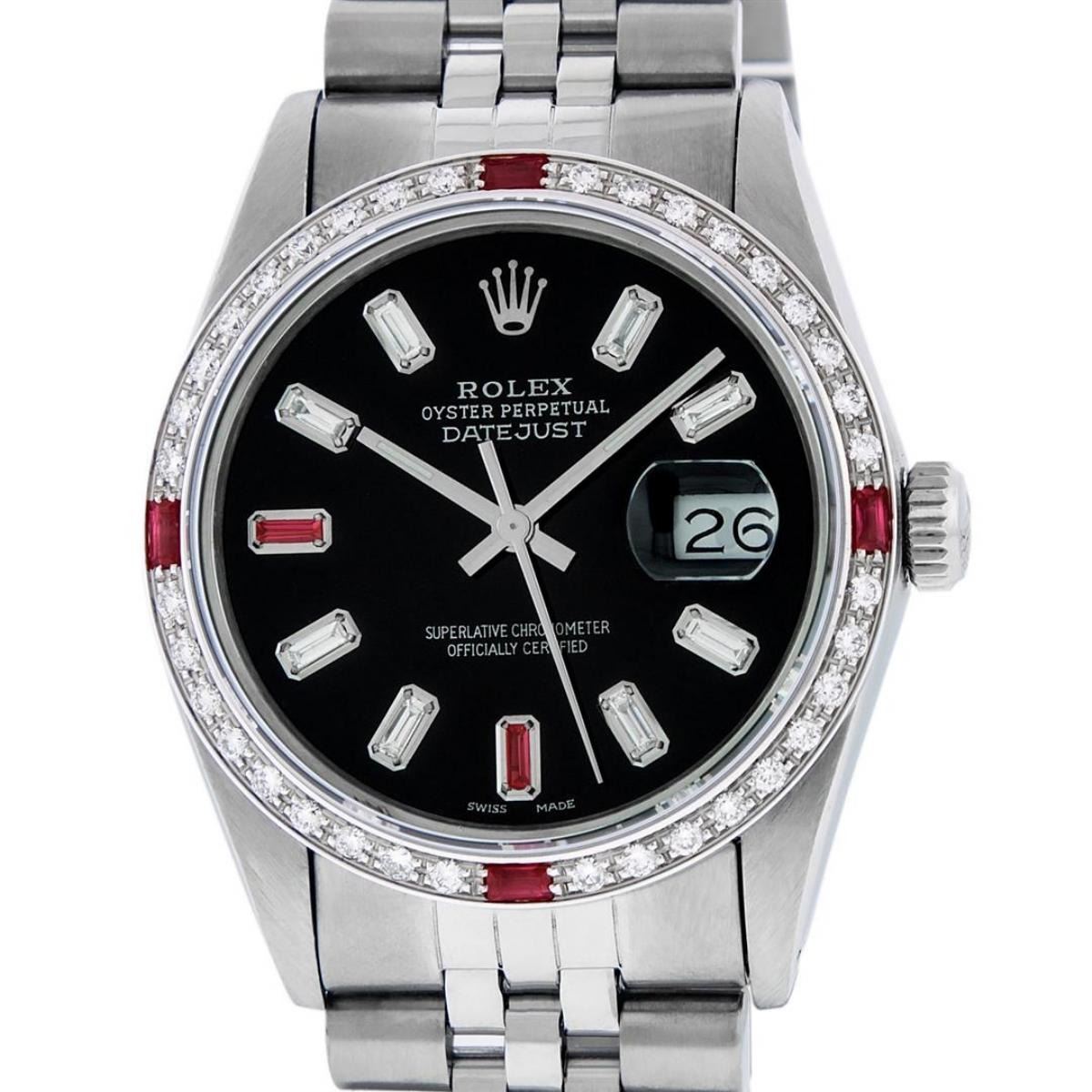 One Mens Rolex Stainless Steel Datejust Polished Bright with Satin Finish, This Watch Has Been Serviced & Electronically Tested, Stainless Steel Case: 36mm, Stainless Steel Crown, Custom Bezel: New 18K White Gold Ruby Beadset Diamond Bezel, Stone Count: 36 Diamonds + 4 Rubies In Bezel, Total Weight 1.00 Carat, Clarity: SI-VS, Color: G to H. Custom Crystal: New Scratch Resistant Synthetic Sapphire Cyclops Lens. Custom Hands: New Luminescent Hands. Movement: Automatic Winding Movement Caliber 3035. Custom Dial: Black Baguette Diamond + Ruby Dial, Stone Count: 8 Baguette Diamonds + 2 Synthetic Rubies On Dial, Color: G to H, Clarity: VS2-SI1. Date Window: 3 O'Clock Position Date Display, Quickset, Model: Datejust. Condition: G-6 Extra Fine. Bracelet: Stainless Steel Jubilee Band. Bright Polish & Satin Finish. 7.0 Inch Length, Adjustable. Standard Clasp, With Rolex Logo. This Watch Has Been Serviced Time Tested And Is In Excellent Condition It Is Free Of All Scratches And Dents.