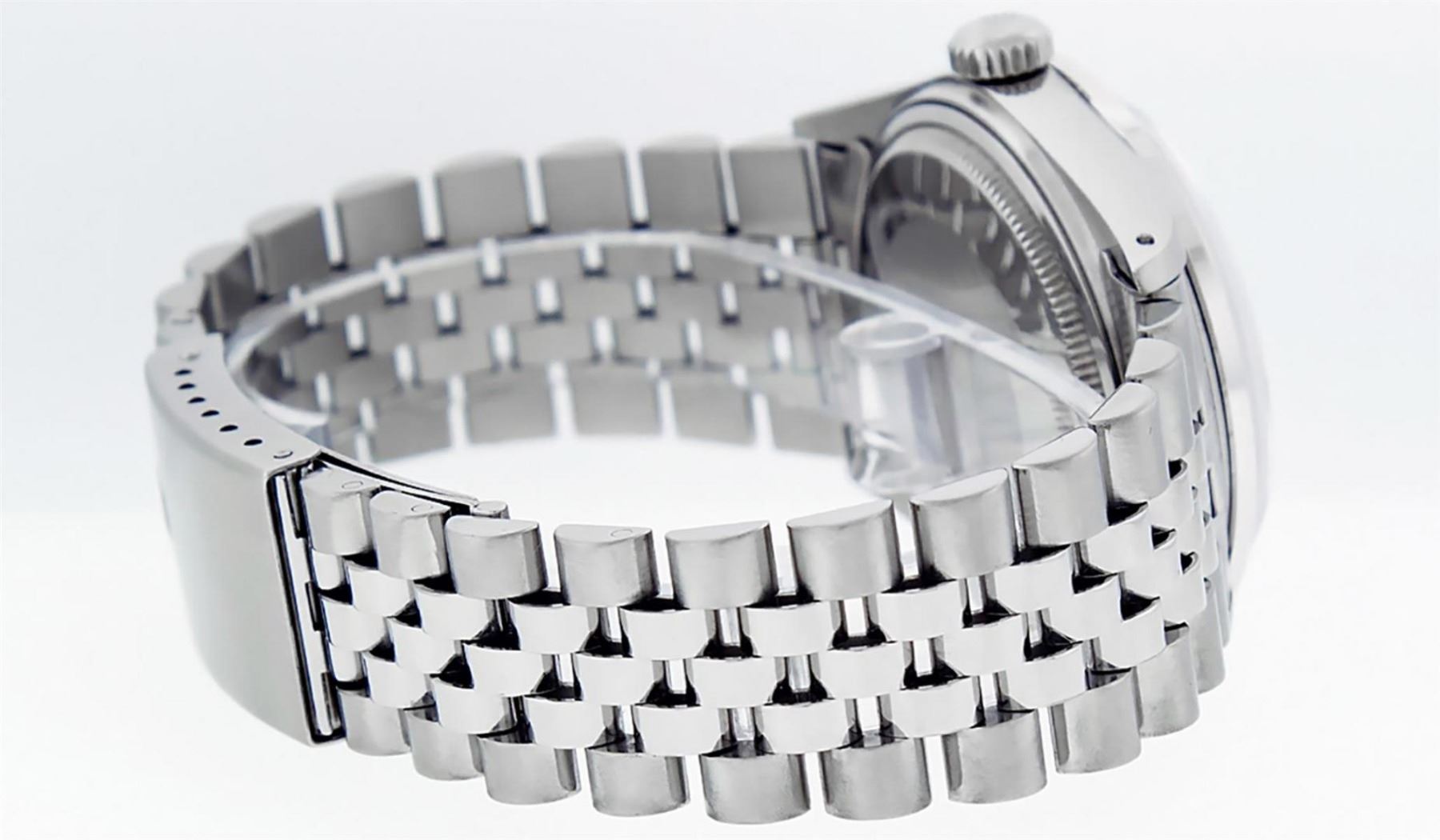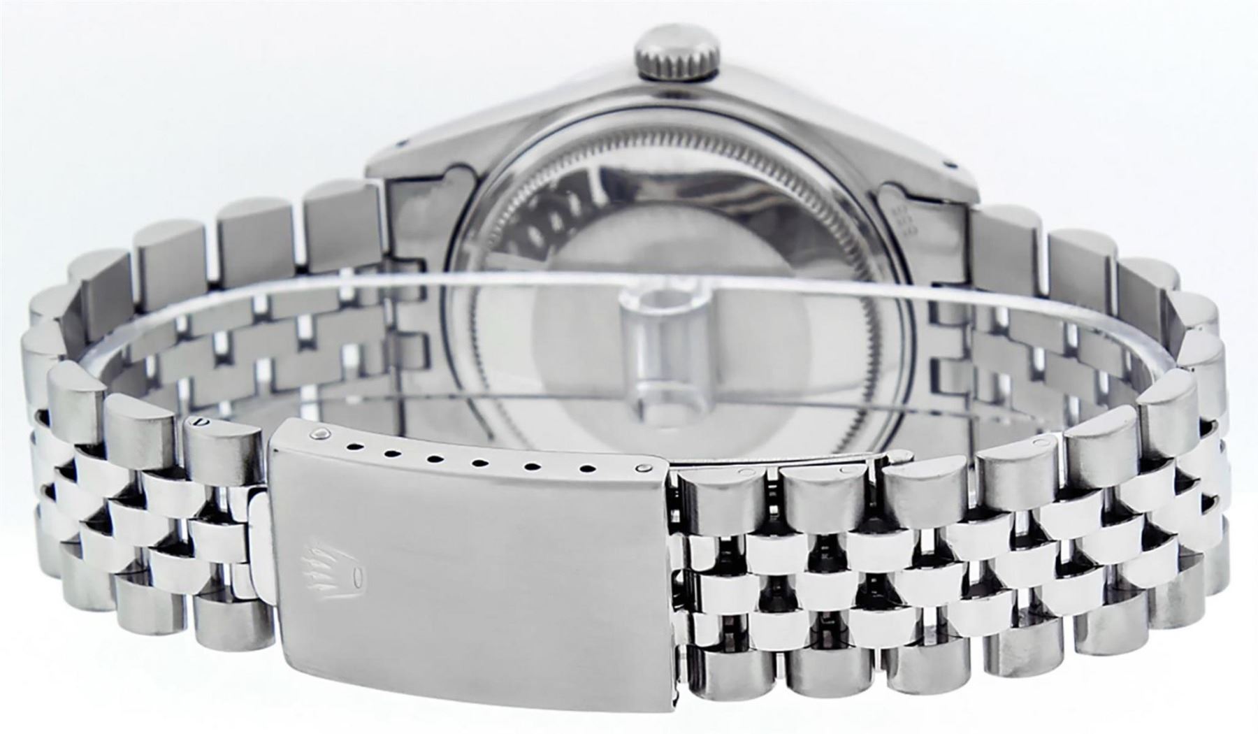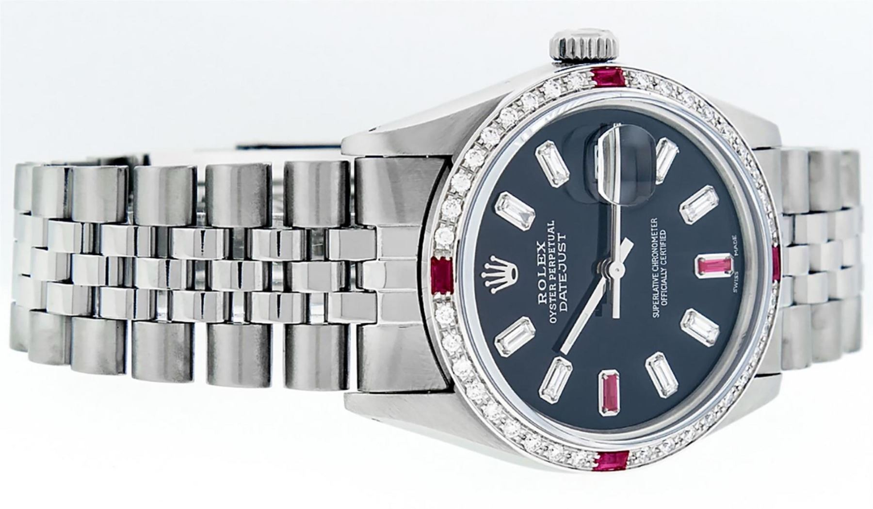 One Mens Rolex Stainless Steel Datejust Polished Bright with Satin Finish, This Watch Has Been Serviced & Electronically Tested, Stainless Steel Case: 36mm, Stainless Steel Crown, Custom Bezel: New 18K White Gold Ruby Beadset Diamond Bezel, Stone Count: 36 Diamonds + 4 Rubies In Bezel, Total Weight 1.00 Carat, Clarity: SI-VS, Color: G to H. Custom Crystal: New Scratch Resistant Synthetic Sapphire Cyclops Lens. Custom Hands: New Luminescent Hands. Movement: Automatic Winding Movement Caliber 3035. Custom Dial: Black Baguette Diamond + Ruby Dial, Stone Count: 8 Baguette Diamonds + 2 Synthetic Rubies On Dial, Color: G to H, Clarity: VS2-SI1. Date Window: 3 O'Clock Position Date Display, Quickset, Model: Datejust. Condition: G-6 Extra Fine. Bracelet: Stainless Steel Jubilee Band. Bright Polish & Satin Finish. 7.0 Inch Length, Adjustable. Standard Clasp, With Rolex Logo. This Watch Has Been Serviced Time Tested And Is In Excellent Condition It Is Free Of All Scratches And Dents.