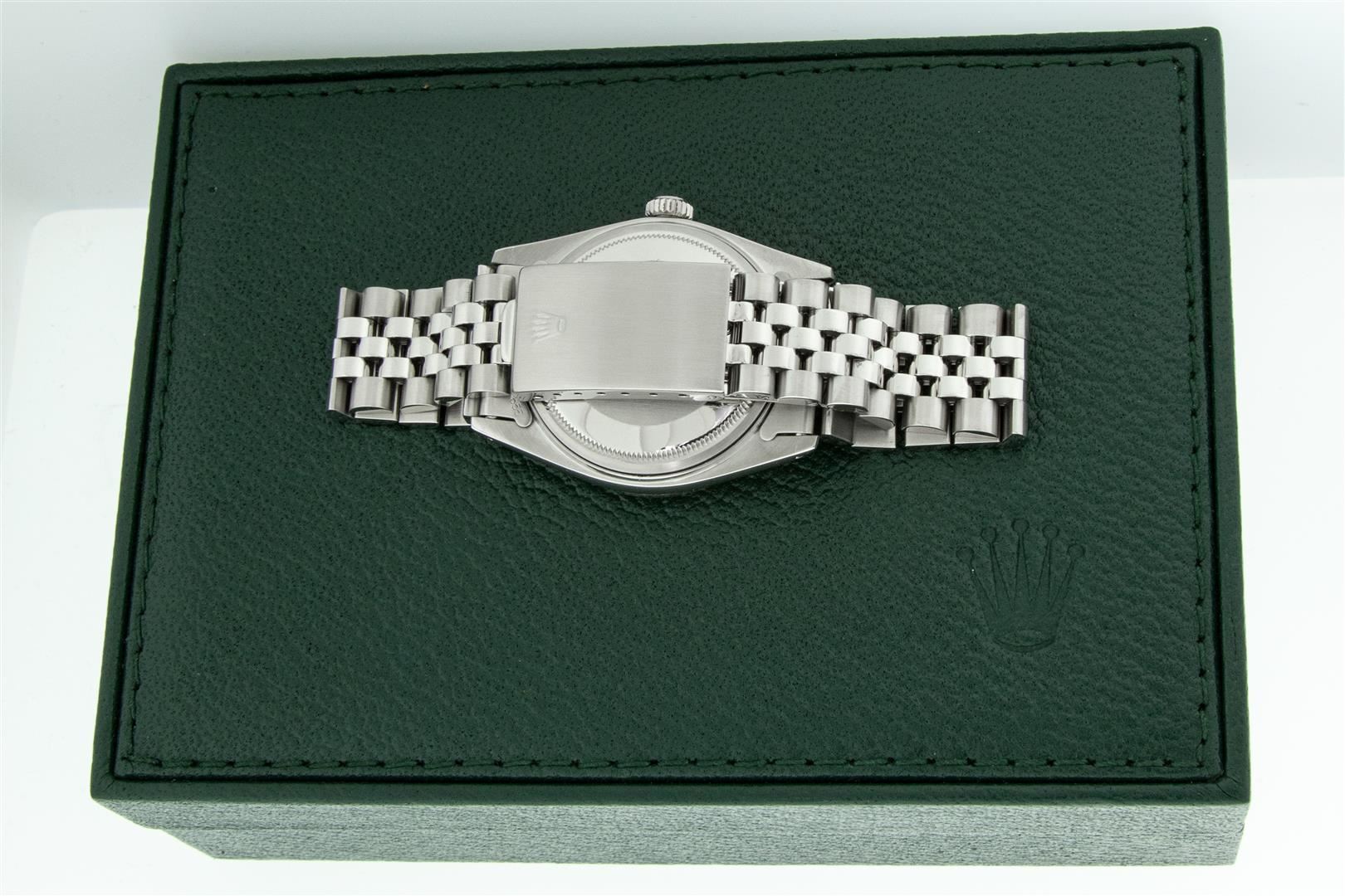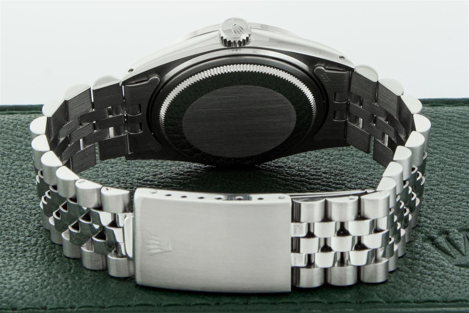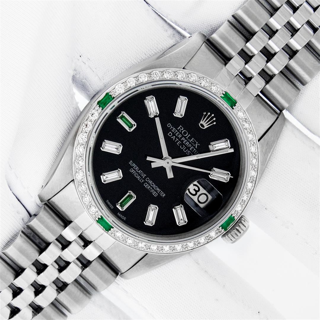 One Mens Rolex Stainless Steel Datejust Polished Bright with Satin Finish, This Watch Has Been Serviced & Electronically Tested, Stainless Steel Case: 36mm, Stainless Steel Crown, Custom Bezel: New 18K White Gold Emerald Beadset Diamond Bezel, Stone Count: 36 Diamonds + 4 Emeralds In Bezel, Total Weight 1.00 Carat, Clarity: SI-VS, Color: G to H. Custom Crystal: New Scratch Resistant Synthetic Sapphire Cyclops Lens. Custom Hands: New Luminescent Hands. Movement: Automatic Winding Movement. Custom Dial: Black Baguette Diamond + Synthetic Dial, Stone Count: 8 Baguette Diamonds + 2 Synthetic Emeralds On Dial, Color: G to H, Clarity: VS2-SI1. Date Window: 3 O'Clock Position Date Display, Quickset, Model: Datejust. Condition: G-6 Extra Fine. Bracelet: Stainless Steel Jubilee Band. Bright Polish & Satin Finish. 7.0 Inch Length, Adjustable. Standard Clasp, With Rolex Logo. This Watch Has Been Serviced Time Tested And Is In Excellent Condition It Is Free Of All Scratches And Dents.
