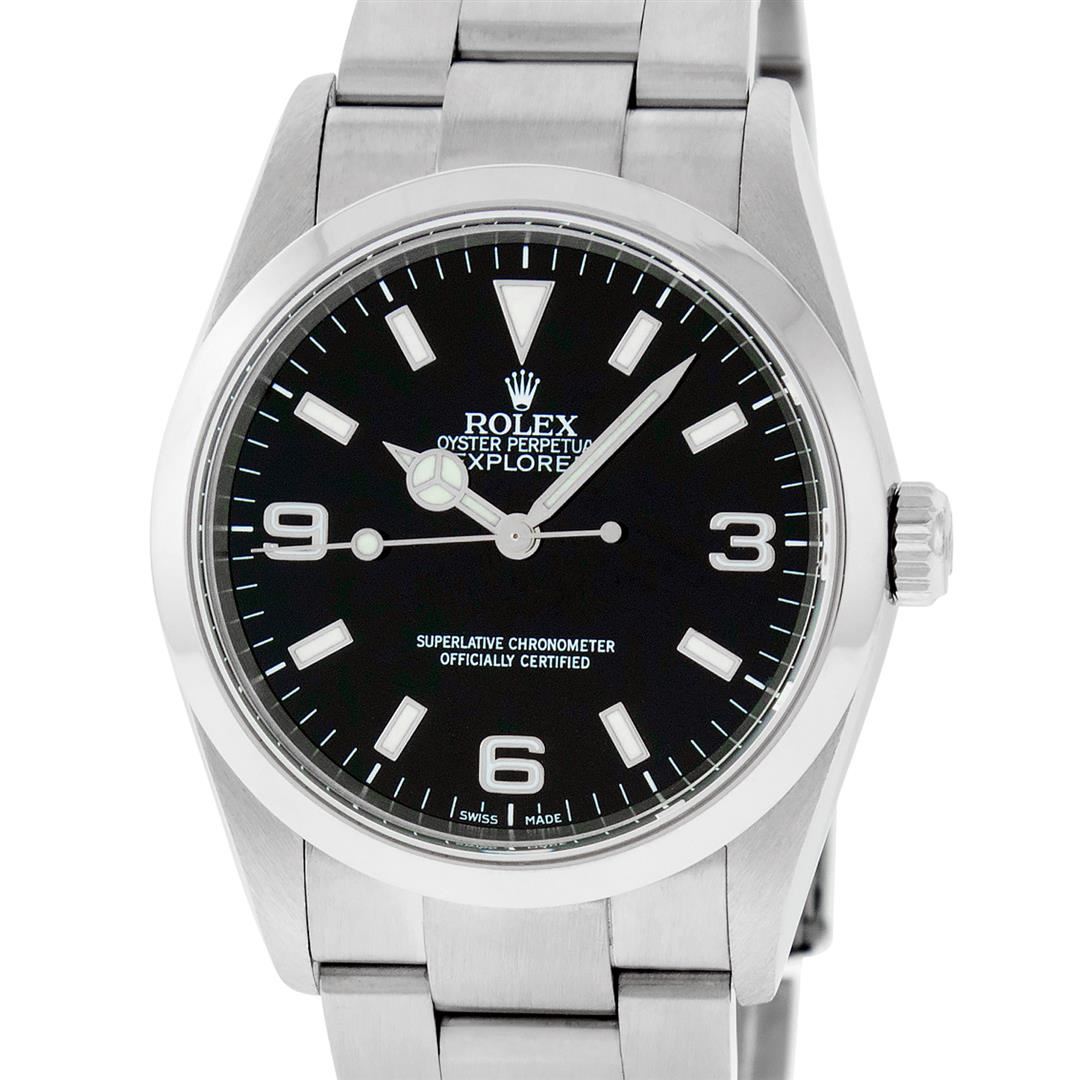One Mens Pre Owned Rolex Stainless Steel Explorer Polished, Serviced & Electronically Tested, Rolex Stainless Steel Case: 36mm, Rolex Stainless Steel Crown, Rolex Bezel: Rolex Stainless Steel Smooth Domed Bezel. Rolex Crystal: Sapphire With Magnified Date Window. Rolex Movement: Automatic Winding Movement Caliber 3130. Rolex Dial: Rolex Black Dial With Raised Arabic Numerals. Date Window: 3 O'Clock Position Date Display, Model: Explorer, Condition: G-6 Extra Fine. Rolex Bracelet: Rolex Stainless Steel Oyster Bracelet, Bright Polish & Satin Finish. 7 Inch Length, Adjustable. Flip Lock Clasp with Rolex Logo. This Watch Has Been Serviced Time Tested And Is In Excellent Condition It Is Free Of All Scratches And Dents.