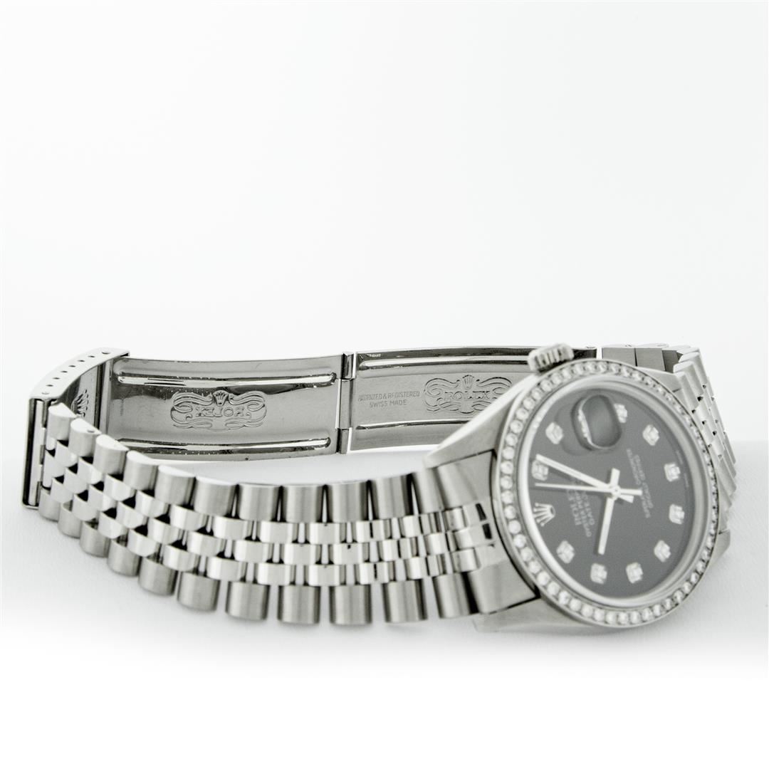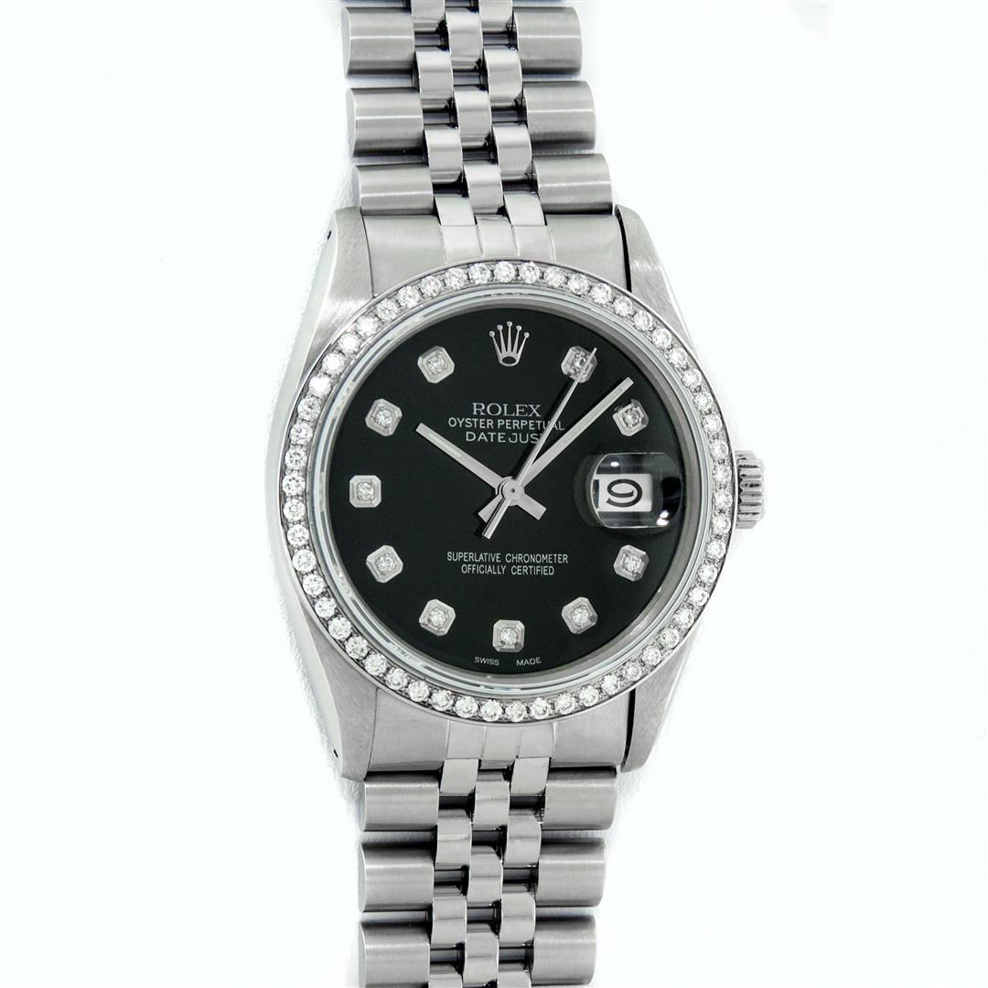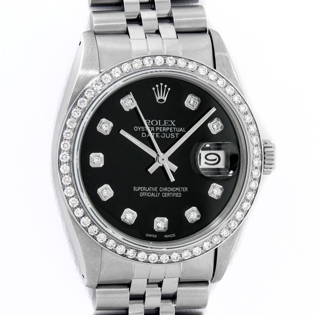 One Mens Rolex Stainless Steel Datejust Polished Bright with Satin Finish, This Watch Has Been Serviced & Electronically Tested, Stainless Steel Case: 36mm, Stainless Steel Crown, Custom Bezel: New Stainless Steel Beadset Diamond Bezel, Diamond Count: 54 Diamonds In Bezel, Total Weight 1.00 Carat, Clarity: SI-VS, Color: G to H. Custom Crystal: New Synthetic Sapphire Cyclops Lens. Custom Hands: New Luminescent Hands. Movement: Automatic Winding Movement Caliber 3035. Custom Dial: Black Diamond Dial, Diamond Count: 10 Diamonds In Dial, Color: G to H, Clarity: VS2-SI1. Date Window: 3 O'Clock Position Date Display, Quickset, Model: Datejust. Condition: G-6 Extra Fine. Bracelet: Stainless Steel Jubilee Band. Bright Polish & Satin Finish. 7.0 Inch Length, Adjustable. Standard Clasp, With Rolex Logo. This Watch Has Been Serviced Time Tested And Is In Excellent Condition It Is Free Of All Scratches And Dents. This Watch Comes With A Rolex Box And Appraisal.
