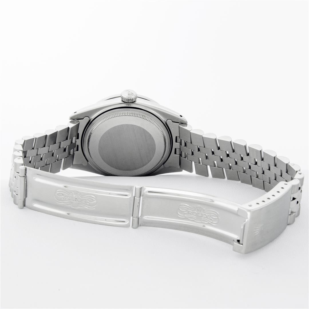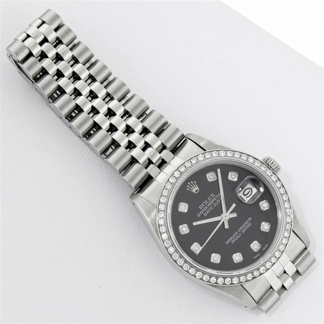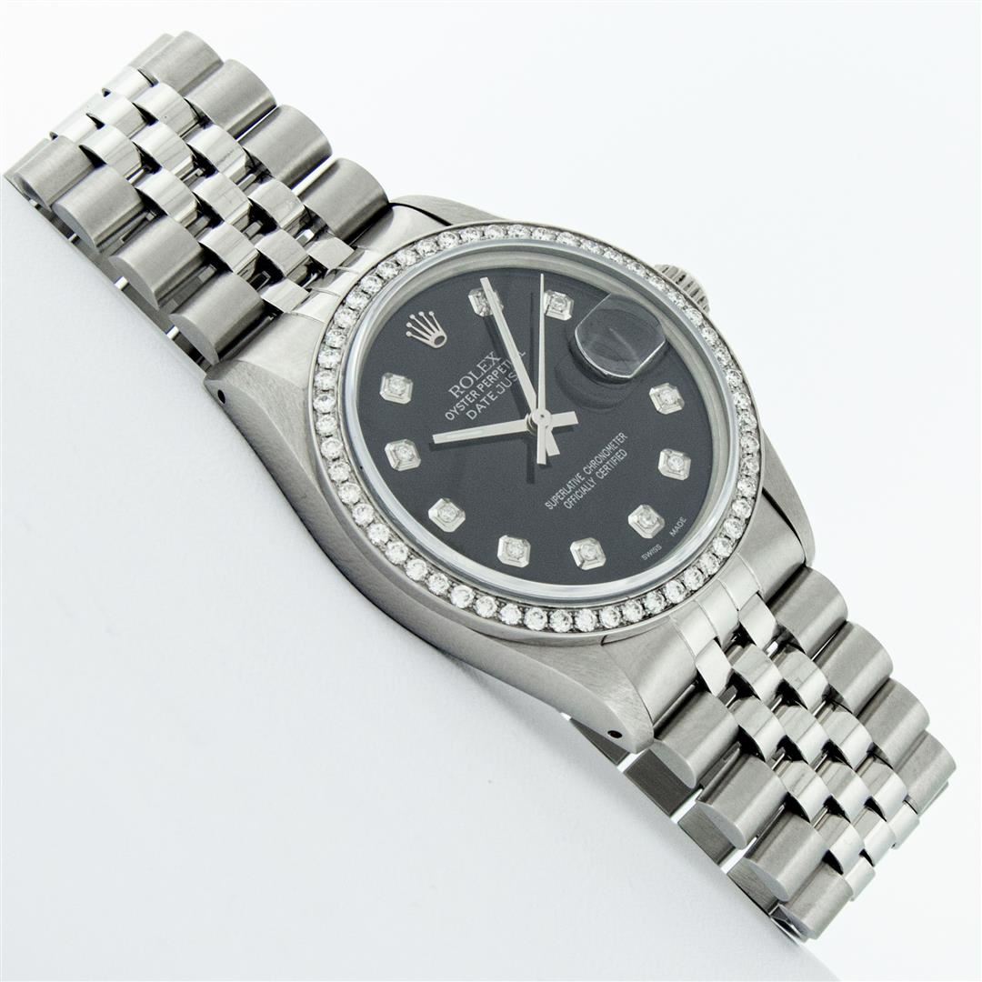 One Mens Rolex Stainless Steel Datejust Polished Bright with Satin Finish, This Watch Has Been Serviced & Electronically Tested, Stainless Steel Case: 36mm, Stainless Steel Crown, Custom Bezel: New Stainless Steel Beadset Diamond Bezel, Diamond Count: 54 Diamonds In Bezel, Total Weight 1.00 Carat, Clarity: SI-VS, Color: G to H. Custom Crystal: New Synthetic Sapphire Cyclops Lens. Custom Hands: New Luminescent Hands. Movement: Automatic Winding Movement Caliber 3035. Custom Dial: Black Diamond Dial, Diamond Count: 10 Diamonds In Dial, Color: G to H, Clarity: VS2-SI1. Date Window: 3 O'Clock Position Date Display, Quickset, Model: Datejust. Condition: G-6 Extra Fine. Bracelet: Stainless Steel Jubilee Band. Bright Polish & Satin Finish. 7.0 Inch Length, Adjustable. Standard Clasp, With Rolex Logo. This Watch Has Been Serviced Time Tested And Is In Excellent Condition It Is Free Of All Scratches And Dents. This Watch Comes With A Rolex Box And Appraisal.