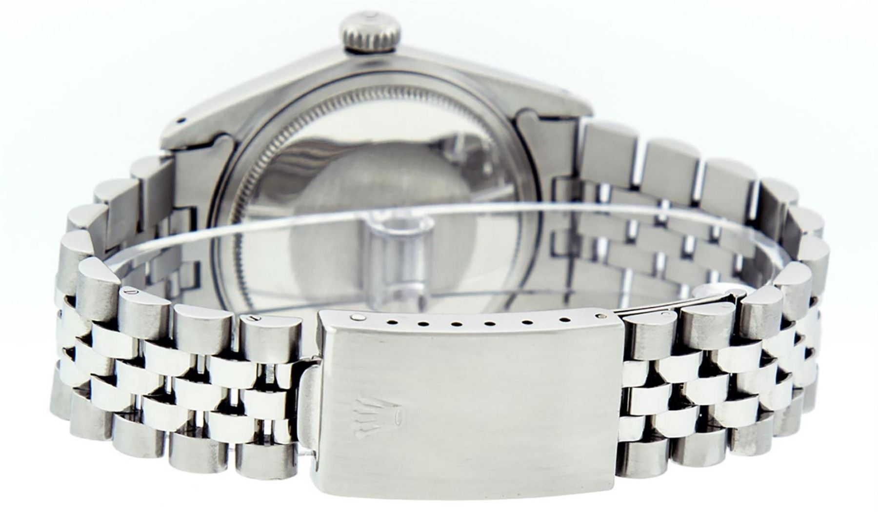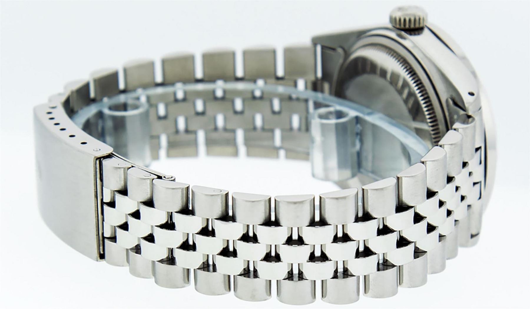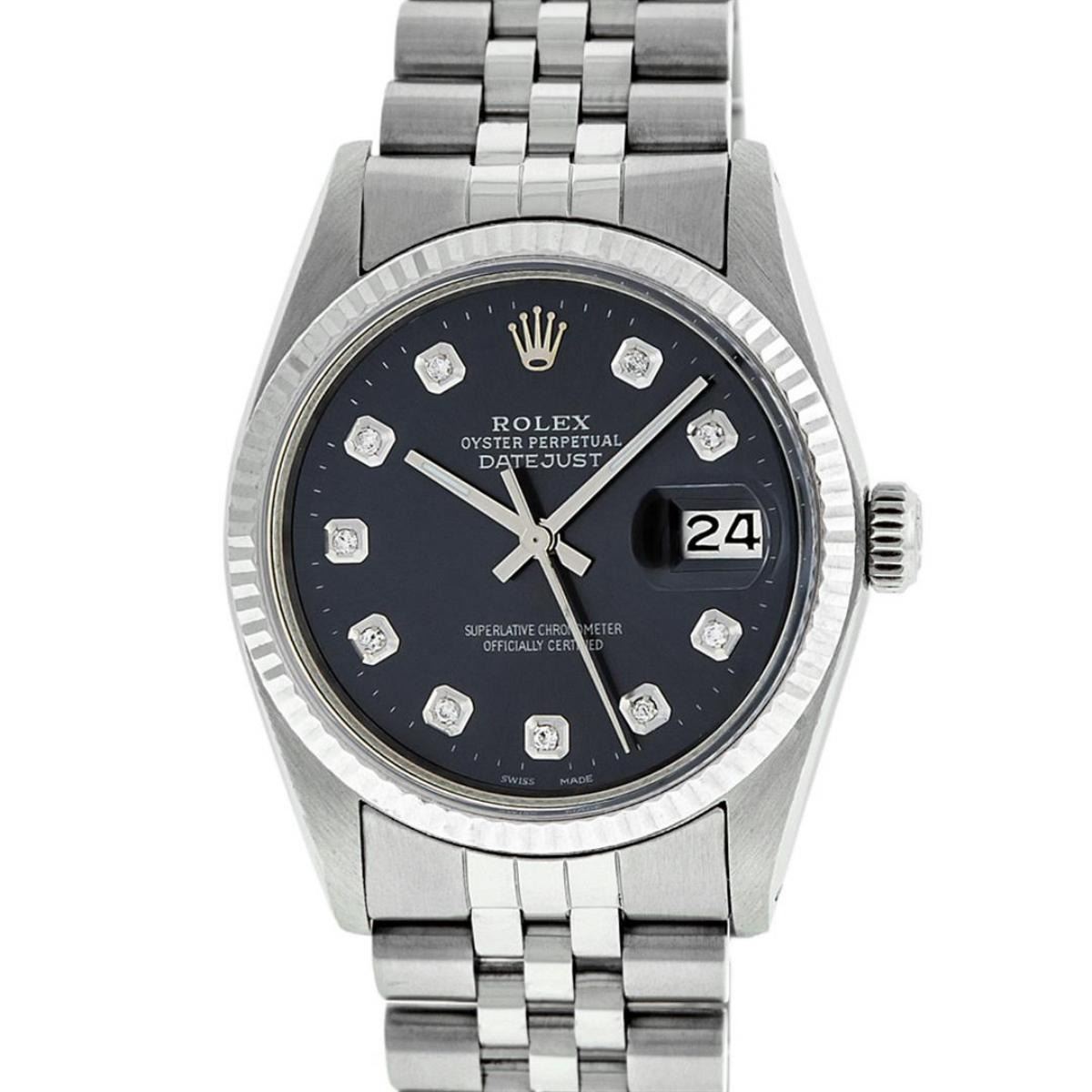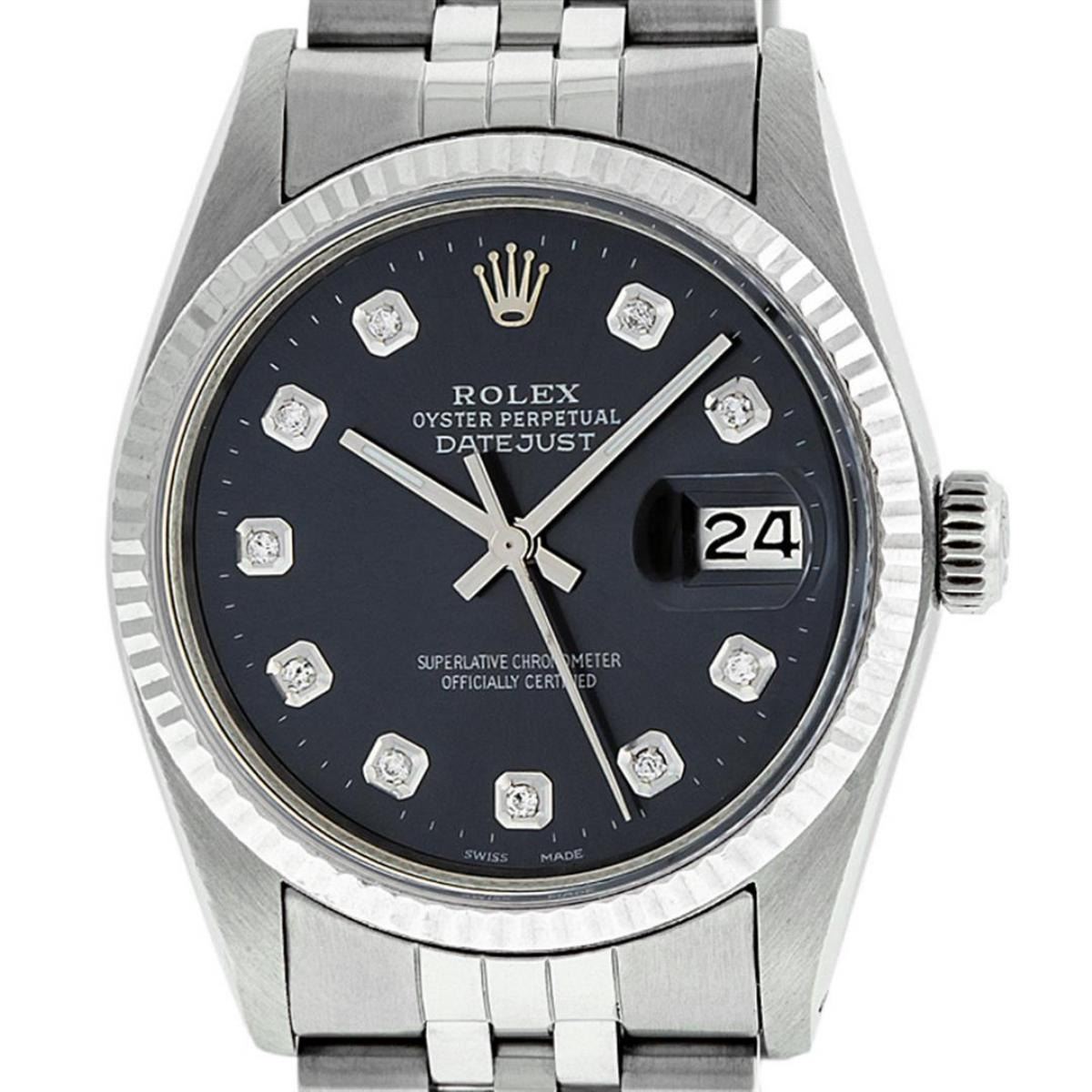 One Mens Stainless Steel Rolex Datejust Polished Bright with Satin Finish, This Watch Has Been Serviced & Electronically Tested, Stainless Steel Case: 36mm, Stainless Steel Crown, Bezel: 14K White Gold Fluted Bezel. Custom Crystal: New Acrylic Cyclops Lens. Custom Hands: New Luminescent Hands. Movement: Automatic Winding Movement Caliber 3035. Custom Dial: Black Diamond Dial With Diamond Hour Markers, Diamond Count: 10 Diamonds in Dial G To H In Color, SI-VS Clarity. Date Window: 3 O'Clock Position Date Display, Quickset, Model: Datejust, Condition: G-6 Extra Fine. Bracelet: Stainless Steel Jubilee. Bright Polish & Satin Finish. 7.0 Inch Length, Adjustable. Standard Clasp, With Rolex Logo. This Watch Has Been Serviced Time Tested And Is In Excellent Condition It Is Free Of All Scratches And Dents