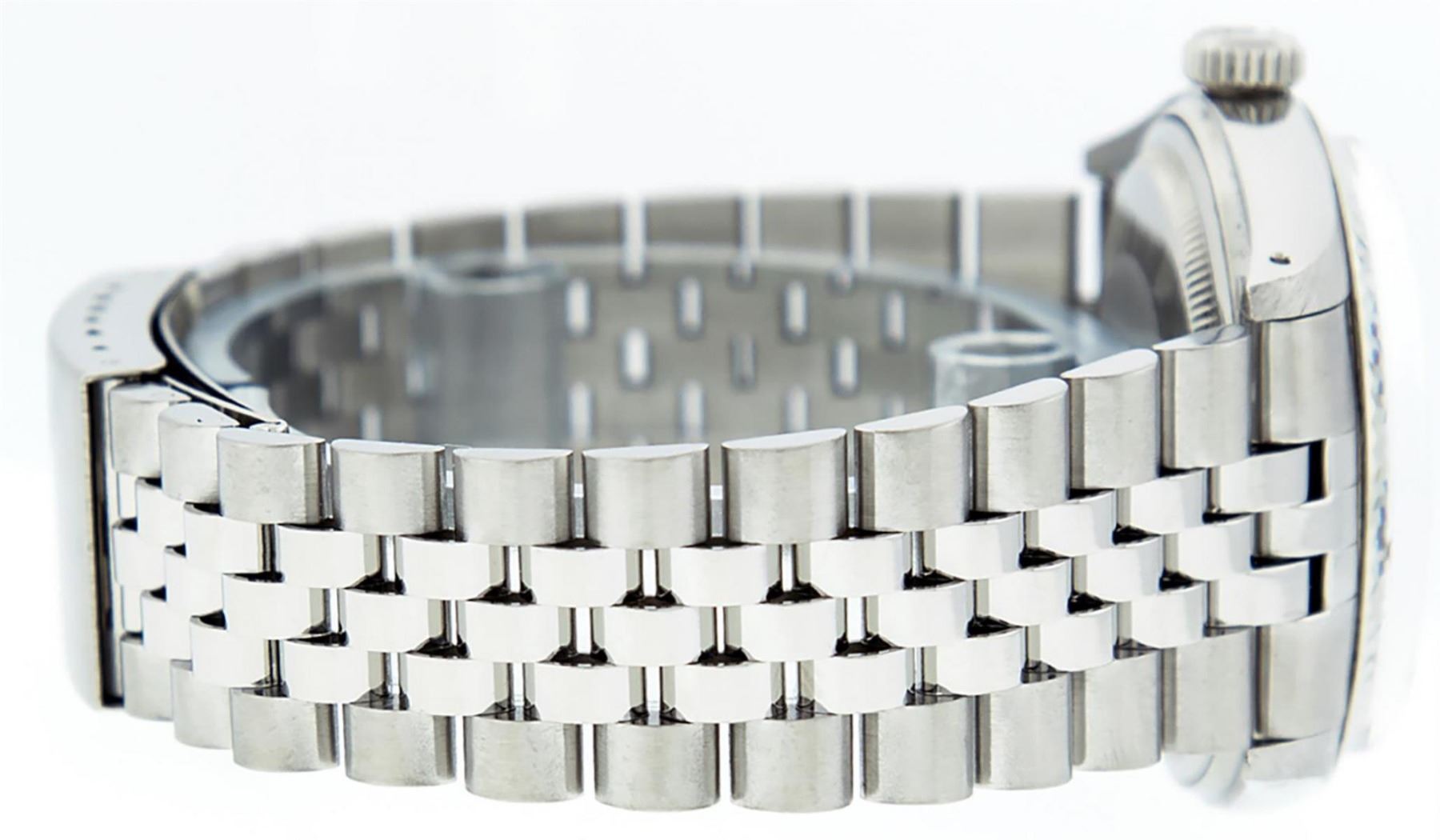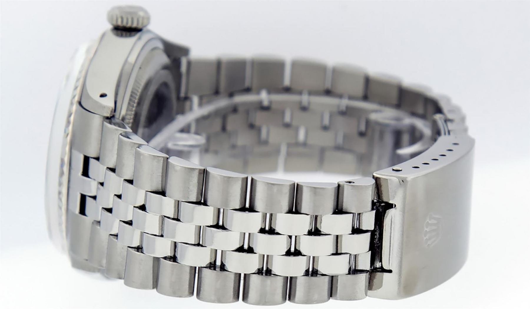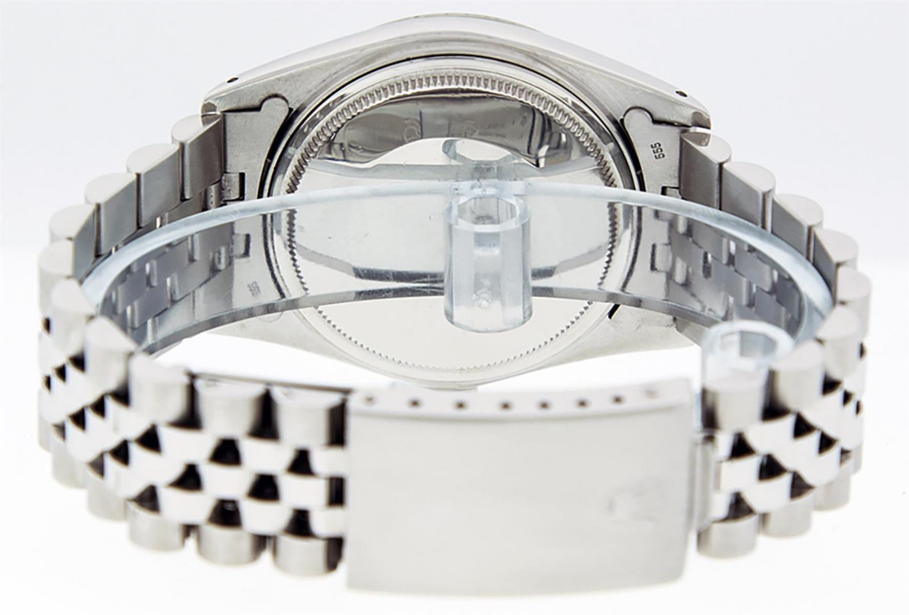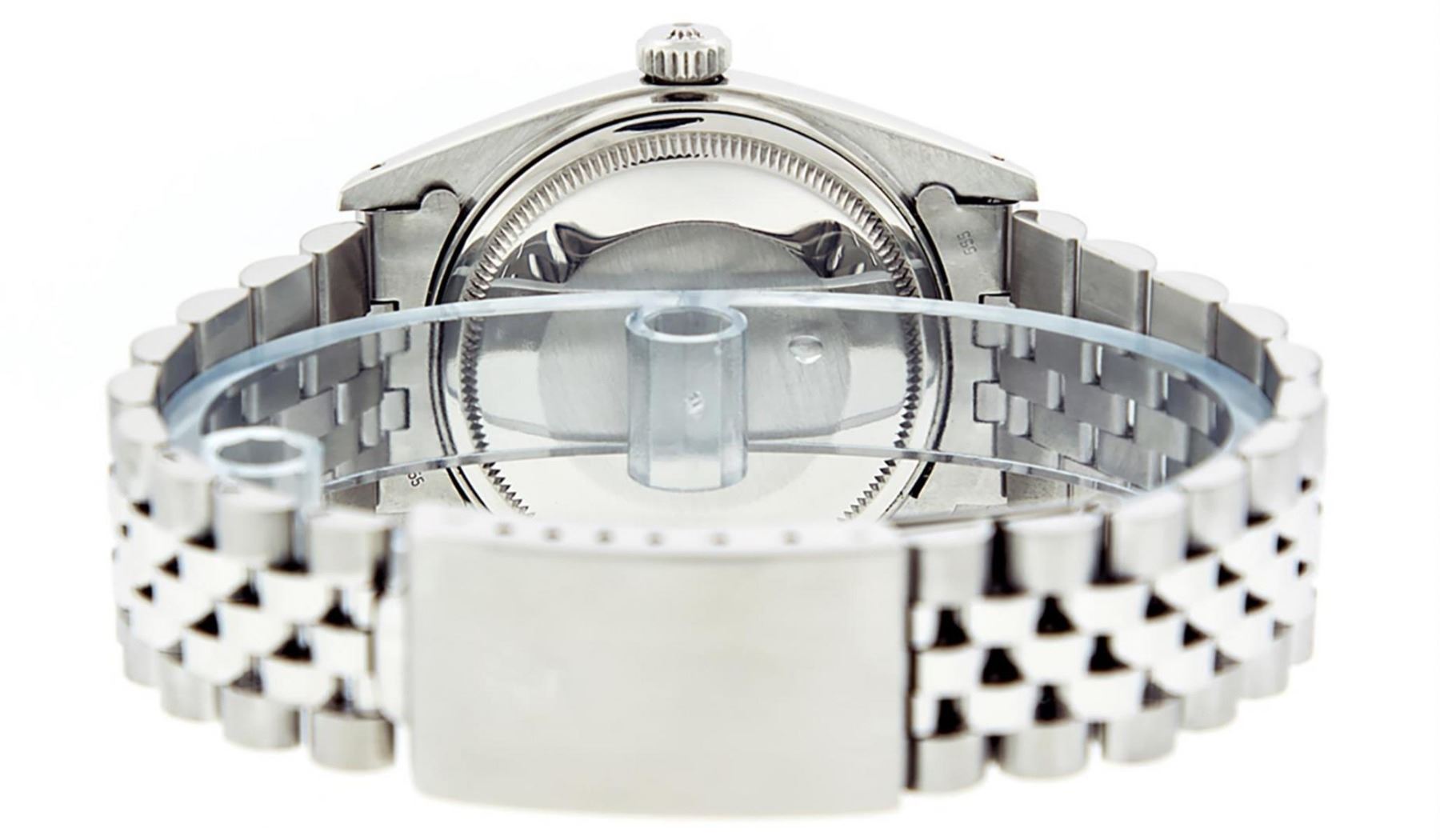 One Mens Stainless Steel Rolex Datejust Polished Bright with Satin Finish, This Watch Has Been Serviced & Electronically Tested, Stainless Steel Case: 36mm, Stainless Steel Crown, Bezel: 14K White Gold Fluted Bezel. Custom Crystal: New Acrylic Cyclops Lens. Custom Hands: New Luminescent Hands. Movement: Automatic Winding Movement Caliber 3035. Custom Dial: Black Diamond Dial With Diamond Hour Markers, Diamond Count: 10 Diamonds in Dial G To H In Color, SI-VS Clarity. Date Window: 3 O'Clock Position Date Display, Quickset, Model: Datejust, Condition: G-6 Extra Fine. Bracelet: Stainless Steel Jubilee. Bright Polish & Satin Finish. 7.0 Inch Length, Adjustable. Standard Clasp, With Rolex Logo. This Watch Has Been Serviced Time Tested And Is In Excellent Condition It Is Free Of All Scratches And Dents
