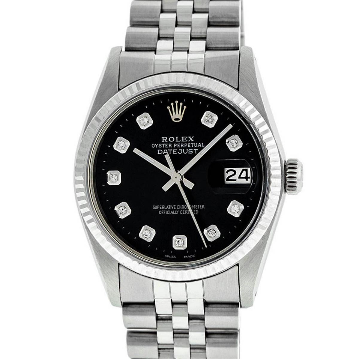One Mens Stainless Steel Rolex Datejust Polished Bright with Satin Finish, This Watch Has Been Serviced & Electronically Tested, Stainless Steel Case: 36mm, Stainless Steel Crown, Original Bezel: 14K White Gold Fluted Bezel. Custom Crystal: New Acrylic Cyclops Lens. Custom Hands: New Luminescent Hands. Movement: Automatic Winding Movement Caliber 3035. Custom Dial: Black Diamond Dial With Diamond Hour Markers, Diamond Count: 10 Diamonds in Dial G To H In Color, SI-VS Clarity. Date Window: 3 O'Clock Position Date Display, Quickset, Model: Datejust, Condition: G-6 Extra Fine. Bracelet: Stainless Steel Jubilee. Bright Polish & Satin Finish. 7.0 Inch Length, Adjustable. Standard Clasp, With Rolex Logo. This Watch Has Been Serviced Time Tested And Is In Excellent Condition It Is Free Of All Scratches And Dents