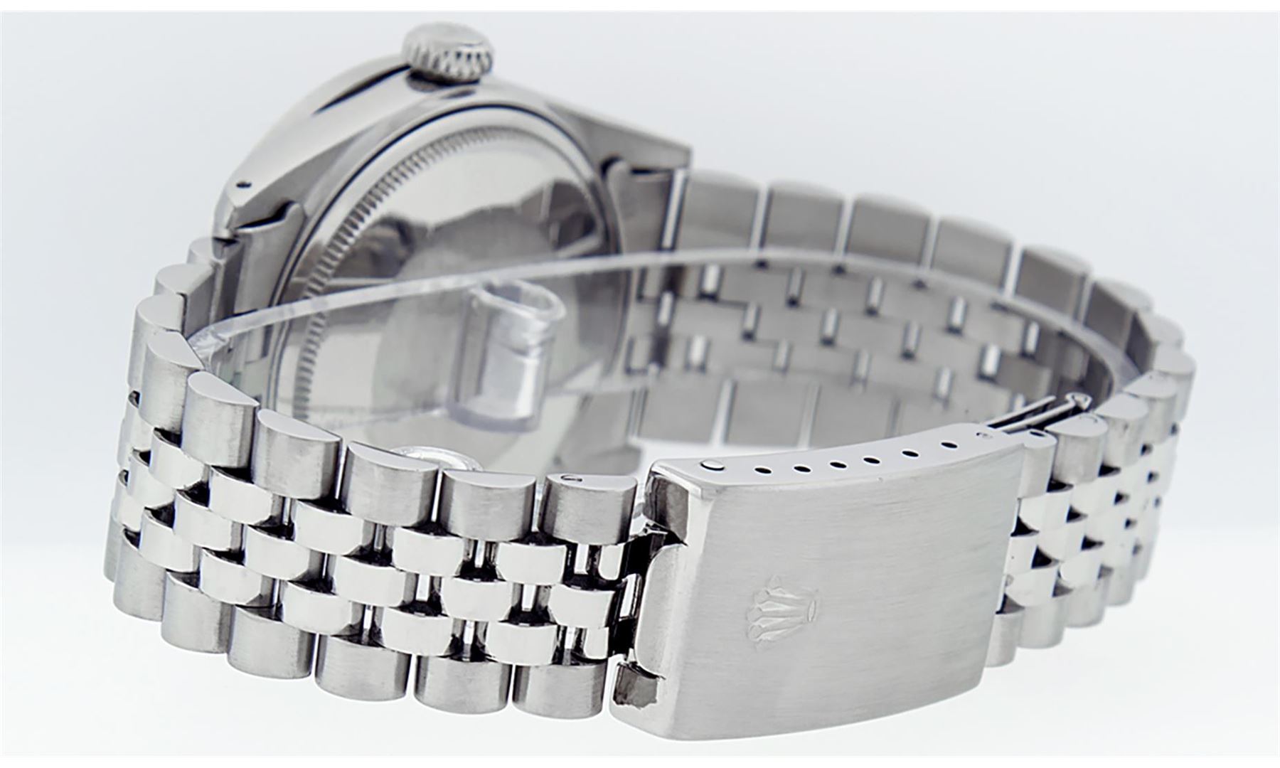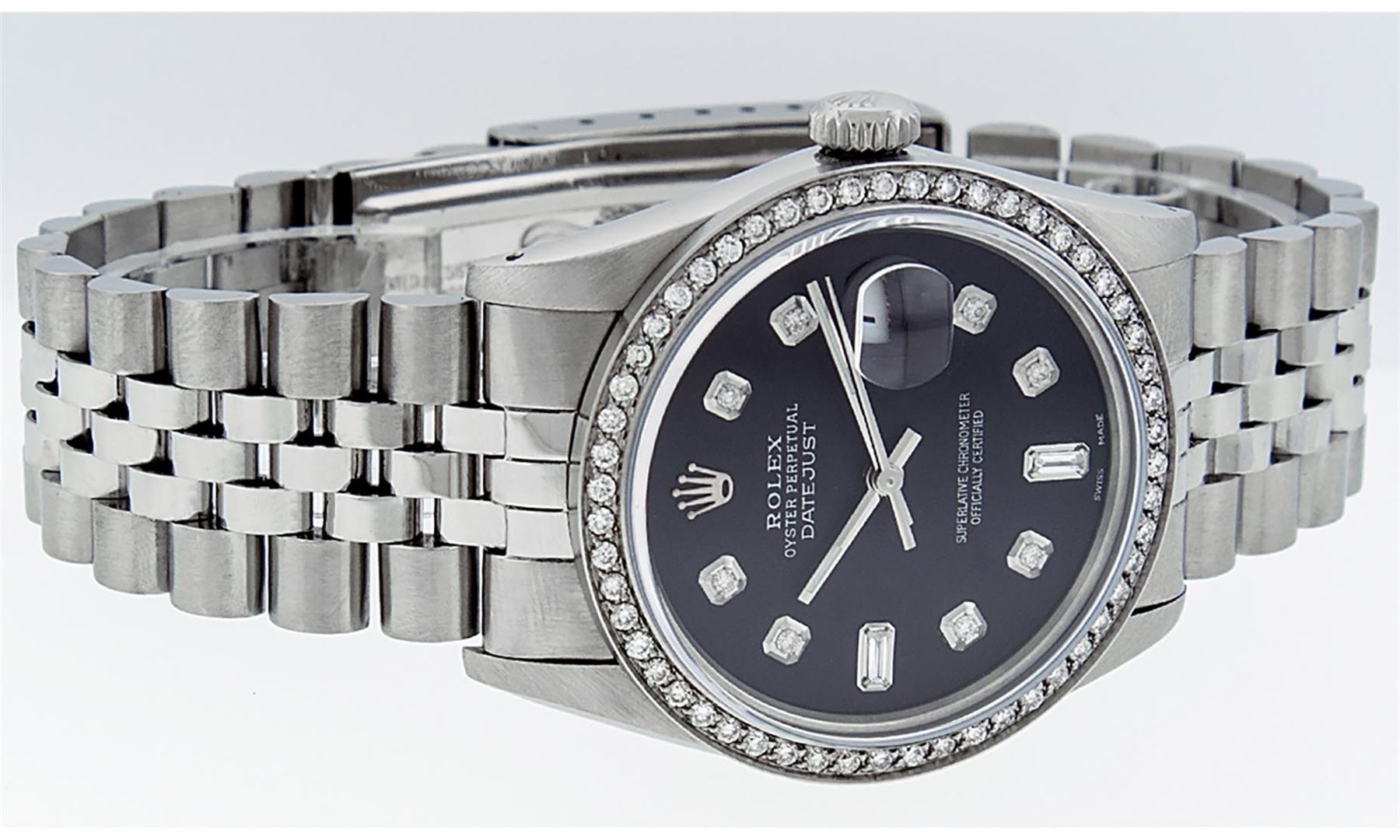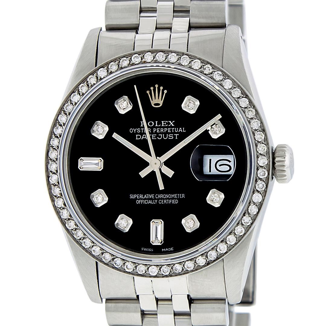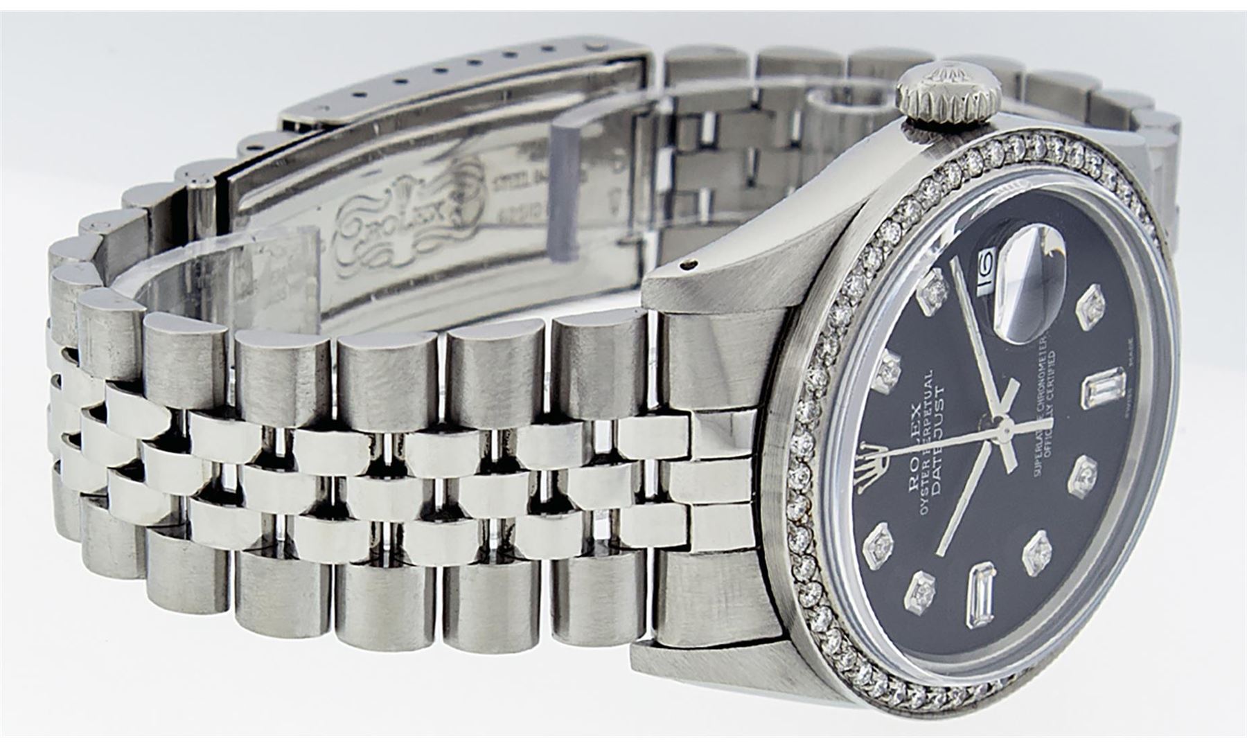 One Mens Rolex Stainless Steel Datejust Polished Bright with Satin Finish, This Watch Has Been Serviced & Electronically Tested, Stainless Steel Case: 36mm, Stainless Steel Crown, Custom Bezel: New Stainless Steel Beadset Diamond Bezel, Diamond Count: 54 Diamonds In Bezel, Total Weight 1.00 Carat, Clarity: SI-VS, Color: G to H. Custom Crystal: New Scratch Resistant Synthetic Sapphire Cyclops Lens. Custom Hands: New Luminescent Hands. Movement: Automatic Winding Movement Caliber 3035. Custom Dial: Black Diamond Dial, Diamond Count: 8 + 2 Baguette Diamonds In Dial, Color: G to H, Clarity: VS2-SI1. Date Window: 3 O'Clock Position Date Display, Quickset, Model: Datejust. Condition: G-6 Extra Fine. Bracelet: Stainless Steel Jubilee Band. Bright Polish & Satin Finish. 7.0 Inch Length, Adjustable. Standard Clasp, With Rolex Logo. This Watch Has Been Serviced Time Tested And Is In Excellent Condition It Is Free Of All Scratches And Dents.