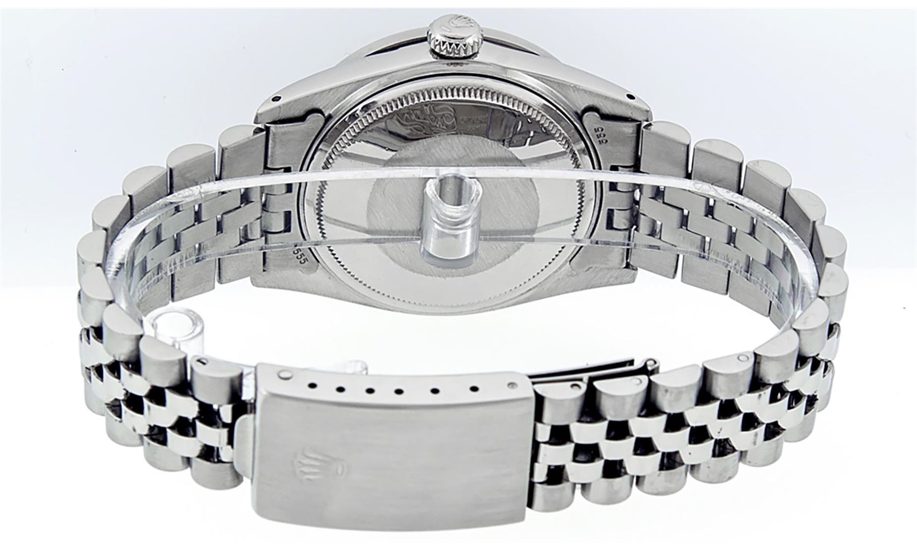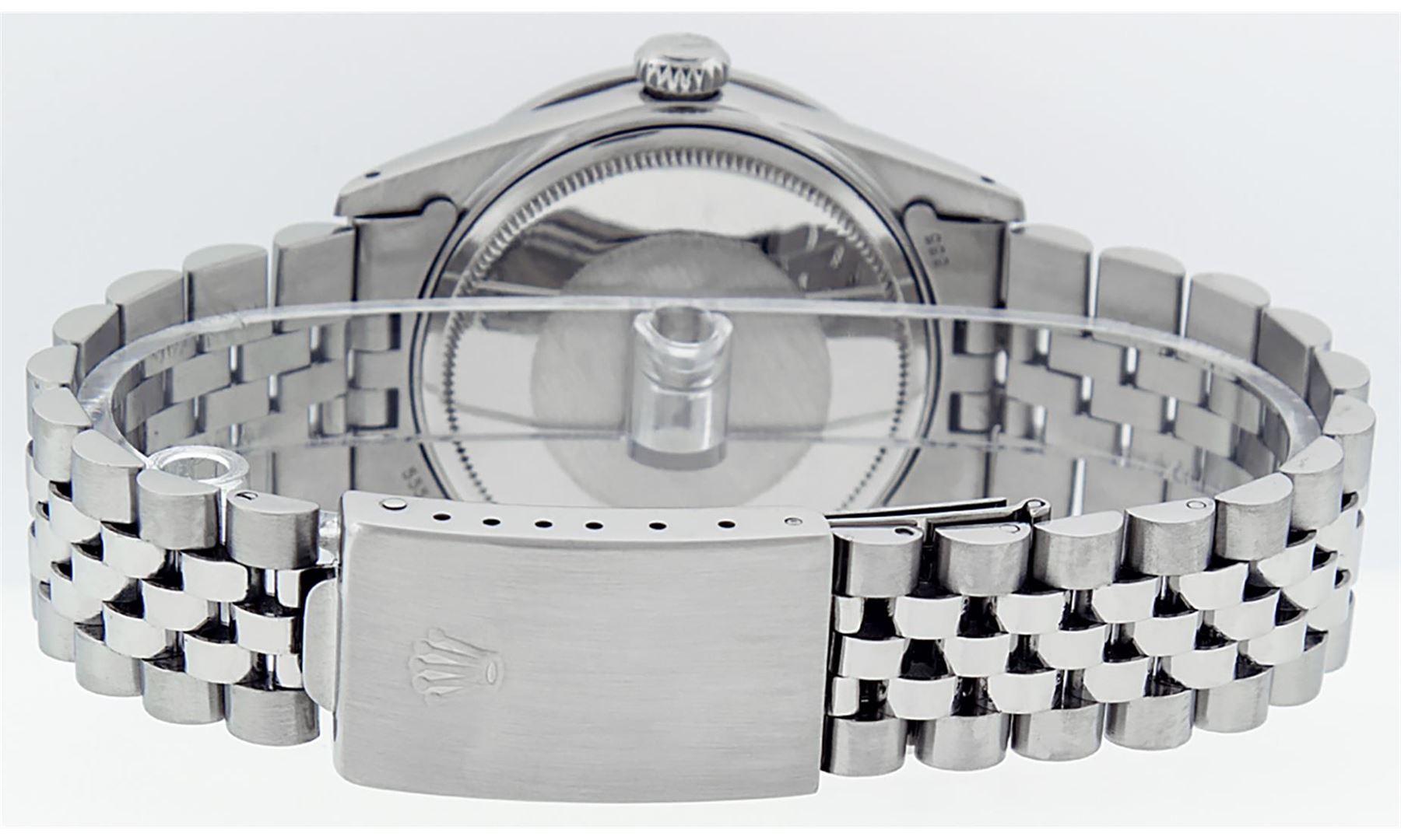 One Mens Rolex Stainless Steel Datejust Polished Bright with Satin Finish, This Watch Has Been Serviced & Electronically Tested, Stainless Steel Case: 36mm, Stainless Steel Crown, Custom Bezel: New Stainless Steel Beadset Diamond Bezel, Diamond Count: 54 Diamonds In Bezel, Total Weight 1.00 Carat, Clarity: SI-VS, Color: G to H. Custom Crystal: New Scratch Resistant Synthetic Sapphire Cyclops Lens. Custom Hands: New Luminescent Hands. Movement: Automatic Winding Movement Caliber 3035. Custom Dial: Black Diamond Dial, Diamond Count: 8 + 2 Baguette Diamonds In Dial, Color: G to H, Clarity: VS2-SI1. Date Window: 3 O'Clock Position Date Display, Quickset, Model: Datejust. Condition: G-6 Extra Fine. Bracelet: Stainless Steel Jubilee Band. Bright Polish & Satin Finish. 7.0 Inch Length, Adjustable. Standard Clasp, With Rolex Logo. This Watch Has Been Serviced Time Tested And Is In Excellent Condition It Is Free Of All Scratches And Dents.