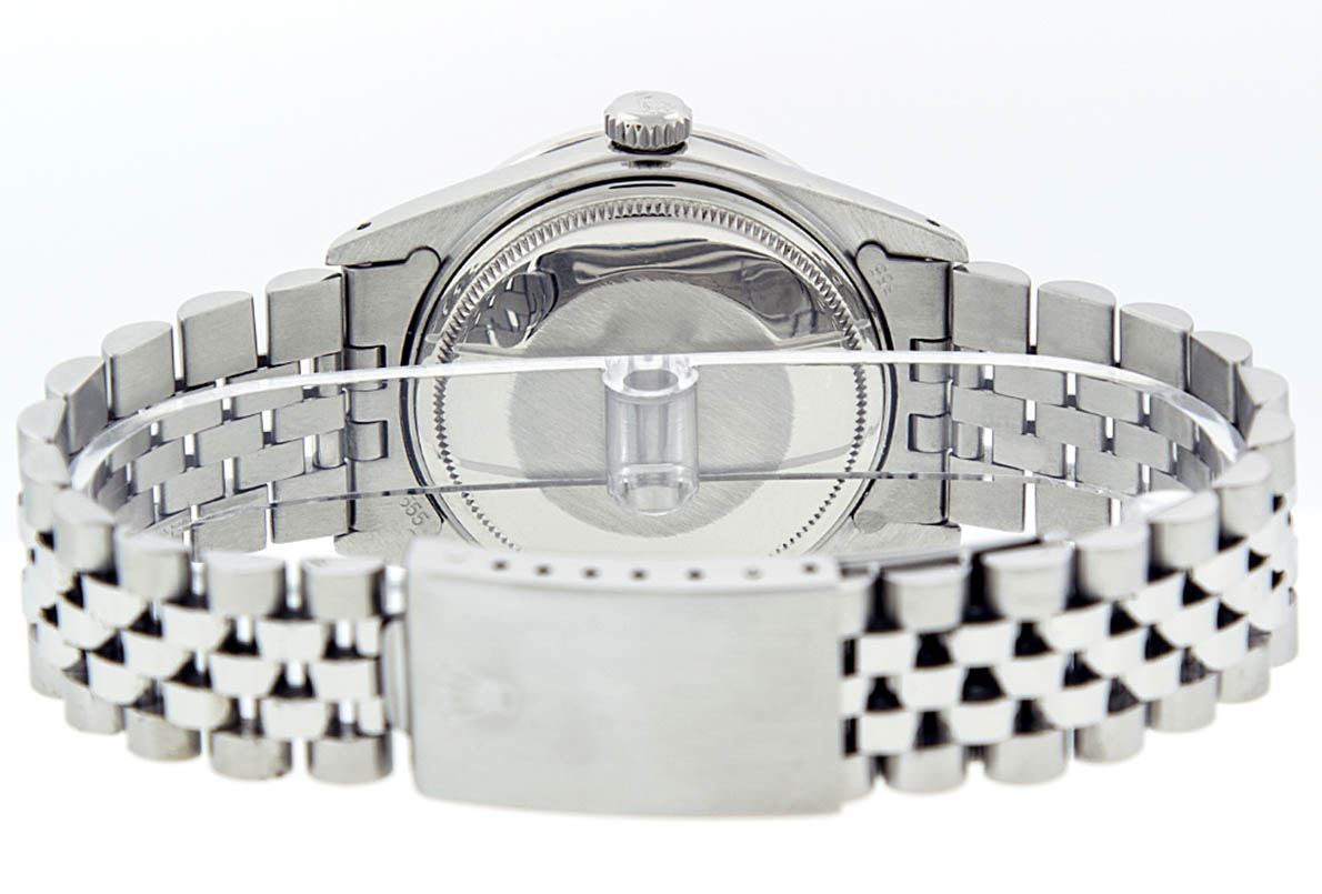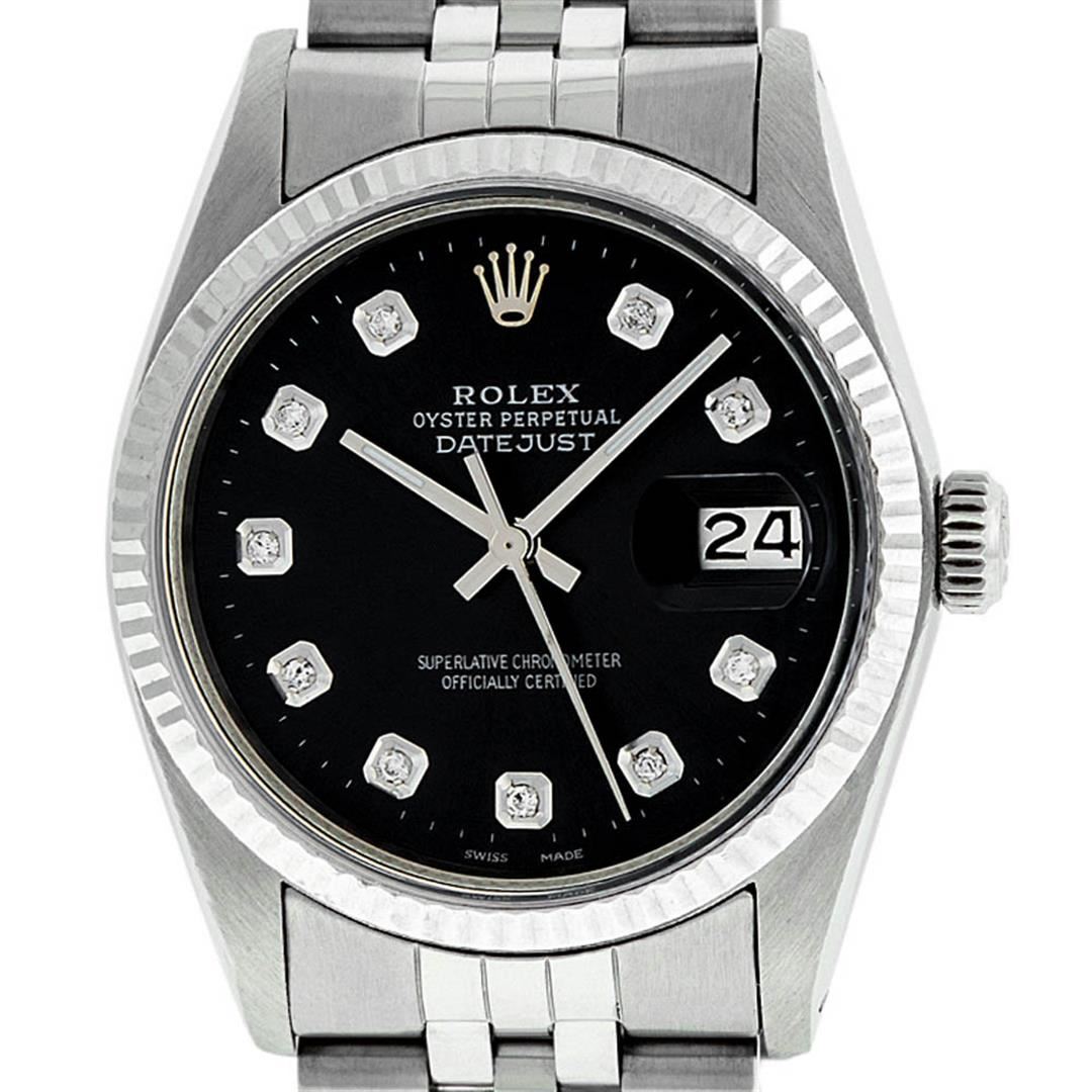 One Mens Stainless Steel Rolex Datejust Polished Bright with Satin Finish, This Watch Has Been Serviced & Electronically Tested, Stainless Steel Case: 36mm, Stainless Steel Crown, Original Bezel: 14K White Gold Fluted Bezel. Custom Crystal: New Acrylic Cyclops Lens. Custom Hands: New Luminescent Hands. Movement: Automatic Winding Movement Caliber 3035. Custom Dial: Black Diamond Dial With Diamond Hour Markers, Diamond Count: 10 Diamonds in Dial G To H In Color, SI-VS Clarity. Date Window: 3 O'Clock Position Date Display, Quickset, Model: Datejust, Condition: G-6 Extra Fine. Bracelet: Stainless Steel Jubilee. Bright Polish & Satin Finish. 7.0 Inch Length, Adjustable. Standard Clasp, With Rolex Logo. This Watch Has Been Serviced Time Tested And Is In Excellent Condition It Is Free Of All Scratches And Dents