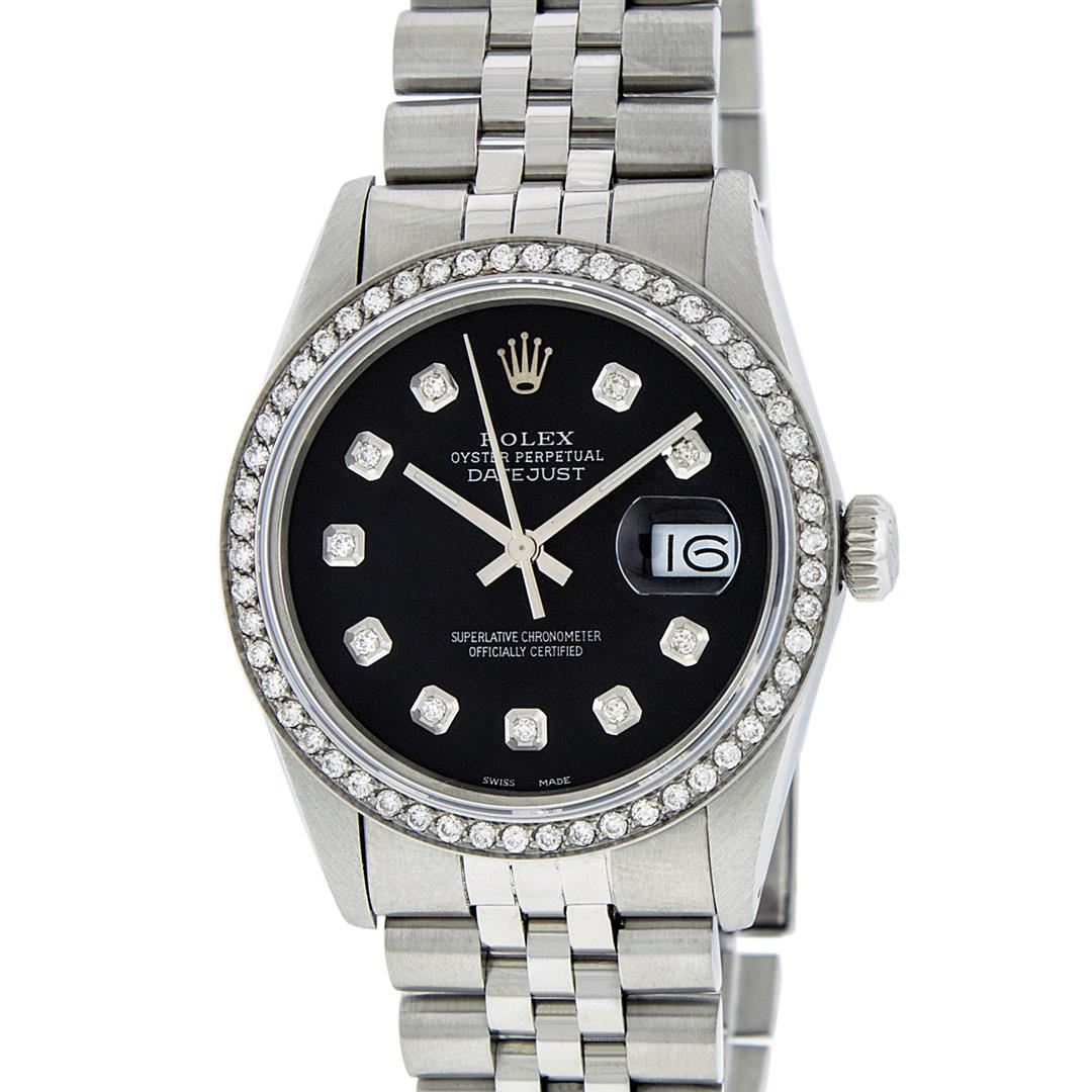 One Mens Rolex Stainless Steel Datejust Polished Bright with Satin Finish, This Watch Has Been Serviced & Electronically Tested, Stainless Steel Case: 36mm, Stainless Steel Crown, Custom Bezel: New Stainless Steel Beadset Diamond Bezel, Diamond Count: 54 Diamonds In Bezel, Total Weight 1.00 Carat, Clarity: SI-VS, Color: G to H. Custom Crystal: New Synthetic Sapphire Cyclops Lens. Custom Hands: New Luminescent Hands. Movement: Automatic Winding Movement Caliber 3035. Custom Dial: Black Diamond Dial, Diamond Count: 10 Diamonds In Dial, Color: G to H, Clarity: VS2-SI1. Date Window: 3 O'Clock Position Date Display, Quickset, Model: Datejust. Condition: G-6 Extra Fine. Bracelet: Stainless Steel Jubilee Band. Bright Polish & Satin Finish. 7.0 Inch Length, Adjustable. Standard Clasp, With Rolex Logo. This Watch Has Been Serviced Time Tested And Is In Excellent Condition It Is Free Of All Scratches And Dents.