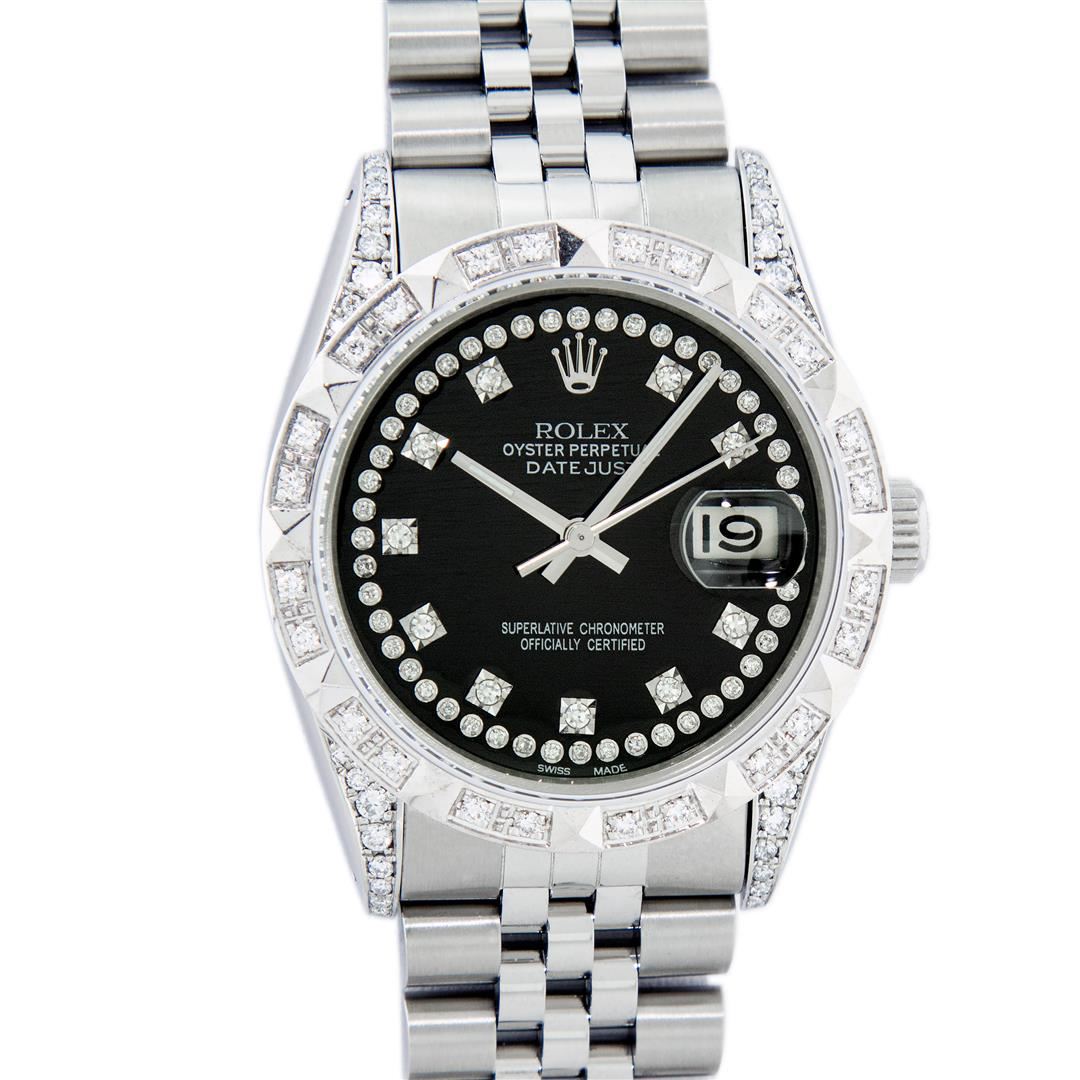 One Mens Stainless Steel Rolex Datejust Polished Bright with Satin Finish, Serviced & Electronically Tested, Stainless Steel Case: 36mm, Custom Diamonds On Lugs: 28 Diamonds On Lugs, Color: G to H, Clarity: SI-VS. Stainless Steel Crown, New Custom Bezel: 18K White Gold Pyramid Diamond Bezel, Diamond Count: 24 Diamonds On Bezel, Total Weight .75 Carat, Clarity: SI-VS, Color: G to H. Custom Crystal: New Scratch Resistant Synthetic Sapphire Cyclops Lens. Custom Hands: New Luminecent Hands. Movement: Automatic Winding Movement. Custom Dial: Black String Single Cut Diamond Dial, Diamond Count: 58 Diamonds In Dial, Diamond Color: G To H In Color, Clarity: VS. Date Window: 3 O'Clock Position Date Display, Quickset, Model: Datejust Condition: G-6 Extra Fine. Bracelet: Stainless Steel Jubilee Band. Bright Polish & Satin Finish. 7.0 Inch Length, Adjustable. Standard Clasp, With Rolex Logo. This Watch Has Been Serviced And Polished And Its Free Of All Dents And Scratches.