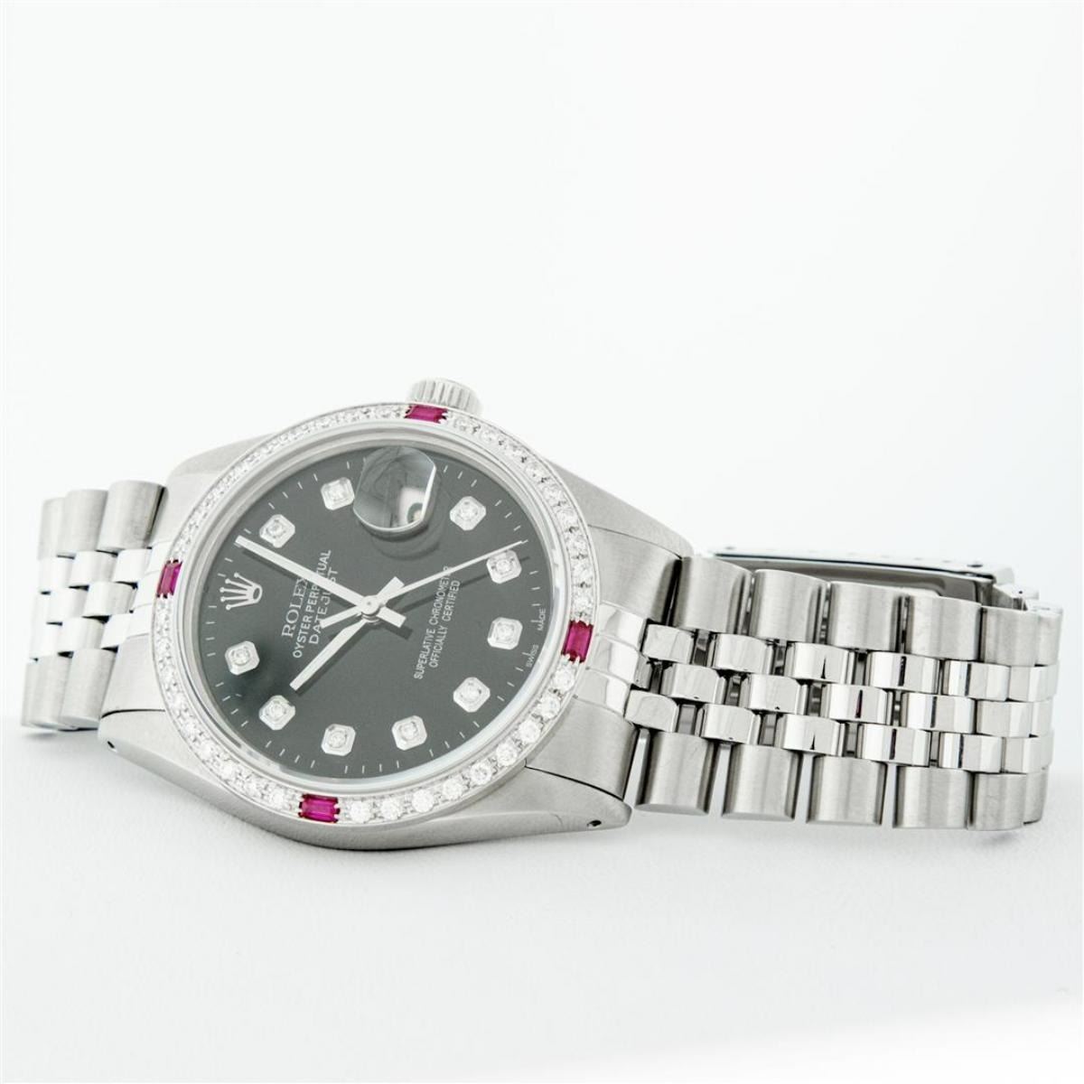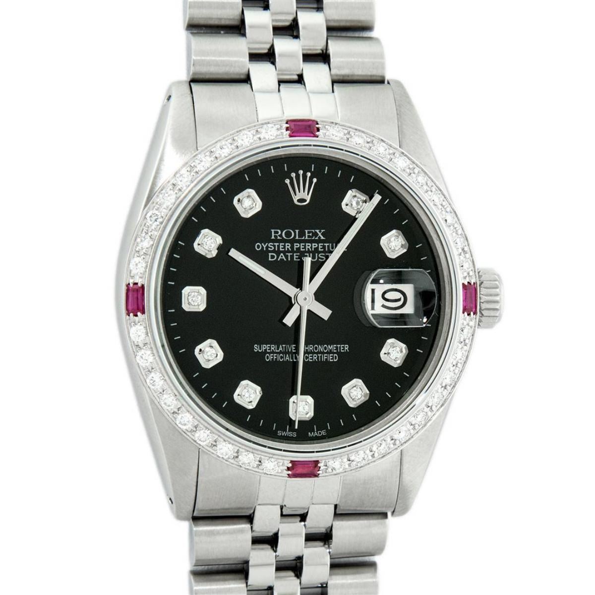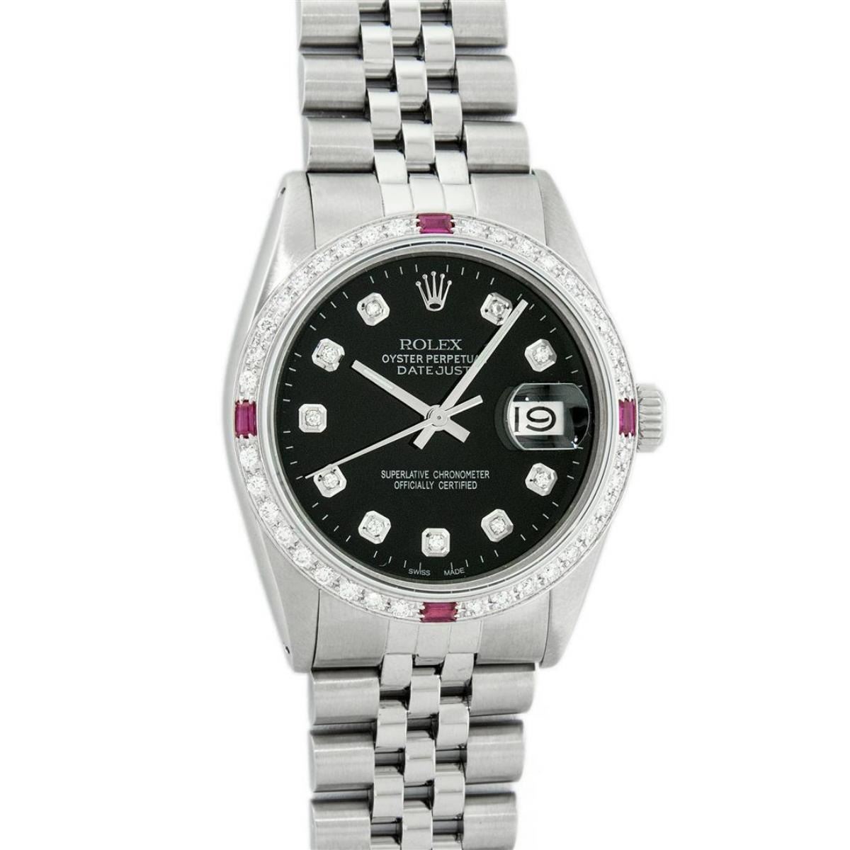 One Mens Stainless Steel Rolex Datejust Polished, Serviced & Electronically Tested, Stainless Steel Case: 36mm, Stainless Steel Crown, Custom Bezel: New 18K White Gold Ruby Beadset Diamond Bezel, Diamond + Gem Count: 36 Diamonds + 4 Rubies, Total Weight 1.00 Carat, Clarity: SI-VS, Color: G to H. Custom Crystal: New Scratch Resistant Synthetic Sapphire Cyclops Lens. Custom Hands: New Luminescent Hands. Movement: Automatic Winding Movement Caliber 3035. Custom Dial: Black Diamond Dial With Dash Track, 10 Diamonds in Dial, G To H In Color, Clarity: SI-VS. Date Window: 3 O'Clock Position Date Display, Quickset, Model: Datejust. Condition: G-6 Extra Fine. Bracelet: Stainless Steel Jubilee Band. Bright Polish & Satin Finish. 7.0 Inch Length, Adjustable. Standard Clasp, With Rolex Logo. This Watch Has Been Serviced Time Tested And Is In Excellent Condition It Is Free Of All Scratches And Dents.