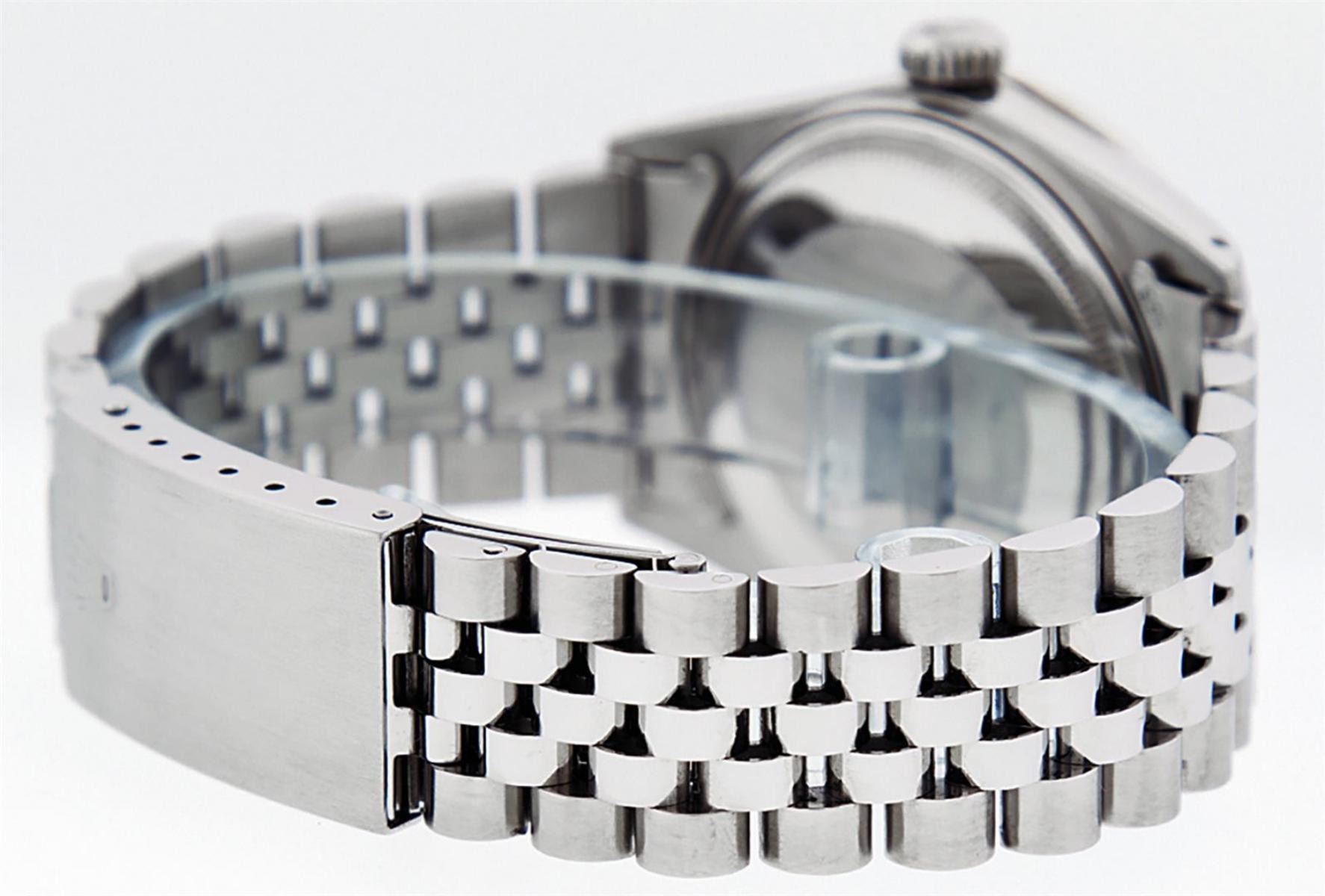 One Mens Stainless Steel Rolex Datejust Polished, Serviced & Electronically Tested, Stainless Steel Case: 36mm, Stainless Steel Crown, Custom Bezel: New 18K White Gold Sapphire Beadset Diamond Bezel, Diamond + Gem Count: 36 Diamonds + 4 Sapphires, Total Weight 1.00 Carat, Clarity: SI-VS, Color: G to H. Custom Crystal: New Scratch Resistant Synthetic Sapphire Cyclops Lens. Custom Hands: New Luminescent Hands. Movement: Automatic Winding Movement Caliber 3035. Custom Dial: Black Diamond Dial, 10 Diamonds in Dial, G To H In Color, Clarity: SI-VS. Date Window: 3 O'Clock Position Date Display, Quickset, Model: Datejust. Condition: G-6 Extra Fine. Bracelet: Stainless Steel Jubilee Band. Bright Polish & Satin Finish. 7.0 Inch Length, Adjustable. Standard Clasp, With Rolex Logo. This Watch Has Been Serviced Time Tested And Is In Excellent Condition It Is Free Of All Scratches And Dents.