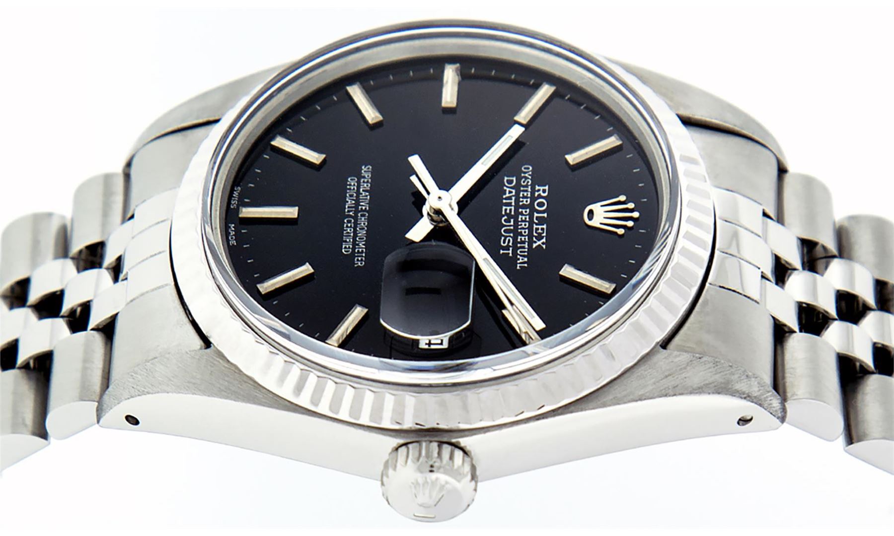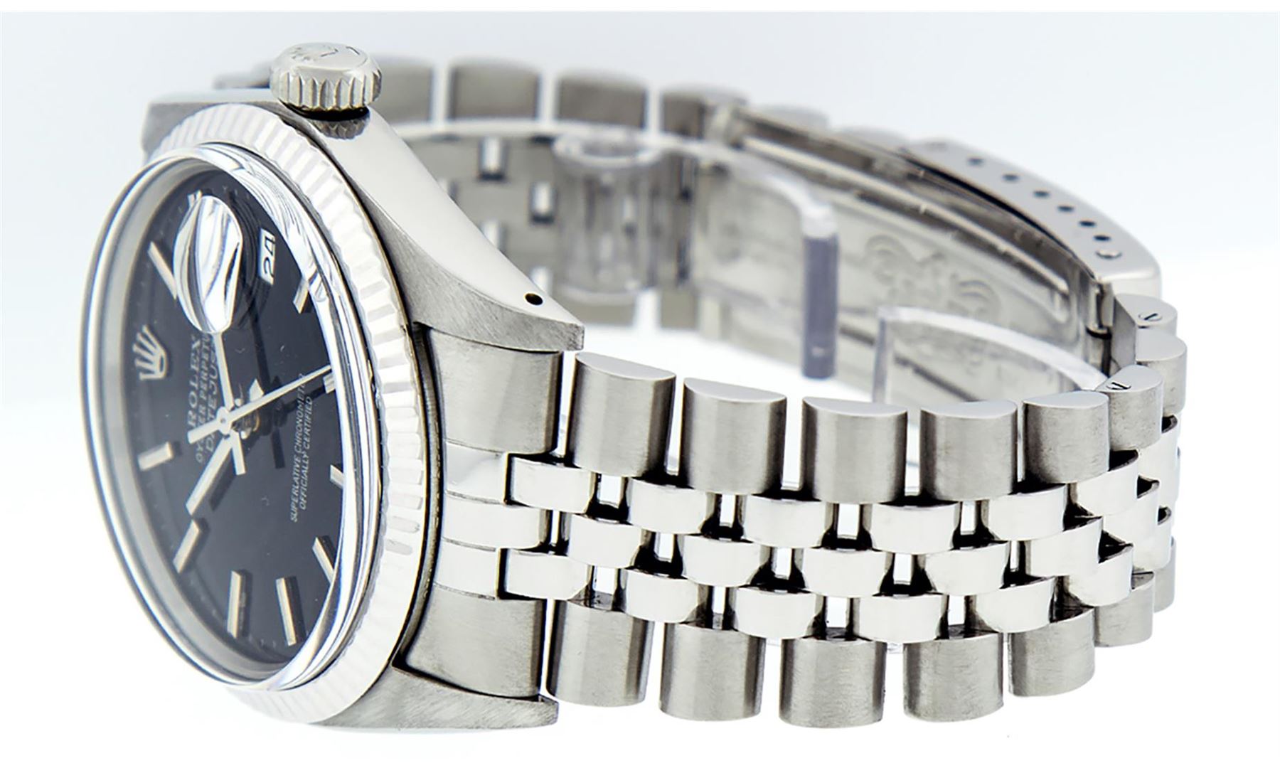 One Mens Pre Owned Rolex Datejust Polished, Serviced & Electronically Tested, Rolex Stainless Steel Case: 36mm, Rolex Stainless Steel Crown, Rolex Bezel: 14K White Gold Fluted Bezel. Custom Crystal: Acrylic With Magnified Date Window. Custom Hands: New Luminescent Hands. Rolex Movement: Automatic Winding Movement 3035. Custom Dial: Refinished To Black Dial With Index Hour Markers With Line Track. Date Window: 3 O'Clock Position Date Display, Quickset, Model: Datejust, Condition: G-6 Extra Fine. Rolex Bracelet: Stainless Steel Jubilee Band. Bright Polish & Satin Finish. 7.0 Inch Length, Adjustable. Standard Clasp, With Rolex Logo. This Watch Has Been Serviced And Polished It Is Free Of All Scratches And Dents.