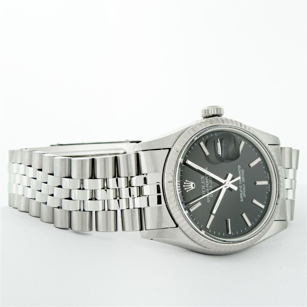 One Mens Pre Owned Rolex Datejust Polished, Serviced & Electronically Tested, Rolex Stainless Steel Case: 36mm, Rolex Stainless Steel Crown, Rolex Bezel: 14K White Gold Fluted Bezel. Custom Crystal: Acrylic With Magnified Date Window. Custom Hands: New Luminescent Hands. Rolex Movement: Automatic Winding Movement 3035. Custom Dial: Refinished To Black Dial With Index Hour Markers With Line Track. Date Window: 3 O'Clock Position Date Display, Quickset, Model: Datejust, Condition: G-6 Extra Fine. Rolex Bracelet: Stainless Steel Jubilee Band. Bright Polish & Satin Finish. 7.0 Inch Length, Adjustable. Standard Clasp, With Rolex Logo. This Watch Has Been Serviced And Polished It Is Free Of All Scratches And Dents.