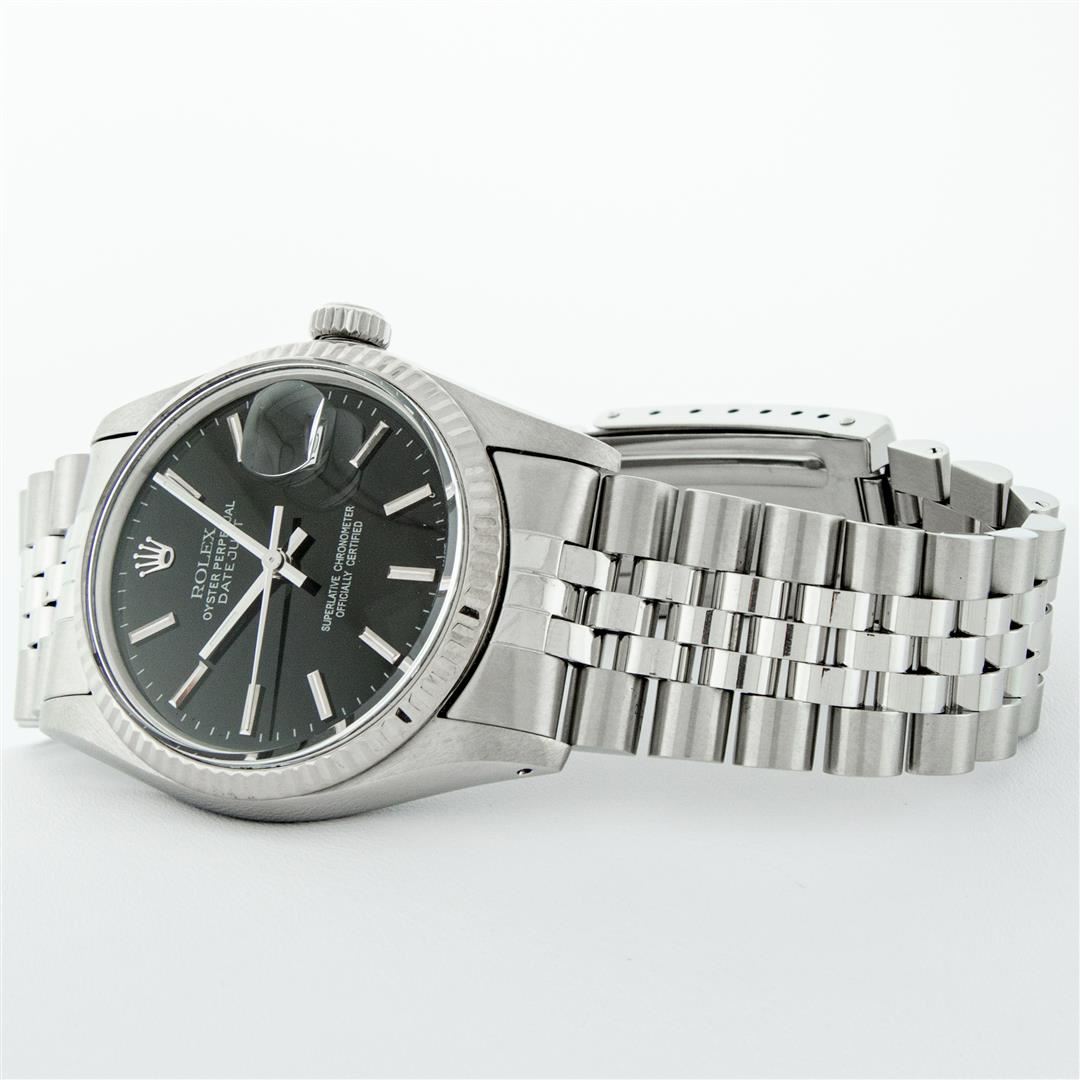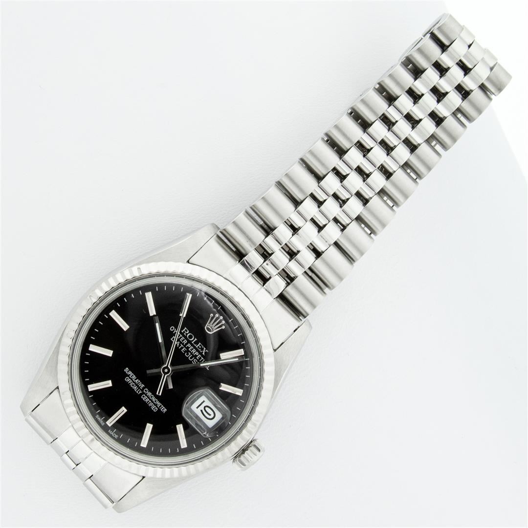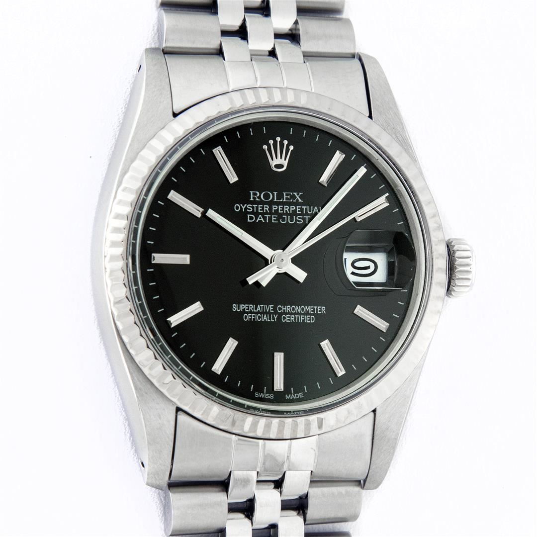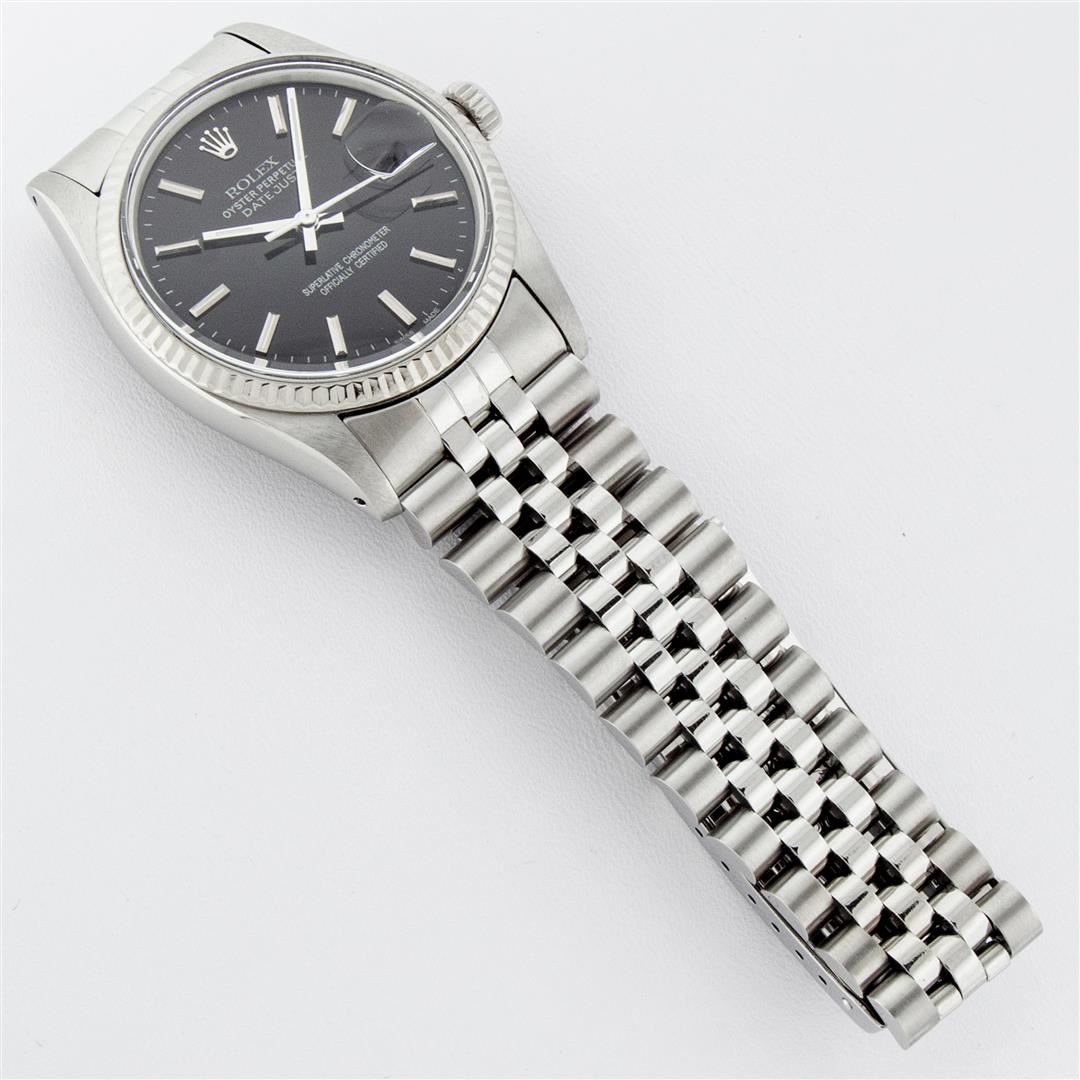 One Mens Pre Owned Rolex Datejust Polished, Serviced & Electronically Tested, Rolex Stainless Steel Case: 36mm, Rolex Stainless Steel Crown, Rolex Bezel: 14K White Gold Fluted Bezel. Custom Crystal: Acrylic Cyclops Lens. Custom Hands: New Luminescent Hands. Rolex Movement: Automatic Winding Movement. Custom Dial: Refinished Black Dial With Index Hour Markers With Line Track. Date Window: 3 O'Clock Position Date Display, Quickset, Model: Datejust, Condition: G-6 Extra Fine. Bracelet: Stainless Steel Jubilee Band. Bright Polish & Satin Finish. 7.0 Inch Length, Adjustable. Standard Clasp, With Rolex Logo. Watch Has Been Serviced And Polished It Is Free Of All Scratches And Dents.