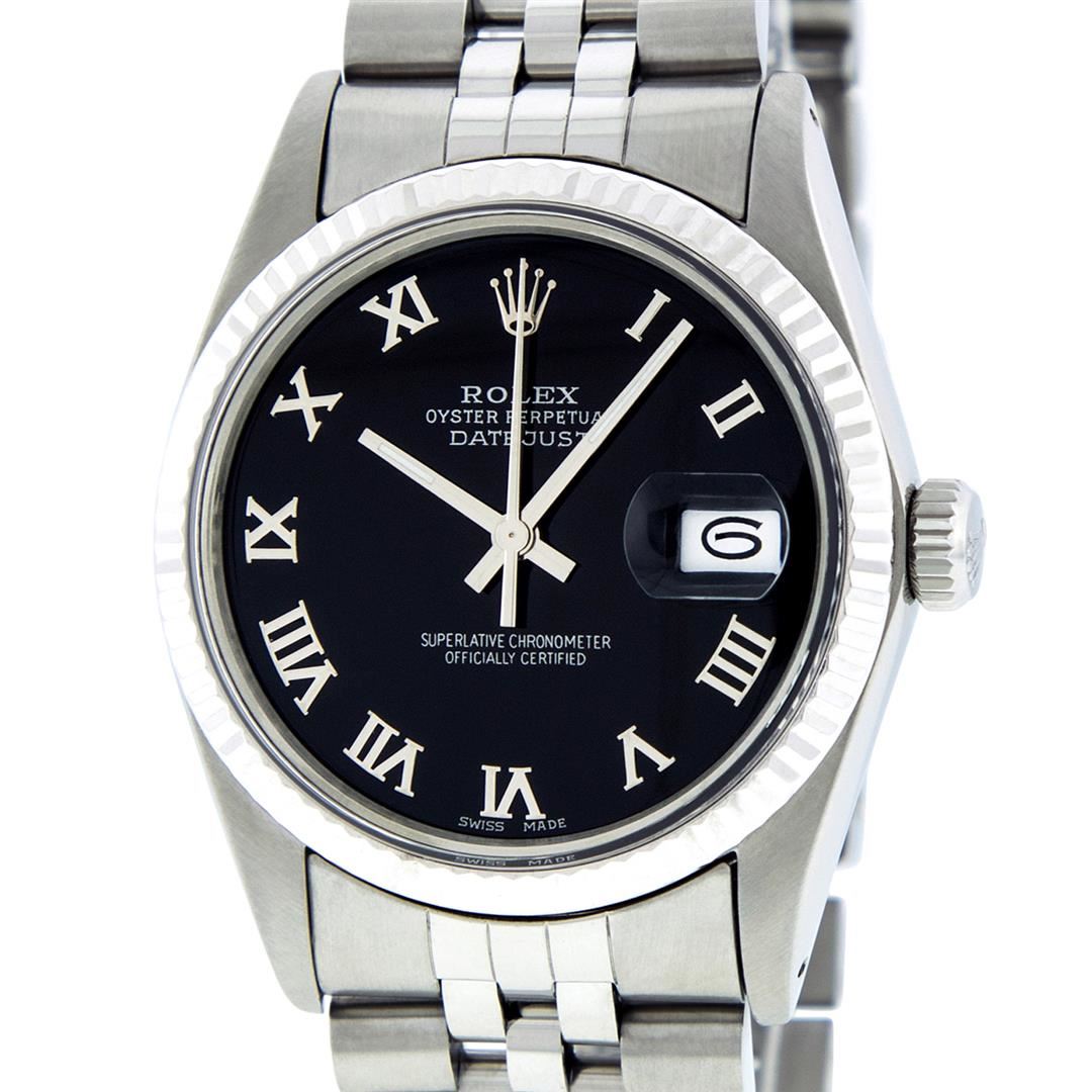 One Mens Stainless Steel Rolex Datejust Polished Bright with Satin Finish, Serviced & Electronically Tested, Stainless Steel Case: 36mm, Stainless Steel Crown, Bezel: White Gold Fluted Bezel. Custom Crystal: New Acrylic Cyclops Lens. Custom Hands: New Hands. Movement: Automatic Winding Movement. Custom Dial: Black Roman. Date Window: 3 O'Clock Position Date Display, Quickset, Model: Datejust, Condition: G-6 Extra Fine. Bracelet:Stainless Steel Jubilee. Bright Polish & Satin Finish. 7.0 Inch Length, Adjustable. Standard Clasp, With Rolex Logo. Watch Has Been Serviced And Polished It Is Free Of All Scratches And Dents.