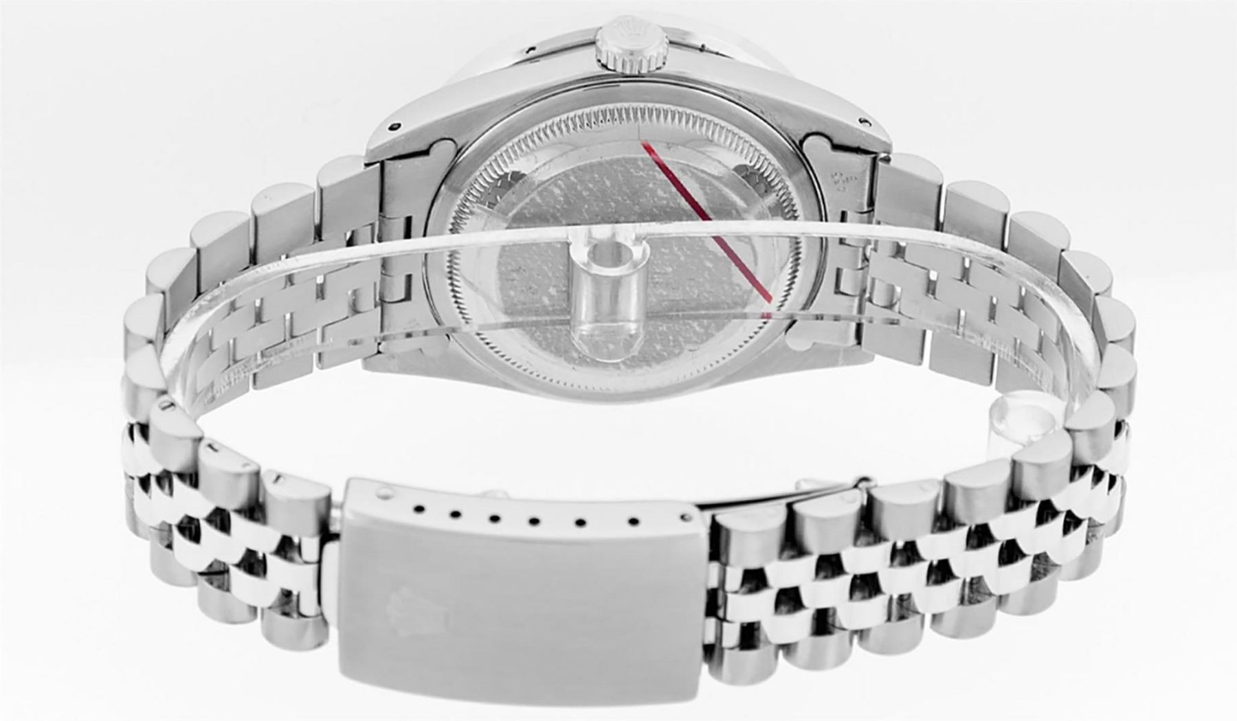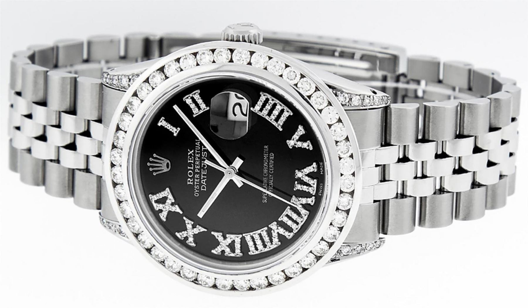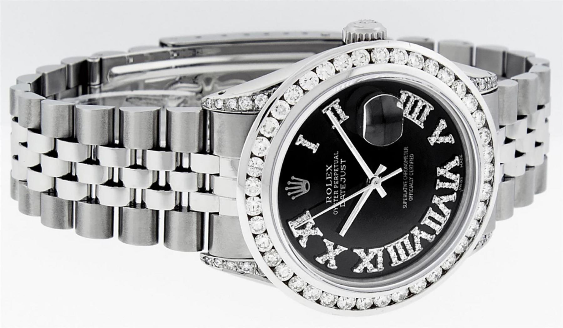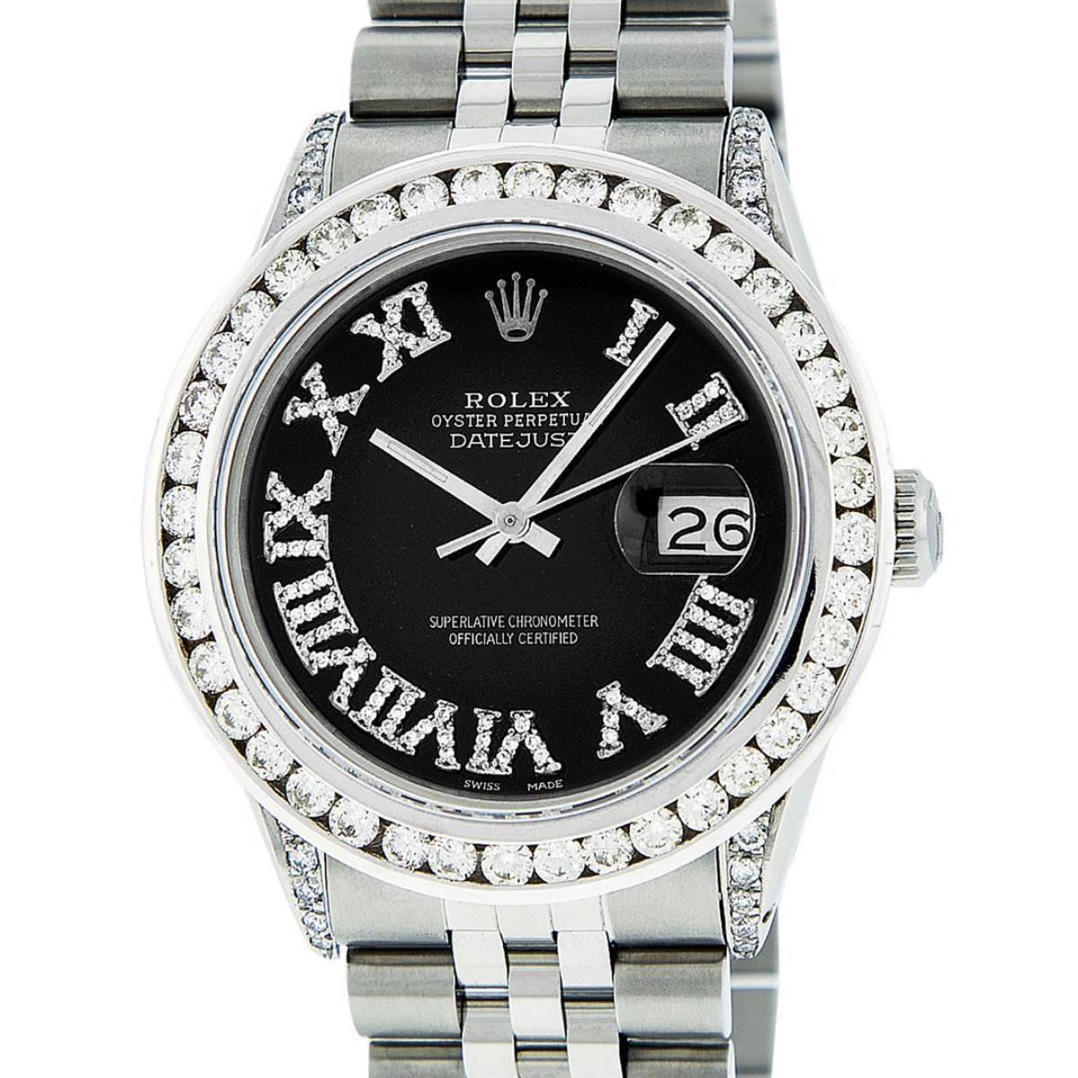 One Mens Stainless Steel Rolex Datejust Polished Bright with Satin Finish, Serviced & Electronically Tested, Stainless Steel Case: 36mm, Diamond Lugs: 24 Diamonds On Lugs, Color: G to H, Clarity: SI-VS. Stainless Steel Crown, New Custom Bezel: 18K White Gold 3.00 Ctw Diamond Bezel, Diamond Count: 40 Diamonds, Total Weight 3.0 Carat, Clarity: SI-VS, Color: G to H. Custom Crystal: New Scratch Resistant Synthetic Sapphire Cyclops Lens. Movement: Automatic Winding Movement Caliber 3035. Custom Dial: Black Roman Diamond Dial, Diamond Color: G To H In Color, Clarity: SI-VS. Date Window: 3 O'Clock Position Date Display, Quickset, Model: Quickset Datejust, Condition: G-6 Extra Fine. Bracelet: Stainless Steel Jubilee Band. Bright Polish & Satin Finish. 7.0 Inch Length, Adjustable. Standard Clasp, With Rolex Logo. This Watch Has Been Serviced Time Tested And Is In Excellent Condition It Is Free Of All Scratches And Dents. This Watch Also Comes With A Brand New Wooden Watch Winder.