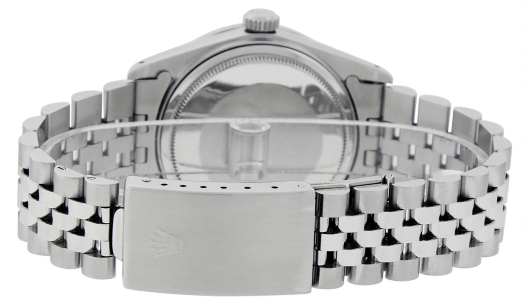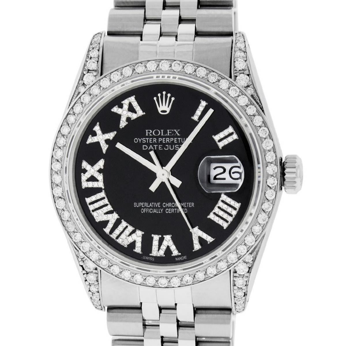 One Mens Stainless Steel Rolex Datejust Polished Bright with Satin Finish, Serviced & Electronically Tested, Stainless Steel Case: 36mm, Diamond Lugs: 24 Diamonds On Lugs, Color: G to H, Clarity: SI-VS. Stainless Steel Crown, New Custom Bezel: Stainless Steel Set Diamond Bezel, Diamond Count: 54 Diamonds On Bezel, Total Weight 1.00 Carat, Clarity: SI-VS, Color: G to H. Custom Crystal: New Scratch Resistant Synthetic Sapphire Cyclops Lens. Movement: Automatic Winding Movement Caliber 3035. Custom Dial: Black Roman Diamond Dial, Diamond Color: G To H In Color, Clarity: SI-VS. Date Window: 3 O'Clock Position Date Display, Quickset, Model: Quickset Datejust, Condition: G-6 Extra Fine. Bracelet: Stainless Steel Jubilee Band. Bright Polish & Satin Finish. 7.0 Inch Length, Adjustable. Standard Clasp, With Rolex Logo. This Watch Has Been Serviced Time Tested And Is In Excellent Condition It Is Free Of All Scratches And Dents. This Watch Also Comes With A Brand New Wooden Watch Winder.