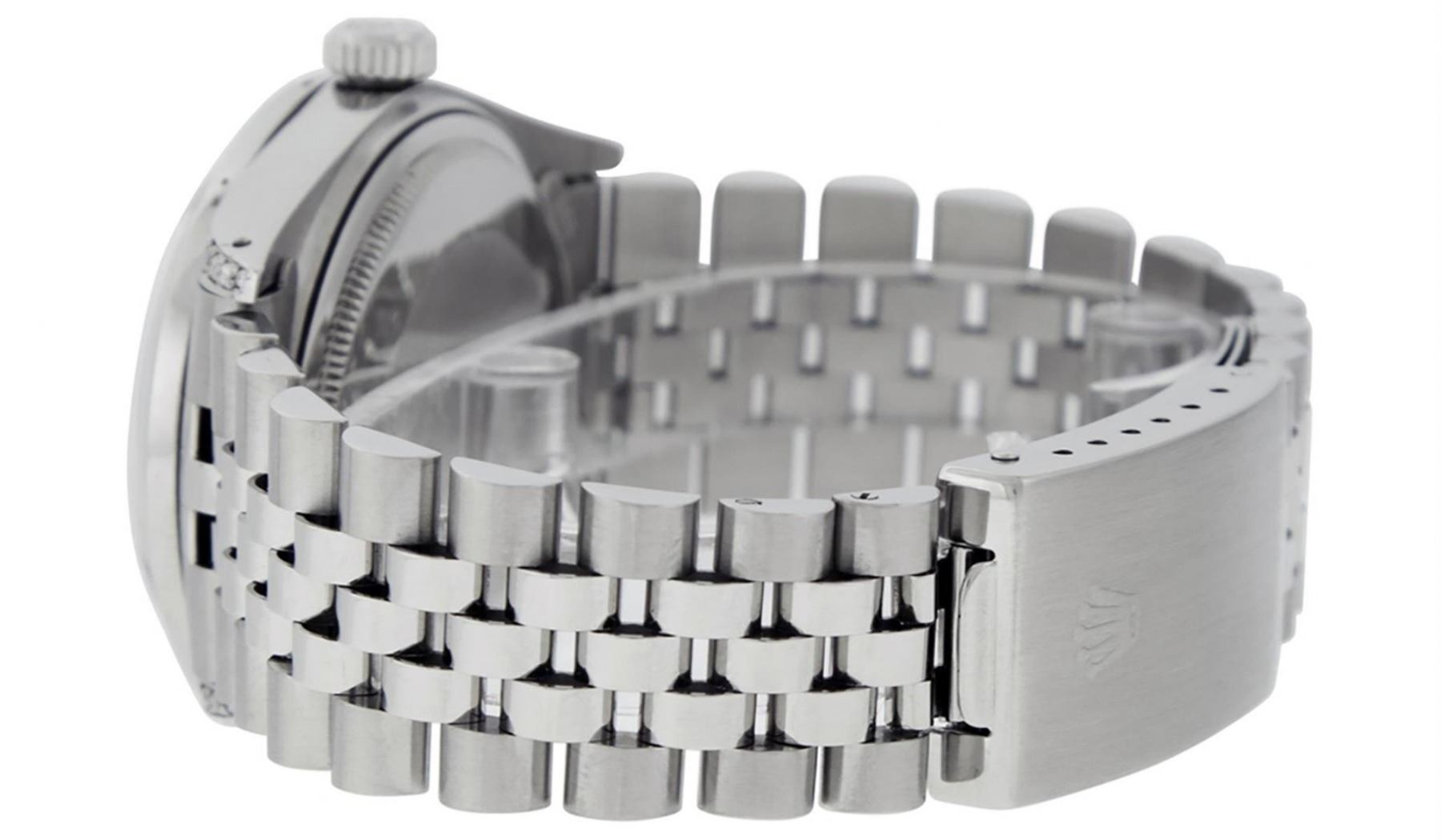 One Mens Stainless Steel Rolex Datejust Polished Bright with Satin Finish, Serviced & Electronically Tested, Stainless Steel Case: 36mm, Diamond Lugs: 24 Diamonds On Lugs, Color: G to H, Clarity: SI-VS. Stainless Steel Crown, New Custom Bezel: Stainless Steel Set Diamond Bezel, Diamond Count: 54 Diamonds On Bezel, Total Weight 1.00 Carat, Clarity: SI-VS, Color: G to H. Custom Crystal: New Scratch Resistant Synthetic Sapphire Cyclops Lens. Movement: Automatic Winding Movement Caliber 3035. Custom Dial: Black Roman Diamond Dial, Diamond Color: G To H In Color, Clarity: SI-VS. Date Window: 3 O'Clock Position Date Display, Quickset, Model: Quickset Datejust, Condition: G-6 Extra Fine. Bracelet: Stainless Steel Jubilee Band. Bright Polish & Satin Finish. 7.0 Inch Length, Adjustable. Standard Clasp, With Rolex Logo. This Watch Has Been Serviced Time Tested And Is In Excellent Condition It Is Free Of All Scratches And Dents. This Watch Also Comes With A Brand New Wooden Watch Winder.