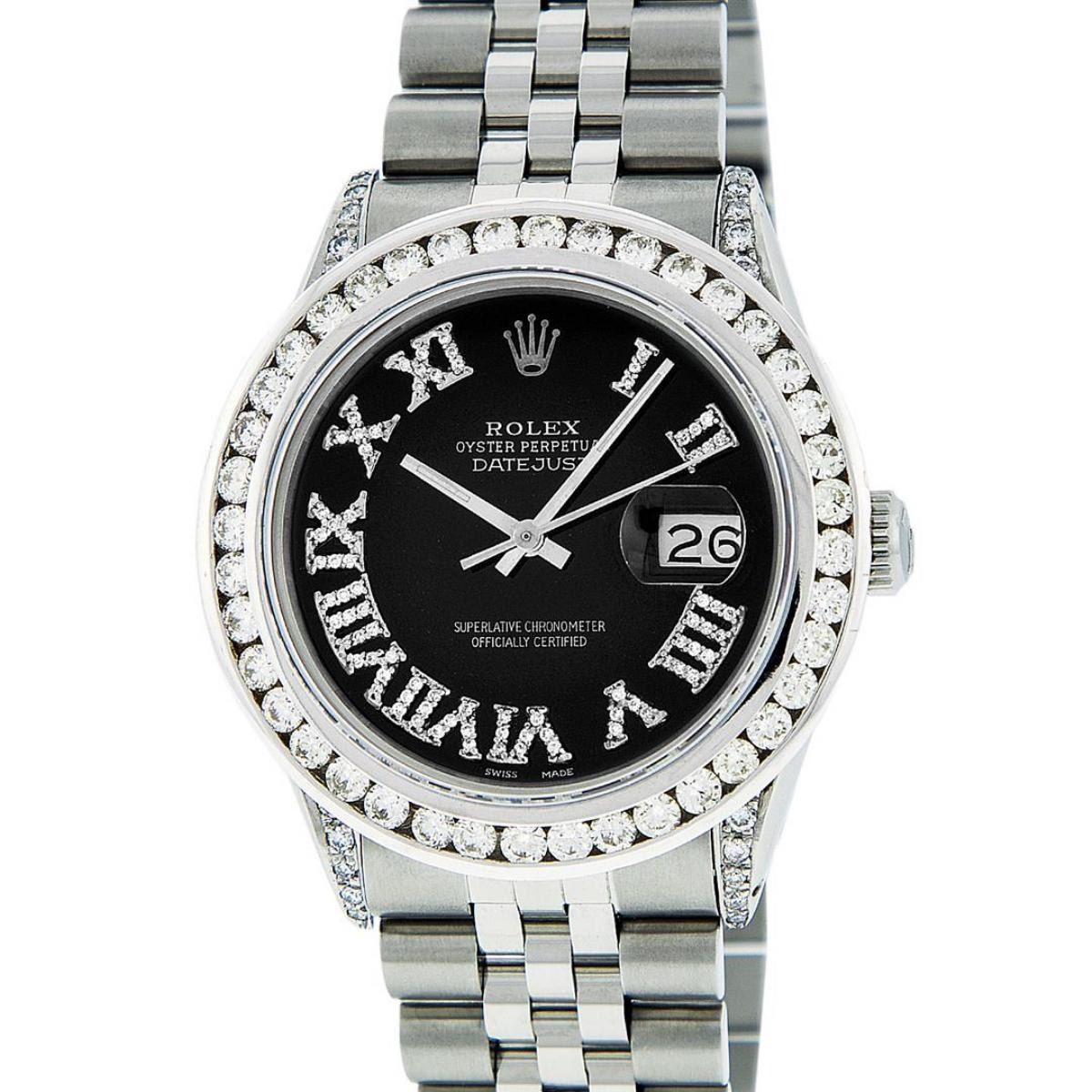 One Mens Stainless Steel Rolex Datejust Polished Bright with Satin Finish, Serviced & Electronically Tested, Stainless Steel Case: 36mm, Diamond Lugs: 24 Diamonds On Lugs, Color: G to H, Clarity: SI-VS. Stainless Steel Crown, New Custom Bezel: 18K White Gold 3.00 Ctw Diamond Bezel, Diamond Count: 40 Diamonds, Total Weight 3.0 Carat, Clarity: SI-VS, Color: G to H. Custom Crystal: New Scratch Resistant Synthetic Sapphire Cyclops Lens. Movement: Automatic Winding Movement Caliber 3035. Custom Dial: Black Roman Diamond Dial, Diamond Color: G To H In Color, Clarity: SI-VS. Date Window: 3 O'Clock Position Date Display, Quickset, Model: Quickset Datejust, Condition: G-6 Extra Fine. Bracelet: Stainless Steel Jubilee Band. Bright Polish & Satin Finish. 7.0 Inch Length, Adjustable. Standard Clasp, With Rolex Logo. This Watch Has Been Serviced Time Tested And Is In Excellent Condition It Is Free Of All Scratches And Dents. This Watch Also Comes With A Brand New Wooden Watch Winder.