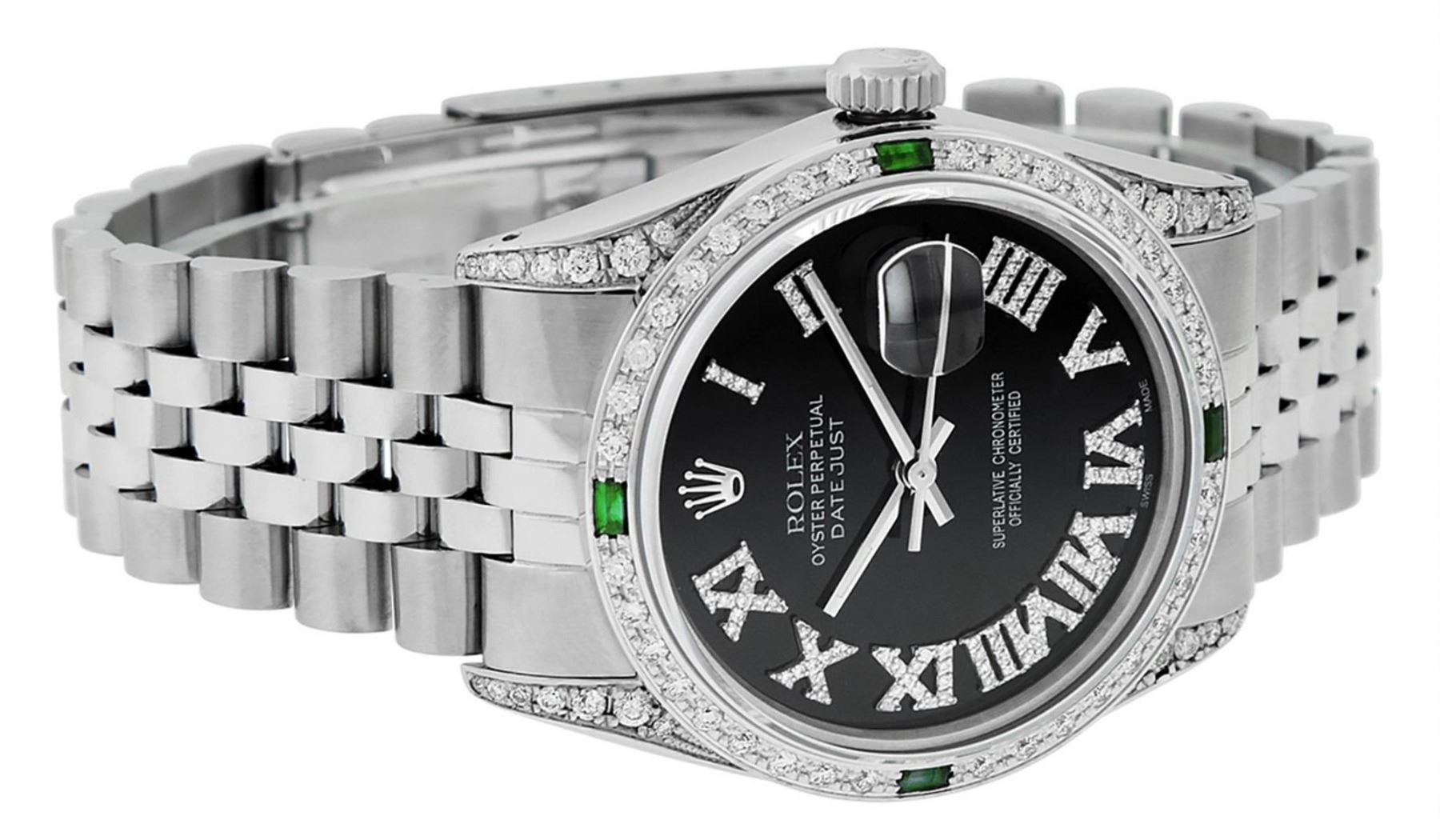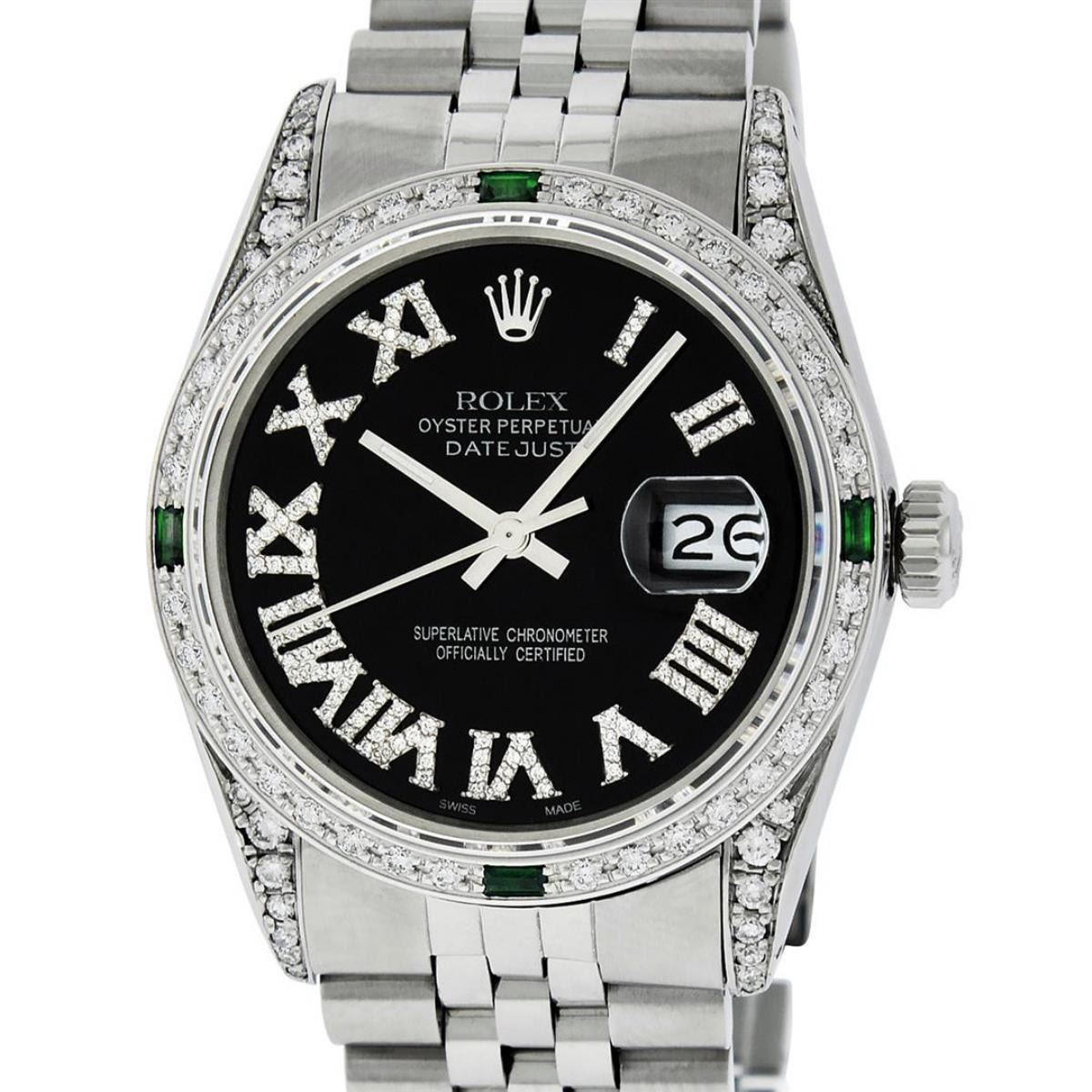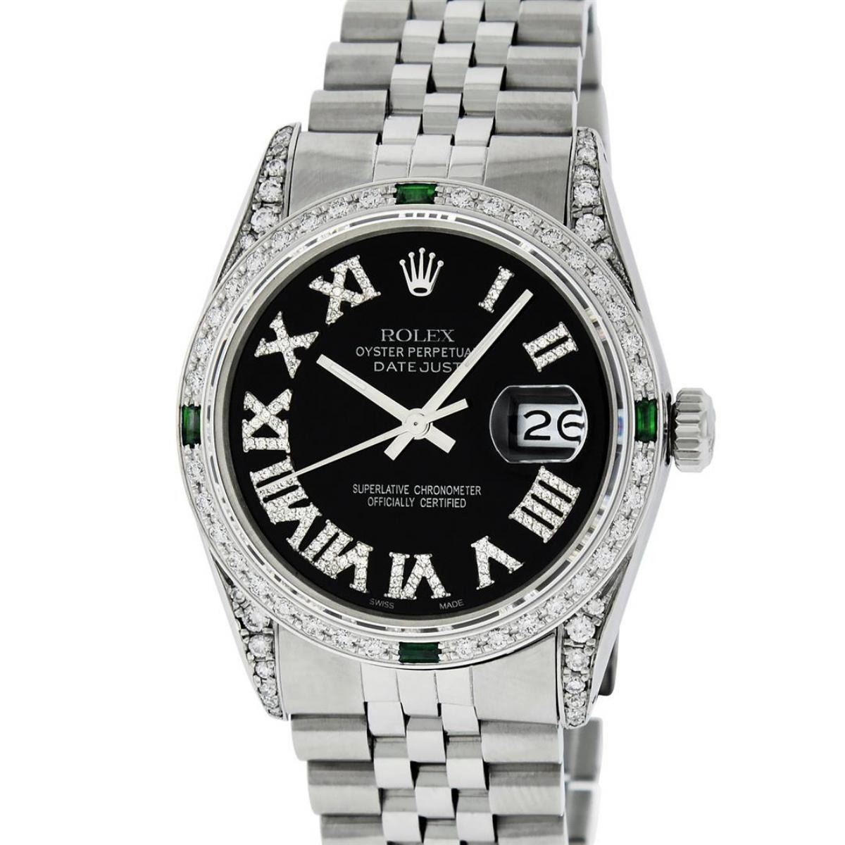 One Mens Stainless Steel Rolex Datejust Polished Bright with Satin Finish, Serviced & Electronically Tested, Stainless Steel Case: 36mm, Diamond Lugs: 24 Diamonds On Lugs, Color: G to H, Clarity: SI-VS. Stainless Steel Crown, New Custom Bezel: 18K White Gold Beadset + Emerald Diamond Bezel, Stone Count: 36 Diamonds + 4 Emeralds On Bezel, Total Bezel Weight 1.00 Carat, Clarity: SI-VS, Color: G to H. Custom Crystal: New Scratch Resistant Synthetic Sapphire Cyclops Lens. Movement: Automatic Winding Movement Caliber 3035. Custom Dial: Black Roman Diamond Dial, Diamond Color: G To H In Color, Clarity: SI-VS. Date Window: 3 O'Clock Position Date Display, Quickset, Model: Quickset Datejust, Condition: G-6 Extra Fine. Bracelet: Stainless Steel Jubilee Band. Bright Polish & Satin Finish. 7.0 Inch Length, Adjustable. Standard Clasp, With Rolex Logo. This Watch Has Been Serviced Time Tested And Is In Excellent Condition It Is Free Of All Scratches And Dents. This Watch Also Comes With A Rolex Box.