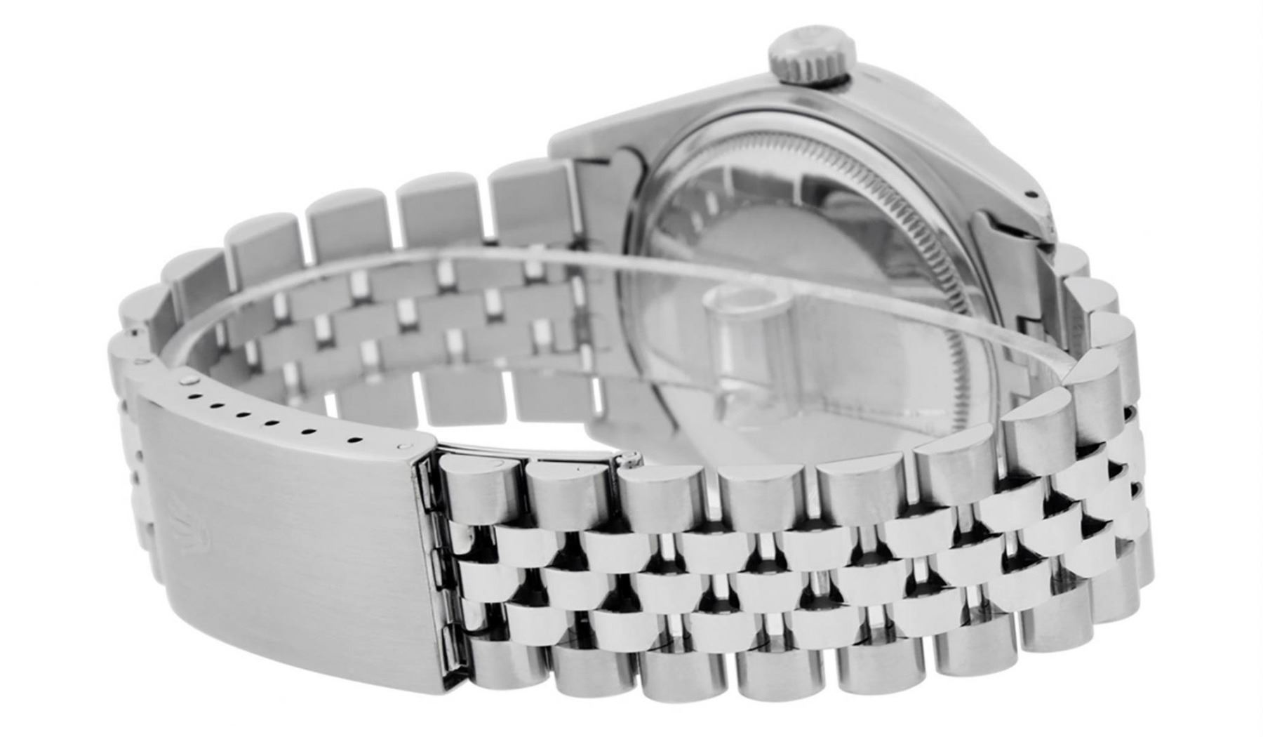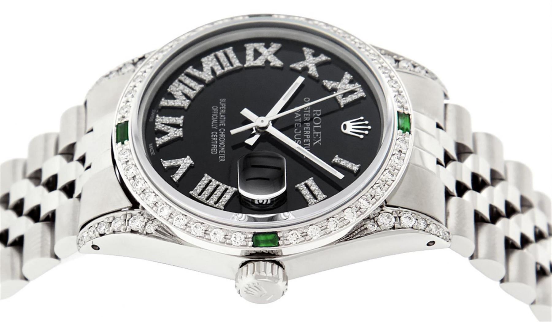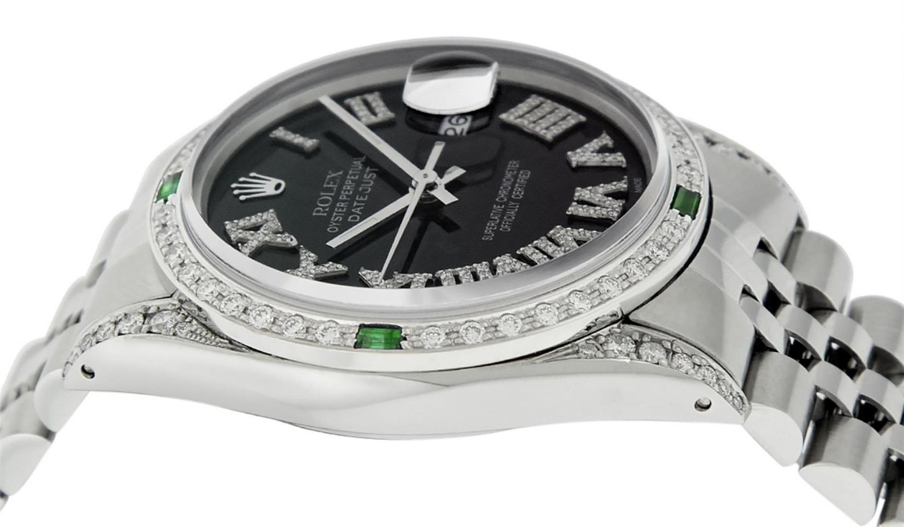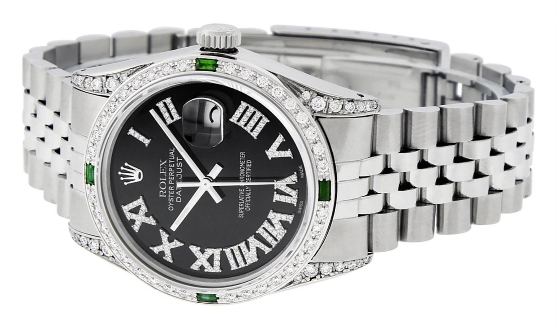 One Mens Stainless Steel Rolex Datejust Polished Bright with Satin Finish, Serviced & Electronically Tested, Stainless Steel Case: 36mm, Diamond Lugs: 24 Diamonds On Lugs, Color: G to H, Clarity: SI-VS. Stainless Steel Crown, New Custom Bezel: 18K White Gold Beadset + Emerald Diamond Bezel, Stone Count: 36 Diamonds + 4 Emeralds On Bezel, Total Bezel Weight 1.00 Carat, Clarity: SI-VS, Color: G to H. Custom Crystal: New Scratch Resistant Synthetic Sapphire Cyclops Lens. Movement: Automatic Winding Movement Caliber 3035. Custom Dial: Black Roman Diamond Dial, Diamond Color: G To H In Color, Clarity: SI-VS. Date Window: 3 O'Clock Position Date Display, Quickset, Model: Quickset Datejust, Condition: G-6 Extra Fine. Bracelet: Stainless Steel Jubilee Band. Bright Polish & Satin Finish. 7.0 Inch Length, Adjustable. Standard Clasp, With Rolex Logo. This Watch Has Been Serviced Time Tested And Is In Excellent Condition It Is Free Of All Scratches And Dents. This Watch Also Comes With A Rolex Box.