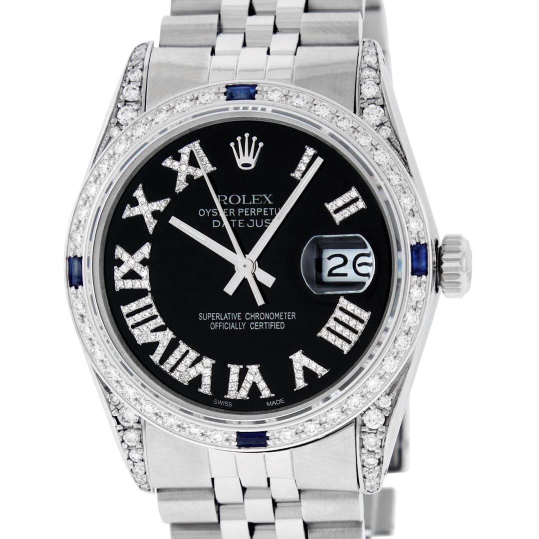 One Mens Pre Owned Stainless Steel Rolex Quickset Datejust Polished Bright with Satin Finish, Serviced And Electronically Tested, Stainless Steel Case: 36mm, Custom Diamond Lugs: 24 Diamonds On Lugs. Stainless Steel Crown, New Custom Bezel: 18K White Gold Beadset + Sapphire Diamond Bezel, Diamond Count: 36 Diamonds + 4 Sapphires On Bezel. Custom Crystal: New Sapphire With Date Window. Rolex Movement: Automatic Winding Movement 3035. Custom Dial: Custom Black Dial With Added Roman Diamond Hour Markers. Date Window: 3 O'Clock Position Date Display, Quickset, Model: Quickset Datejust, Condition: G-6 Extra Fine. Rolex Bracelet: Stainless Steel Jubilee Band. Bright Polish And Satin Finish. 7.0 Inch Length, Adjustable. Standard Clasp, With Rolex Logo. This Watch Has Been Serviced Time Tested And Is In Excellent Condition It Is Free Of All Scratches And Dents.