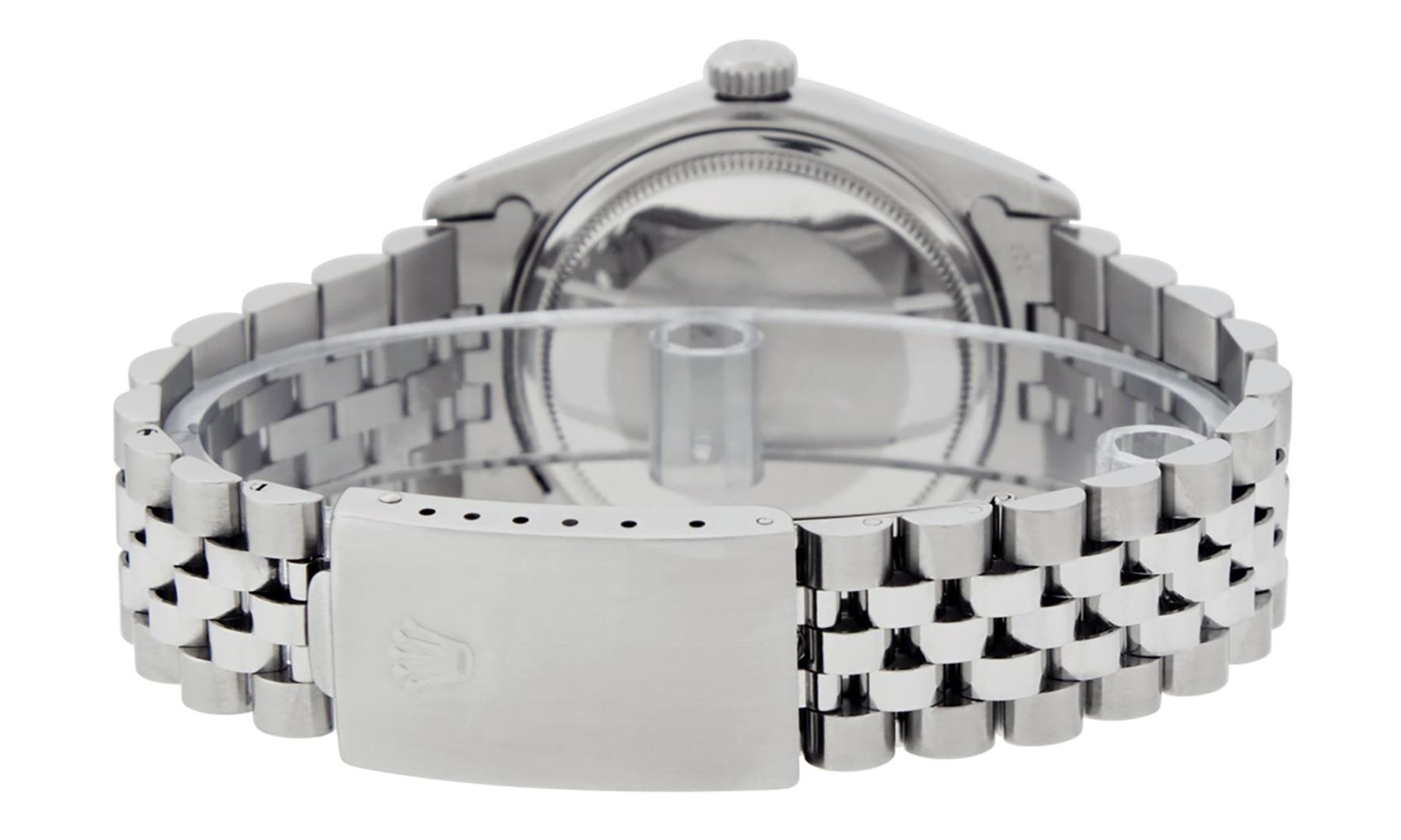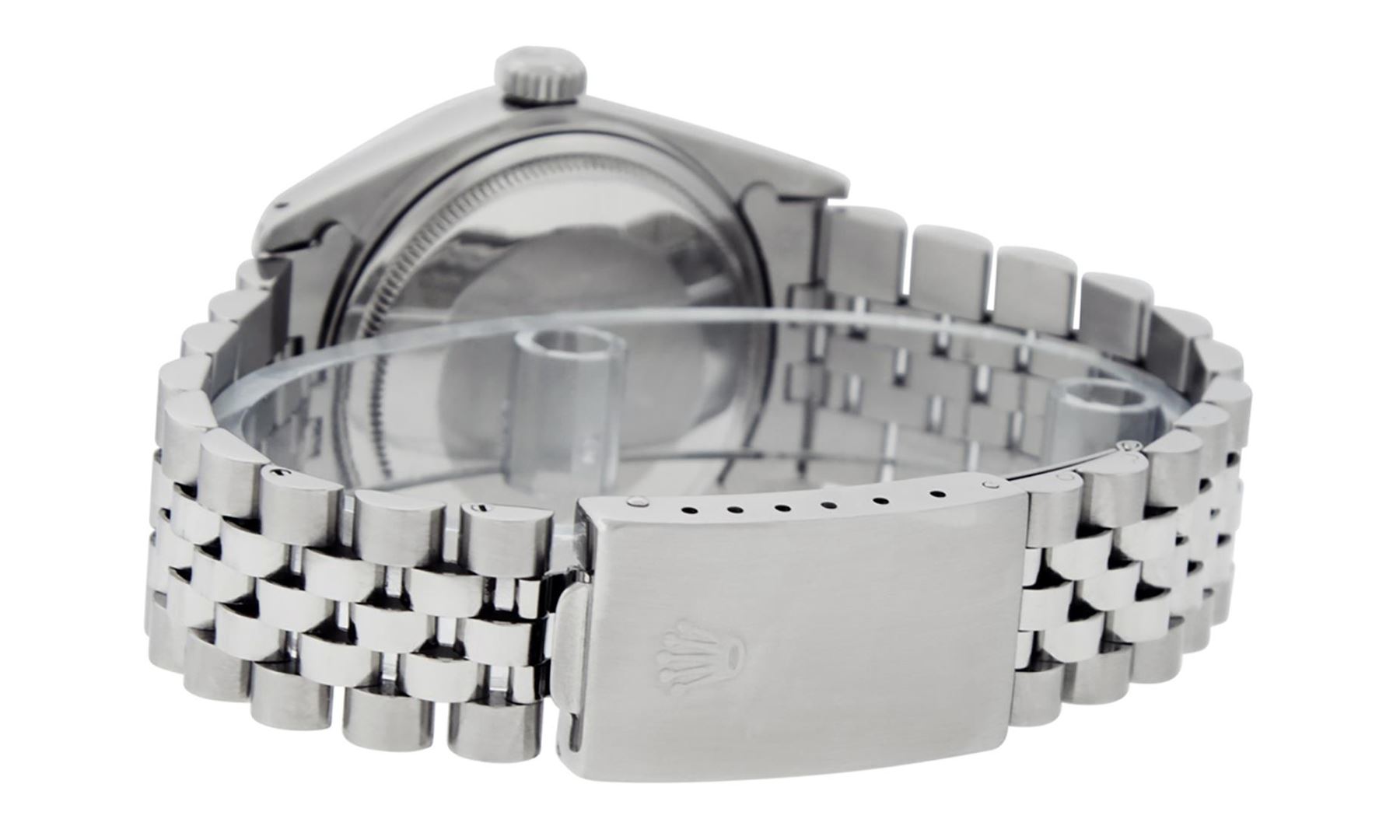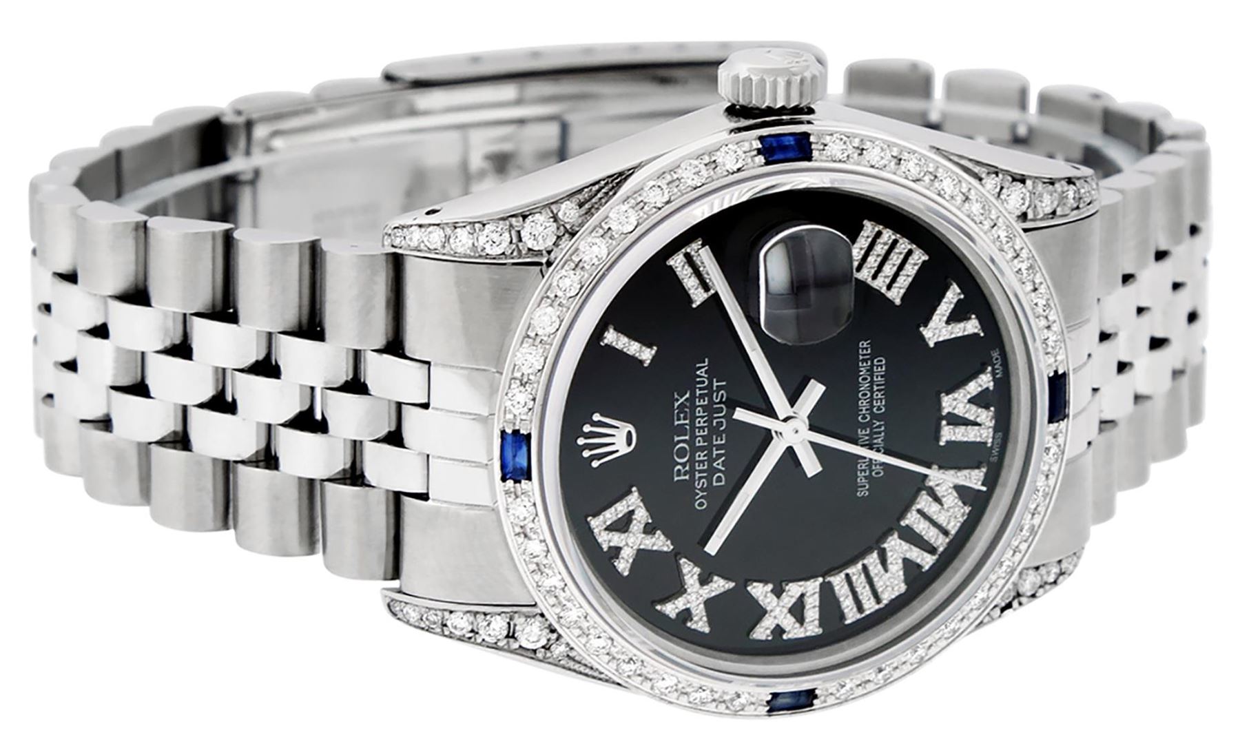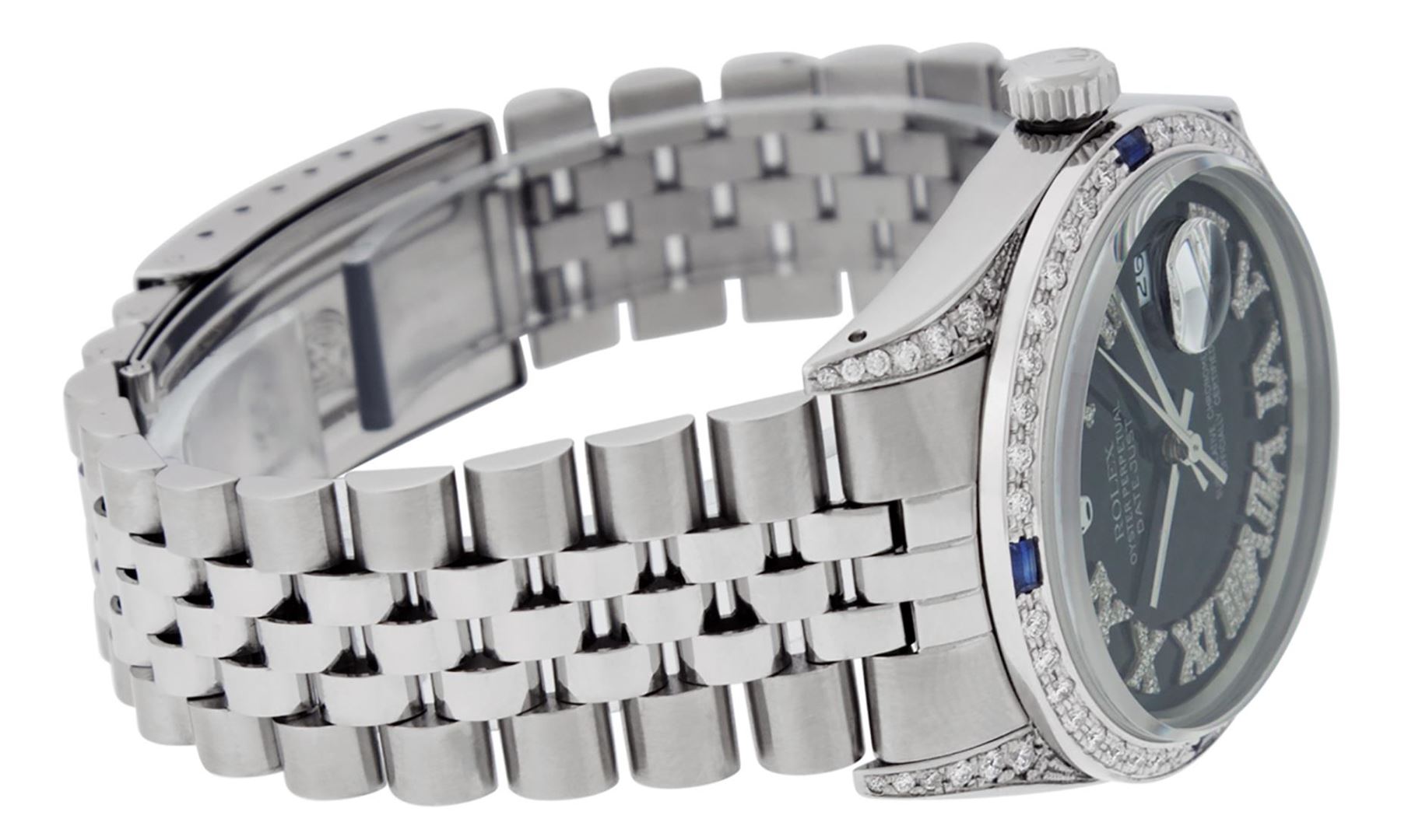 One Mens Pre Owned Stainless Steel Rolex Quickset Datejust Polished Bright with Satin Finish, Serviced And Electronically Tested, Stainless Steel Case: 36mm, Custom Diamond Lugs: 24 Diamonds On Lugs. Stainless Steel Crown, New Custom Bezel: 18K White Gold Beadset + Sapphire Diamond Bezel, Diamond Count: 36 Diamonds + 4 Sapphires On Bezel. Custom Crystal: New Sapphire With Date Window. Rolex Movement: Automatic Winding Movement 3035. Custom Dial: Custom Black Dial With Added Roman Diamond Hour Markers. Date Window: 3 O'Clock Position Date Display, Quickset, Model: Quickset Datejust, Condition: G-6 Extra Fine. Rolex Bracelet: Stainless Steel Jubilee Band. Bright Polish And Satin Finish. 7.0 Inch Length, Adjustable. Standard Clasp, With Rolex Logo. This Watch Has Been Serviced Time Tested And Is In Excellent Condition It Is Free Of All Scratches And Dents.