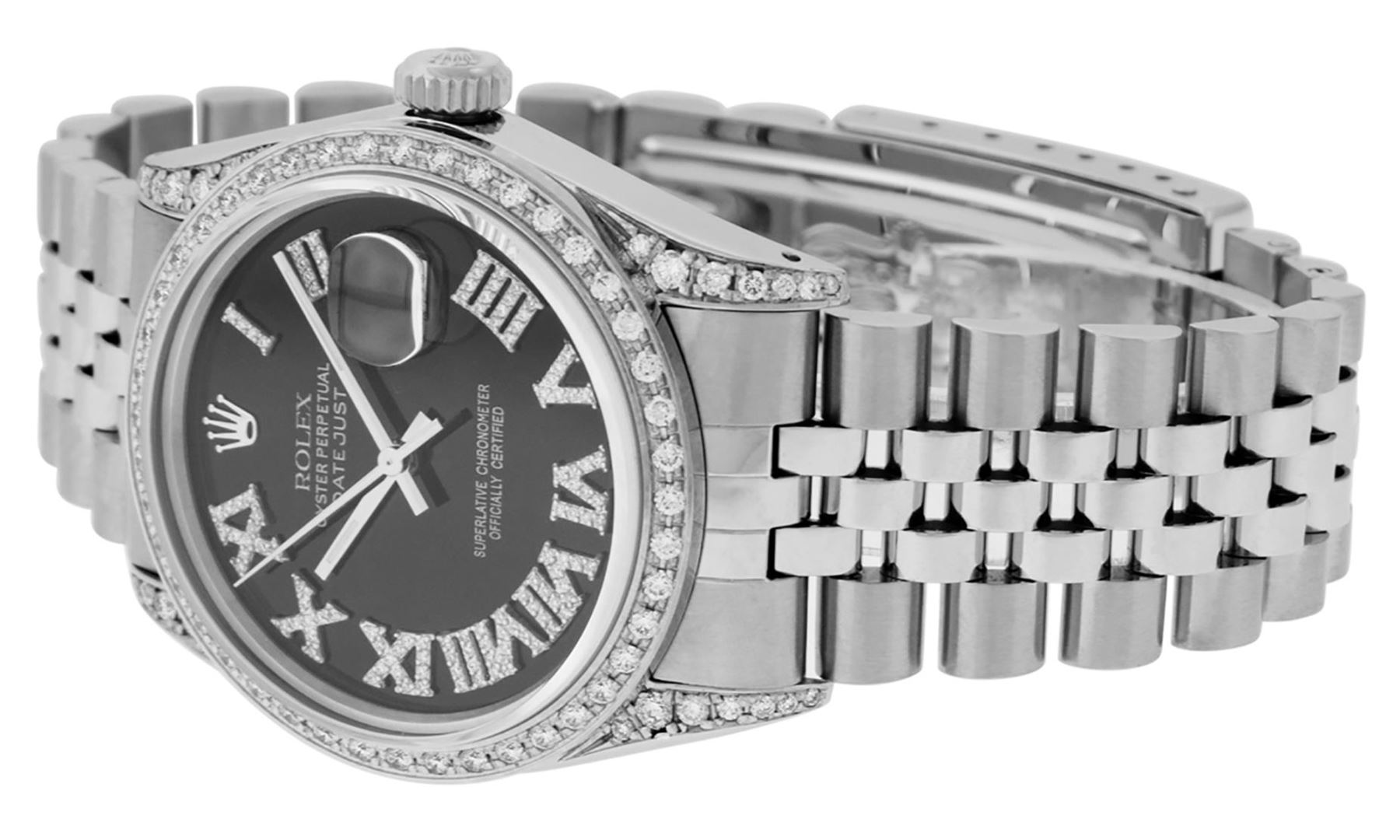 One Mens Pre Owned Stainless Steel Rolex Datejust Polished Bright with Satin Finish, Serviced And Electronically Tested, Rolex Stainless Steel Case: 36mm, Custom Diamond Lugs: 24 Added Diamonds On Lugs. Rolex Stainless Steel Crown, New Custom Bezel: 18K White Gold Beadset Diamond Bezel, Diamond Count: 44 Diamonds On Bezel. Custom Crystal: New Sapphire With Magnified Date Window. Rolex Movement: Automatic Winding Movement 3035. Custom Dial: Custom Black Dial With Added Roman Diamonds. Date Window: 3 O'Clock Position Date Display, Quickset, Model: Quickset Datejust, Condition: G-6 Extra Fine. Rolex Bracelet: Stainless Steel Jubilee Band. Bright Polish And Satin Finish. 7.0 Inch Length, Adjustable. Standard Clasp, With Rolex Logo. This Watch Has Been Serviced Time Tested And Is In Excellent Condition It Is Free Of All Scratches And Dents.