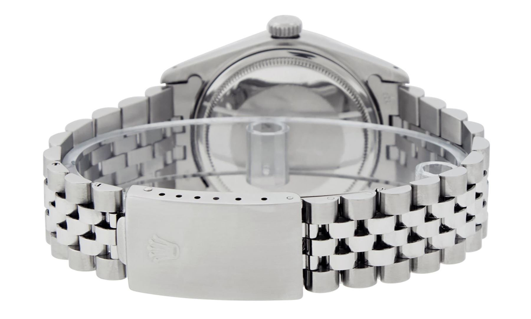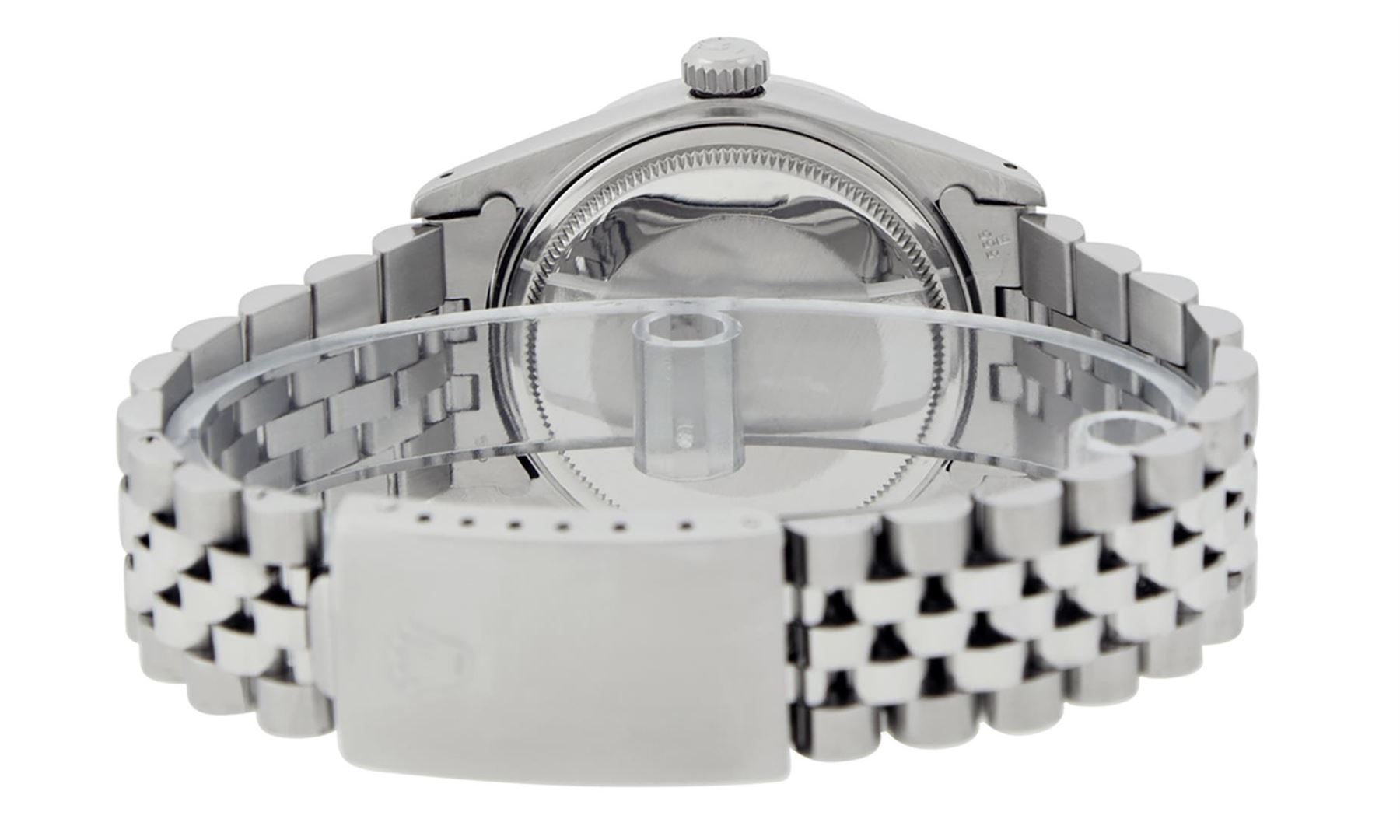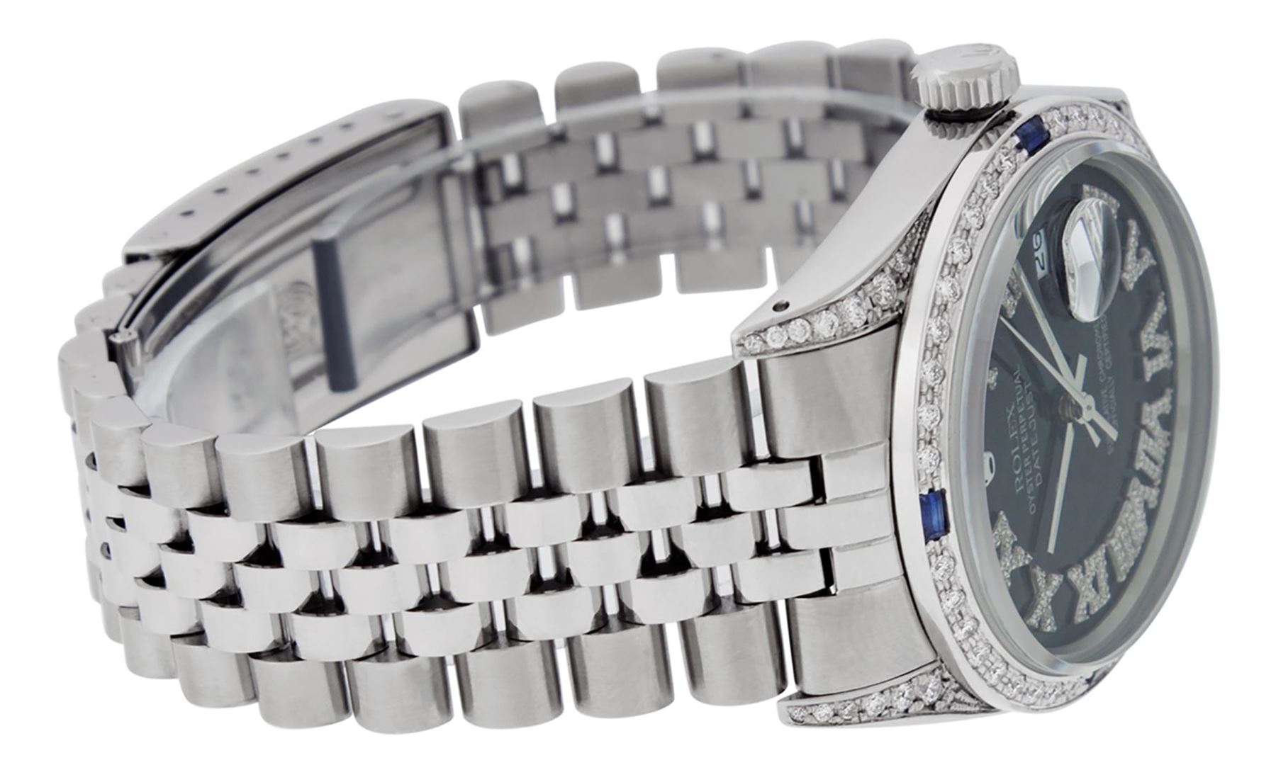 One Mens Stainless Steel Rolex Quickset Datejust Polished Bright with Satin Finish, Serviced & Electronically Tested, Stainless Steel Case: 36mm, Custom Diamond Lugs: 24 Diamonds On Lugs, Color: G to H, Clarity: SI-VS. Stainless Steel Crown, New Custom Bezel: 18K White Gold Beadset + Sapphire Diamond Bezel, Diamond Count: 36 Diamonds + 4 Sapphires On Bezel, Total Bezel Weight 1.00 Carat, Clarity: SI-VS, Color: G to H. Custom Crystal: New Scratch Resistant Synthetic Sapphire Cyclops Lens. Movement: Automatic Winding Movement. Custom Dial: Black Roman Diamond Dial, Diamond Color: G To H In Color, Clarity: SI-VS. Date Window: 3 O'Clock Position Date Display, Quickset, Model: Quickset Datejust, Condition: G-6 Extra Fine. Bracelet: Stainless Steel Jubilee Band. Bright Polish & Satin Finish. 7.0 Inch Length, Adjustable. Standard Clasp, With Rolex Logo. This Watch Has Been Serviced Time Tested And Is In Excellent Condition It Is Free Of All Scratches And Dents.