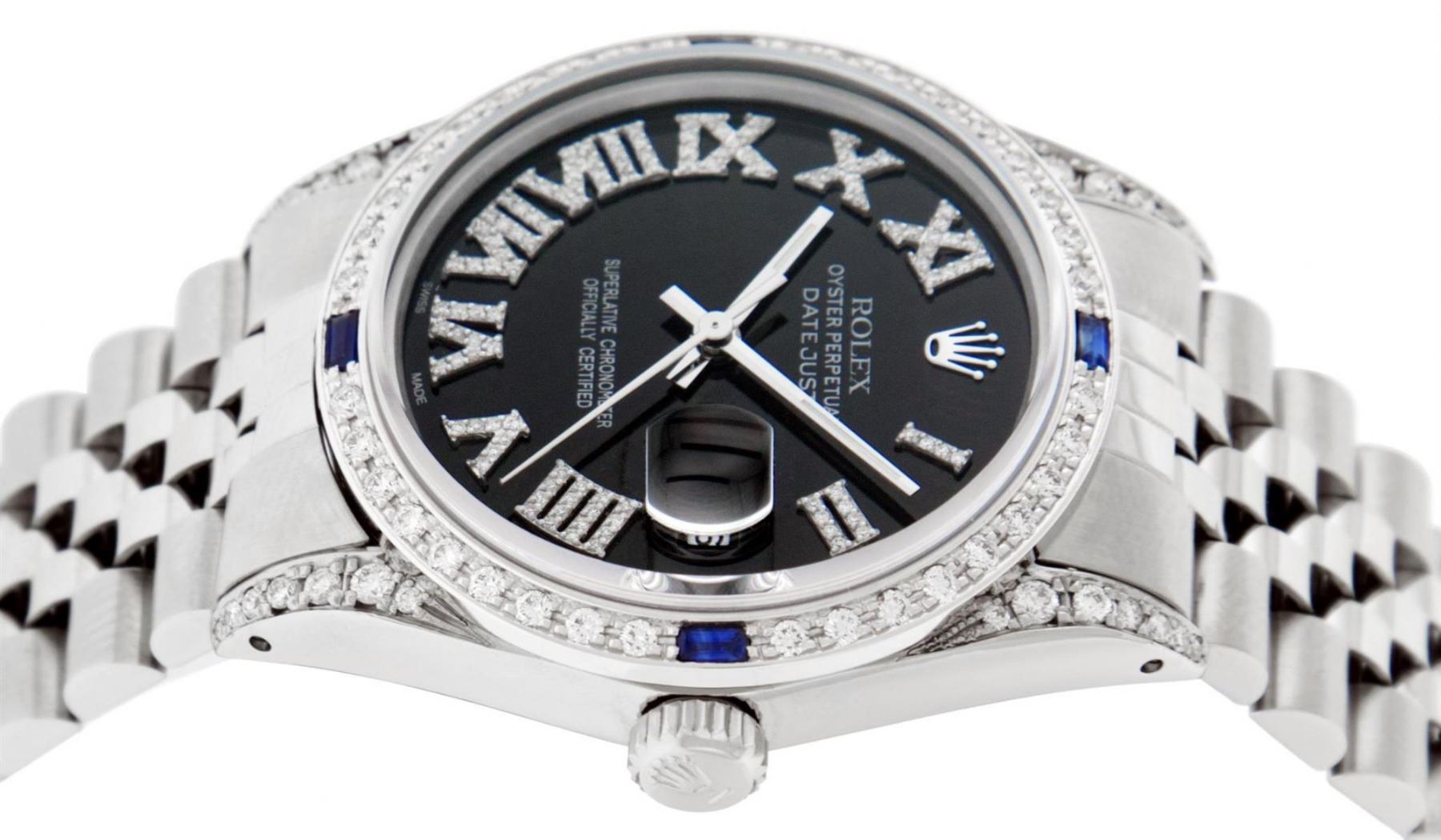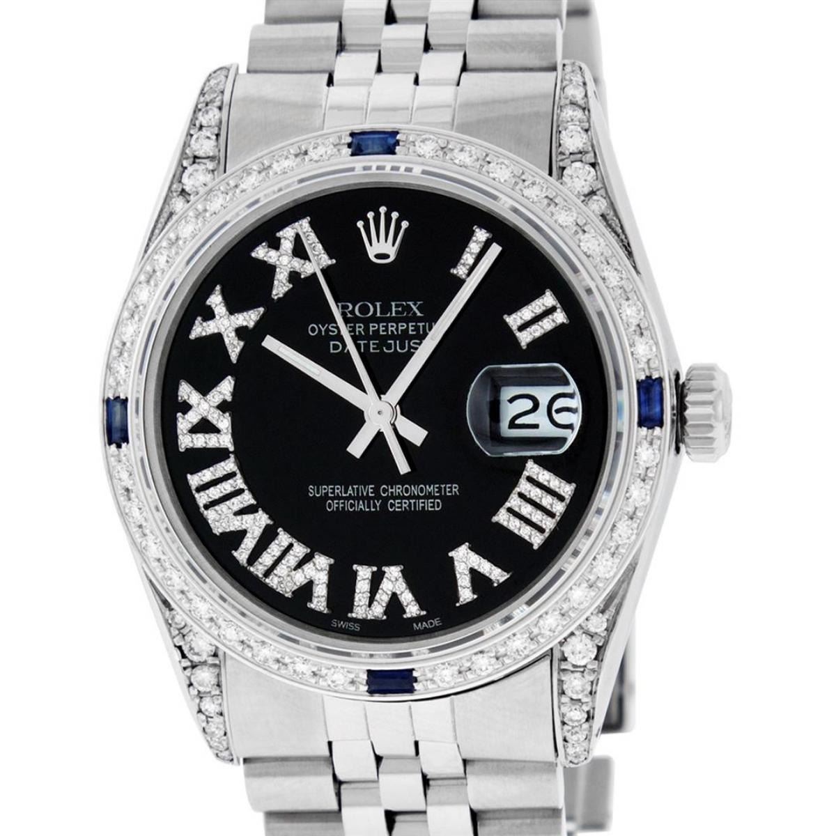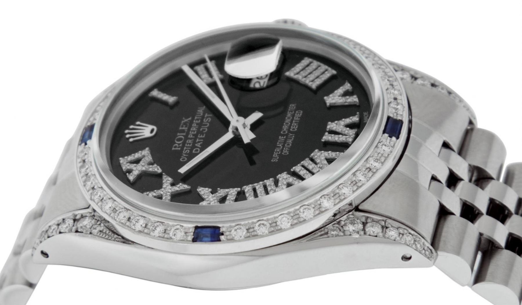 One Mens Stainless Steel Rolex Datejust Polished Bright with Satin Finish, Serviced & Electronically Tested, Stainless Steel Case: 36mm, Diamond Lugs: 24 Diamonds On Lugs, Color: G to H, Clarity: SI-VS. Stainless Steel Crown, New Custom Bezel: 18K White Gold Beadset + Sapphire Diamond Bezel, Diamond Count: 36 Diamonds + 4 Sapphires On Bezel, Total Bezel Weight 1.00 Carat, Clarity: SI-VS, Color: G to H. Custom Crystal: New Scratch Resistant Synthetic Sapphire Cyclops Lens. Movement: Automatic Winding Movement Caliber 3035. Custom Dial: Black Roman Diamond Dial, Diamond Color: G To H In Color, Clarity: SI-VS. Date Window: 3 O'Clock Position Date Display, Quickset, Model: Quickset Datejust, Condition: G-6 Extra Fine. Bracelet: Stainless Steel Jubilee Band. Bright Polish & Satin Finish. 7.0 Inch Length, Adjustable. Standard Clasp, With Rolex Logo. This Watch Has Been Serviced Time Tested And Is In Excellent Condition It Is Free Of All Scratches And Dents. This Watch Also Comes With A Brand New Wooden Watch Winder.