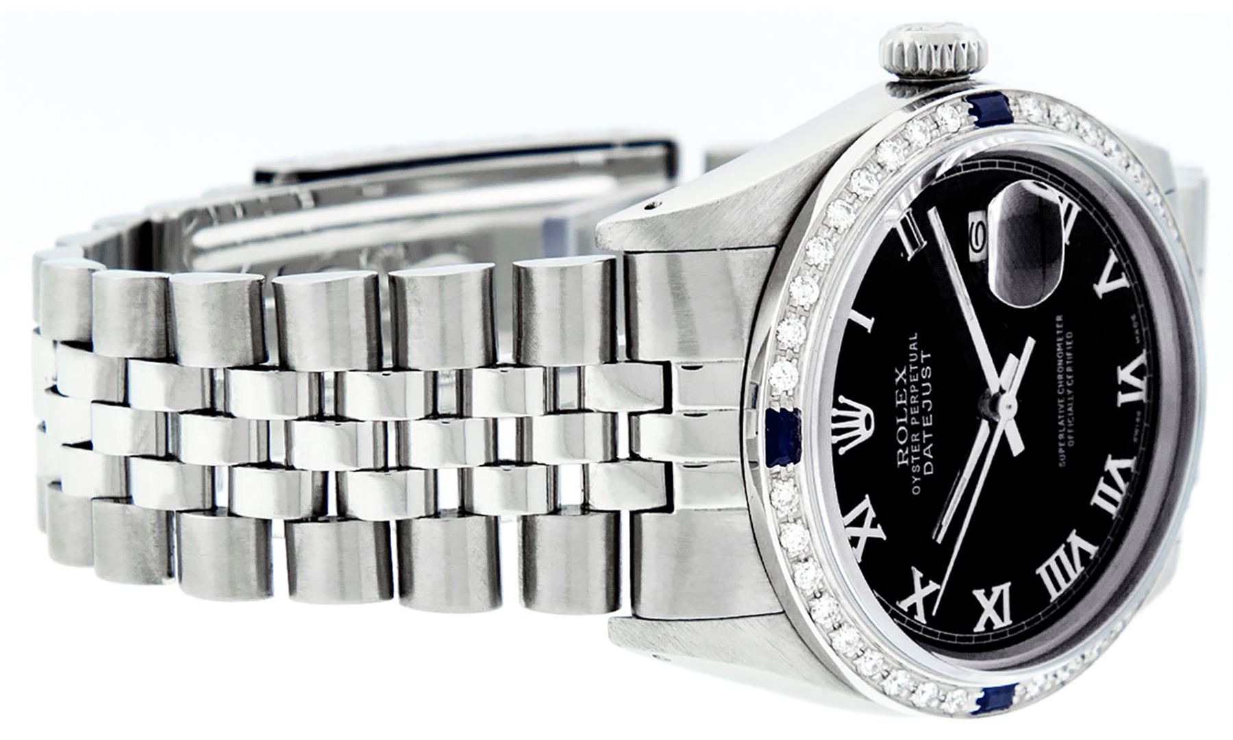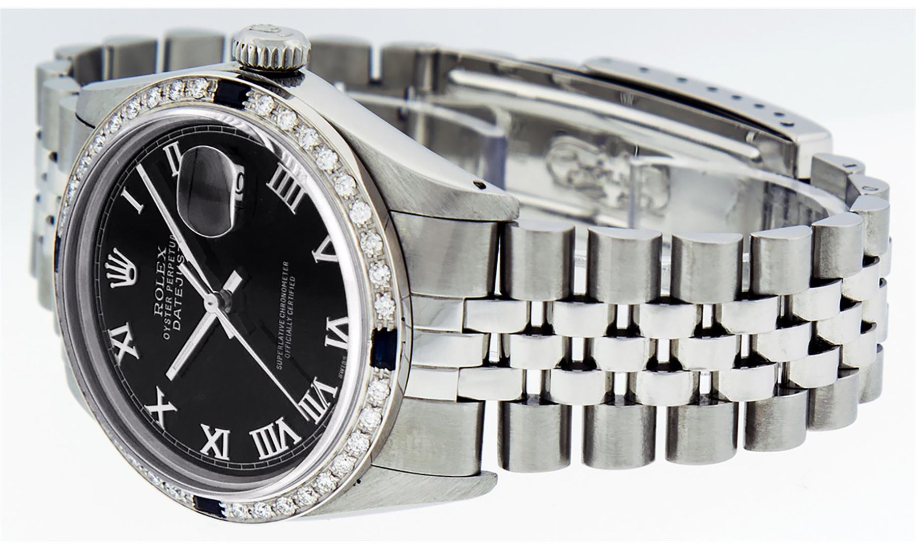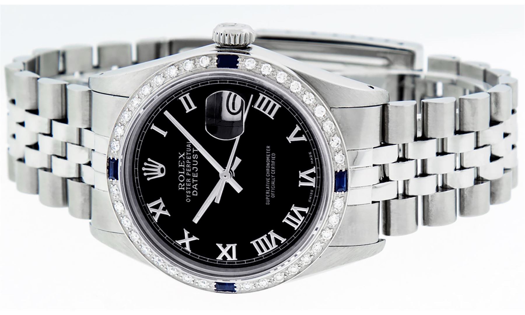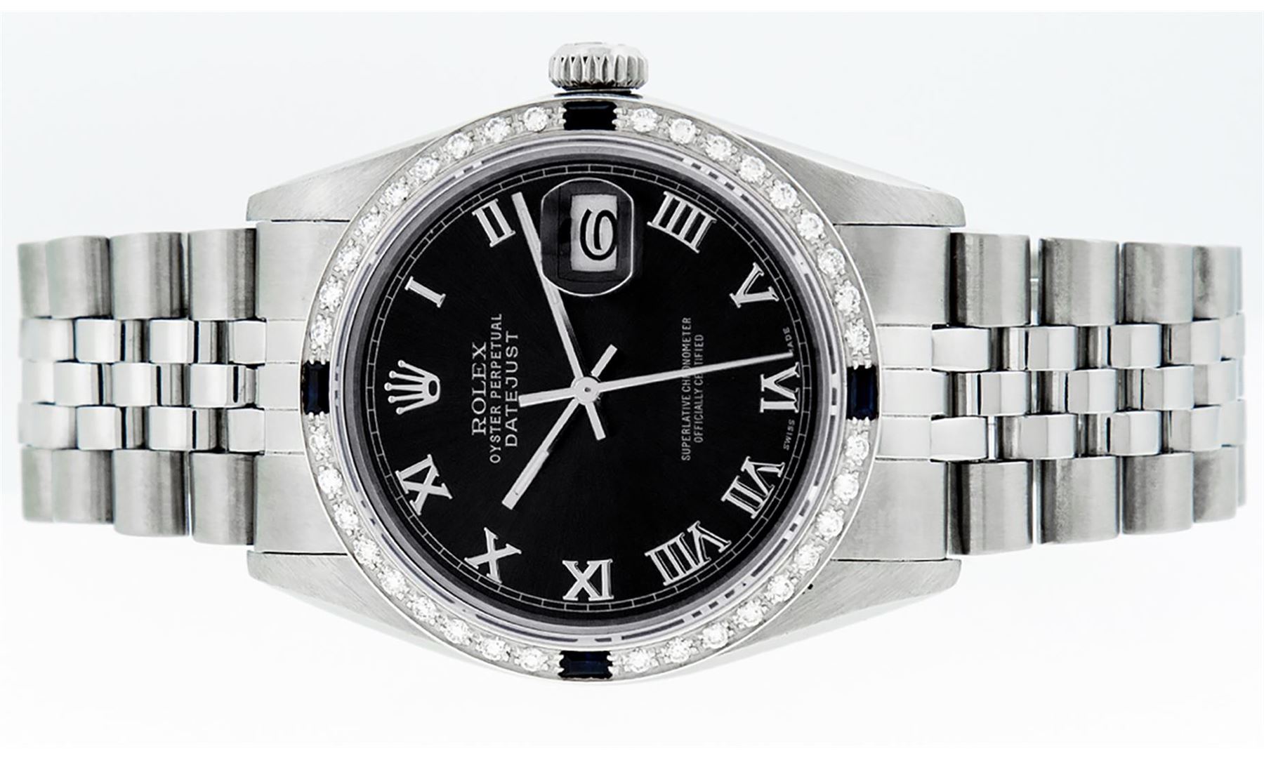 One Mens Stainless Steel Rolex Datejust Polished Bright with Satin Finish, This Watch Has Been Serviced & Electronically Tested, Stainless Steel Case: 36mm, Stainless Steel Crown, Custom Bezel: New 18K White Gold Sapphire Beadset Diamond Bezel, Diamond + Gem Count: 36 Diamonds + 4 Sapphires, Total Weight 1.00 Carat, Clarity: SI-VS, Color: G to H. Custom Crystal: New Scratch Resistant Synthetic Sapphire Cyclops Lens. Custom Hands: New Luminescent Hands. Movement: Automatic Winding Movement Caliber 3035. Custom Dial: Black Roman With Square Track. Date Window: 3 O'Clock Position Date Display, Quickset, Model: Datejust, Condition: G-6 Extra Fine. Bracelet: Stainless Steel Jubilee Band. Bracelet: 7.0 Inch Length, Adjustable. Standard Clasp, With Rolex Logo. This Watch Has Been Serviced Time Tested And Is In Excellent Condition It Is Free Of All Scratches And Dents.
