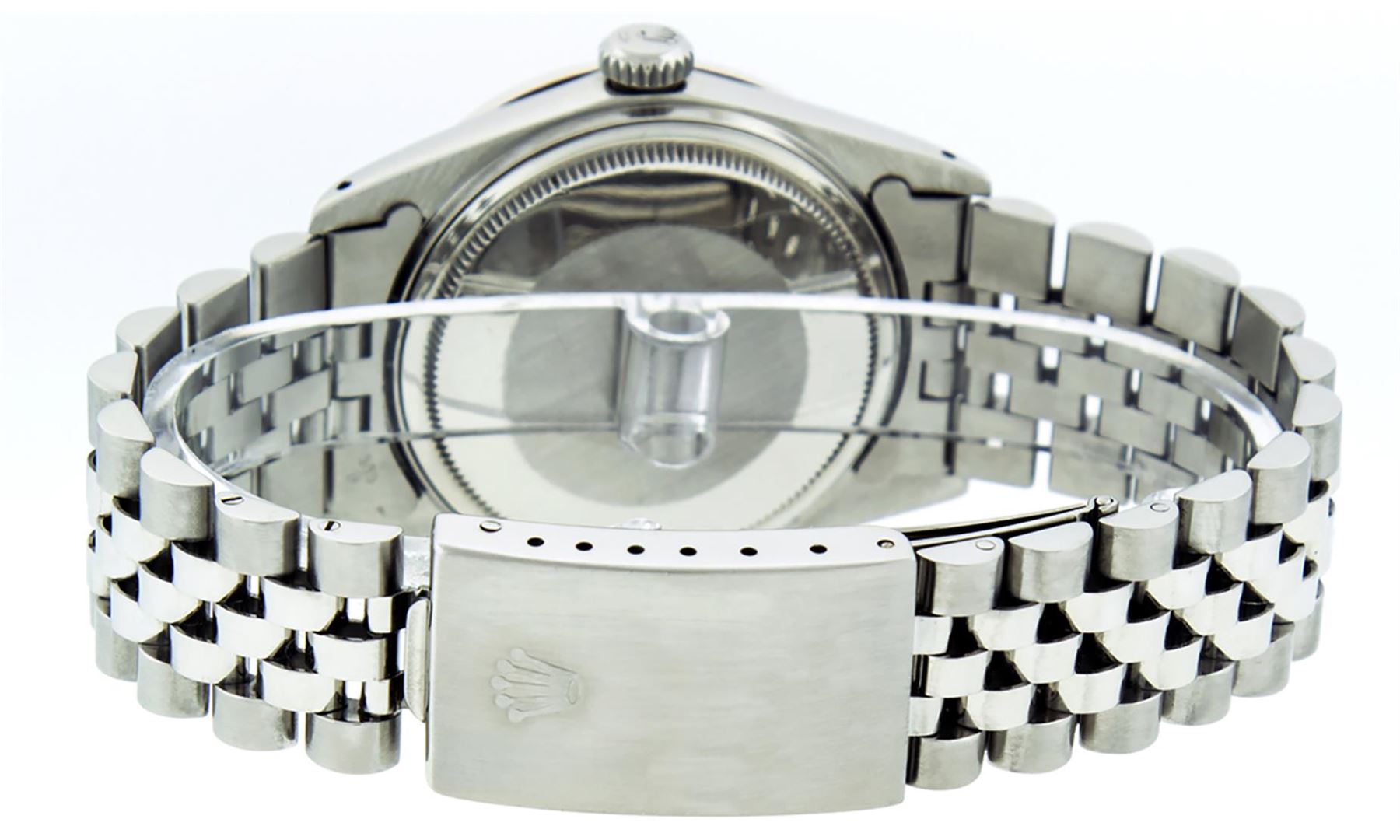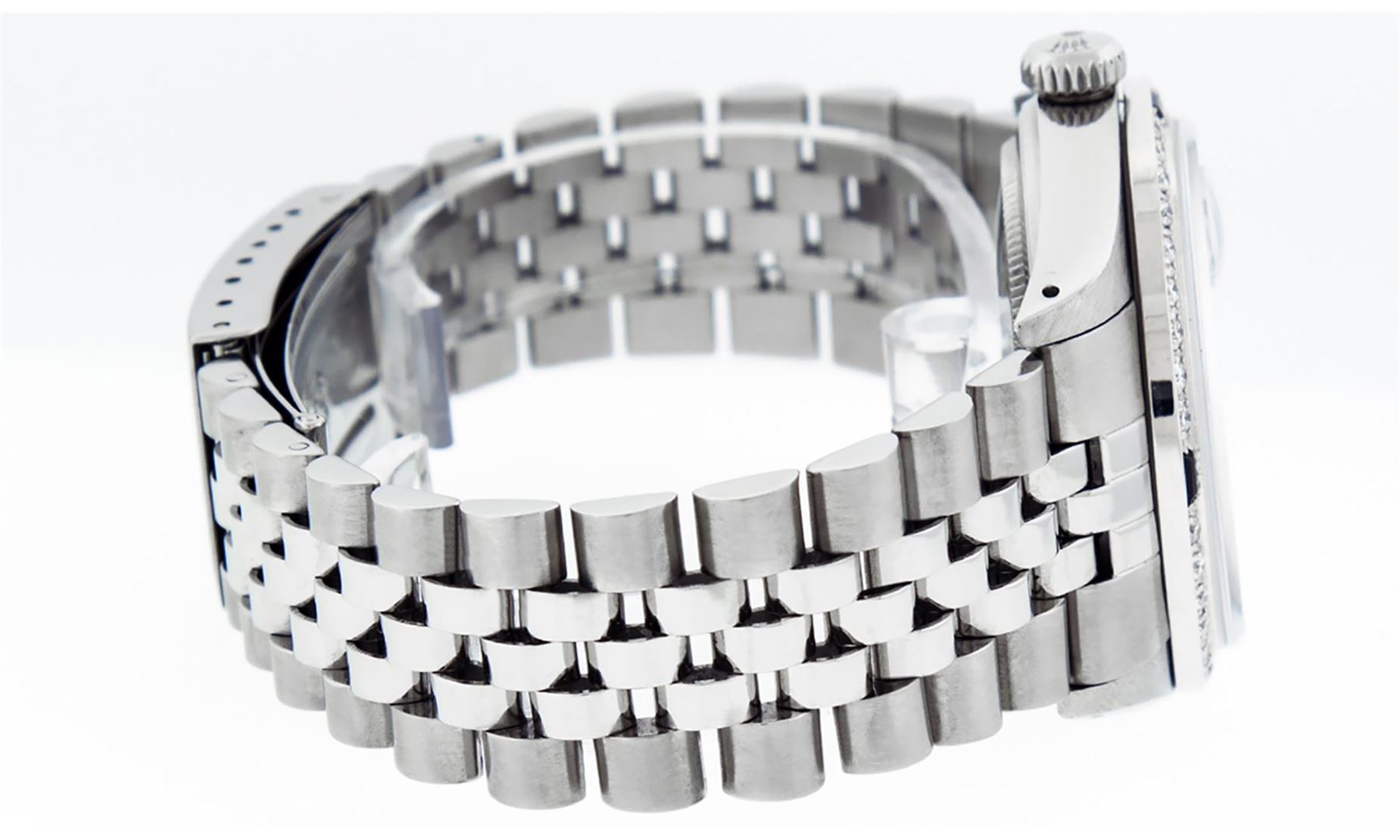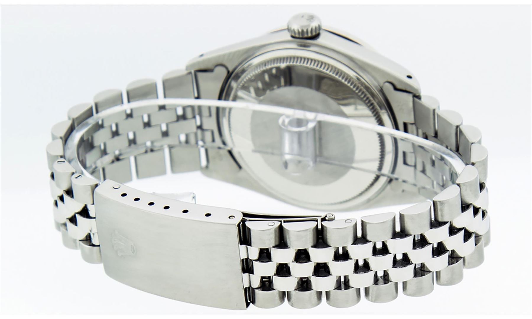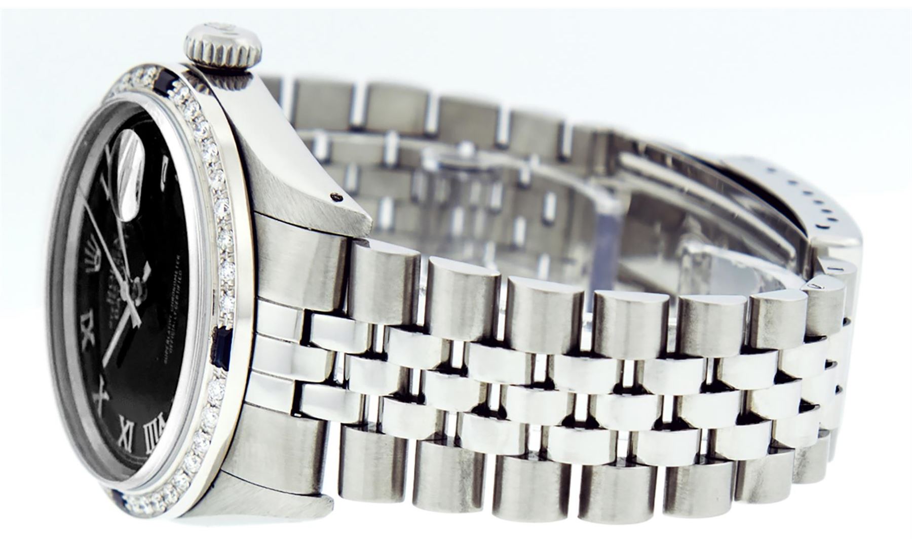 One Mens Stainless Steel Rolex Datejust Polished Bright with Satin Finish, This Watch Has Been Serviced & Electronically Tested, Stainless Steel Case: 36mm, Stainless Steel Crown, Custom Bezel: New 18K White Gold Sapphire Beadset Diamond Bezel, Diamond + Gem Count: 36 Diamonds + 4 Sapphires, Total Weight 1.00 Carat, Clarity: SI-VS, Color: G to H. Custom Crystal: New Scratch Resistant Synthetic Sapphire Cyclops Lens. Custom Hands: New Luminescent Hands. Movement: Automatic Winding Movement Caliber 3035. Custom Dial: Black Roman With Square Track. Date Window: 3 O'Clock Position Date Display, Quickset, Model: Datejust, Condition: G-6 Extra Fine. Bracelet: Stainless Steel Jubilee Band. Bracelet: 7.0 Inch Length, Adjustable. Standard Clasp, With Rolex Logo. This Watch Has Been Serviced Time Tested And Is In Excellent Condition It Is Free Of All Scratches And Dents.