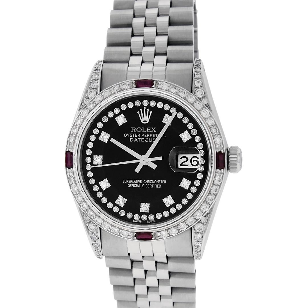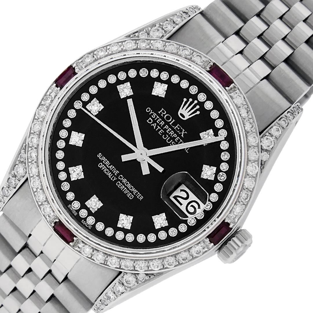 One Mens Pre Owned Rolex Datejust Polished Bright with Satin Finish, Serviced And Electronically Tested, Stainless Steel Case: 36mm, Custom Diamond Lugs: 28 Diamonds On Lugs, Stainless Steel Crown, Custom Bezel: 18K White Gold Diamond + Ruby Beadset, Diamond Count: 36 Diamonds + 4 Rubies. Custom Crystal: New Sapphire With Magnified Date Window. Custom Hands: New Luminescent Hands. Rolex Movement: Automatic Winding Movement 3035. Custom Dial:Custom Black Dial With Added Diamonds, Stone Count: 58 Diamonds In Dial. Date Window: 3 O'Clock Position Date Display, Quickset, Model: Datejust, Condition: G-6 Extra Fine. Rolex Bracelet: Stainless Steel Jubilee Band. Bright Polish And Satin Finish. 7.0 Inch Length, Adjustable. Standard Clasp, With Rolex Logo. This Watch Has Been Serviced And Polished And Its Free Of All Dents And Scratches.