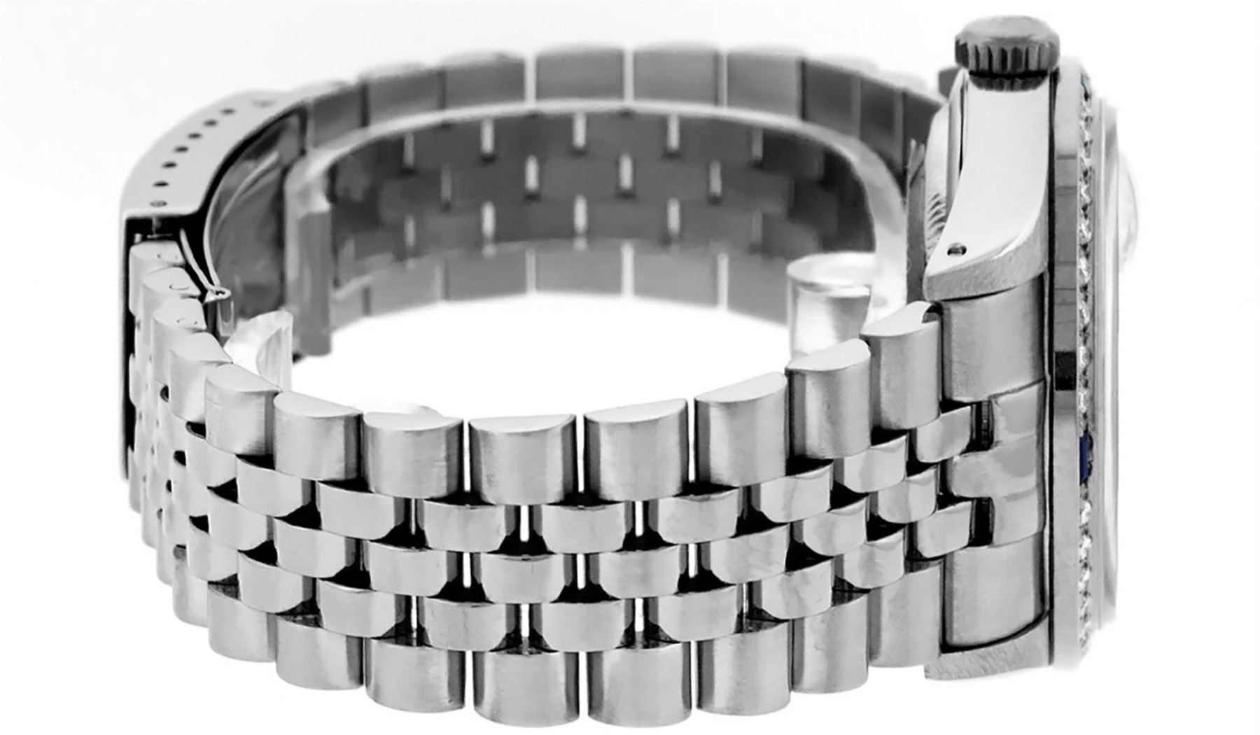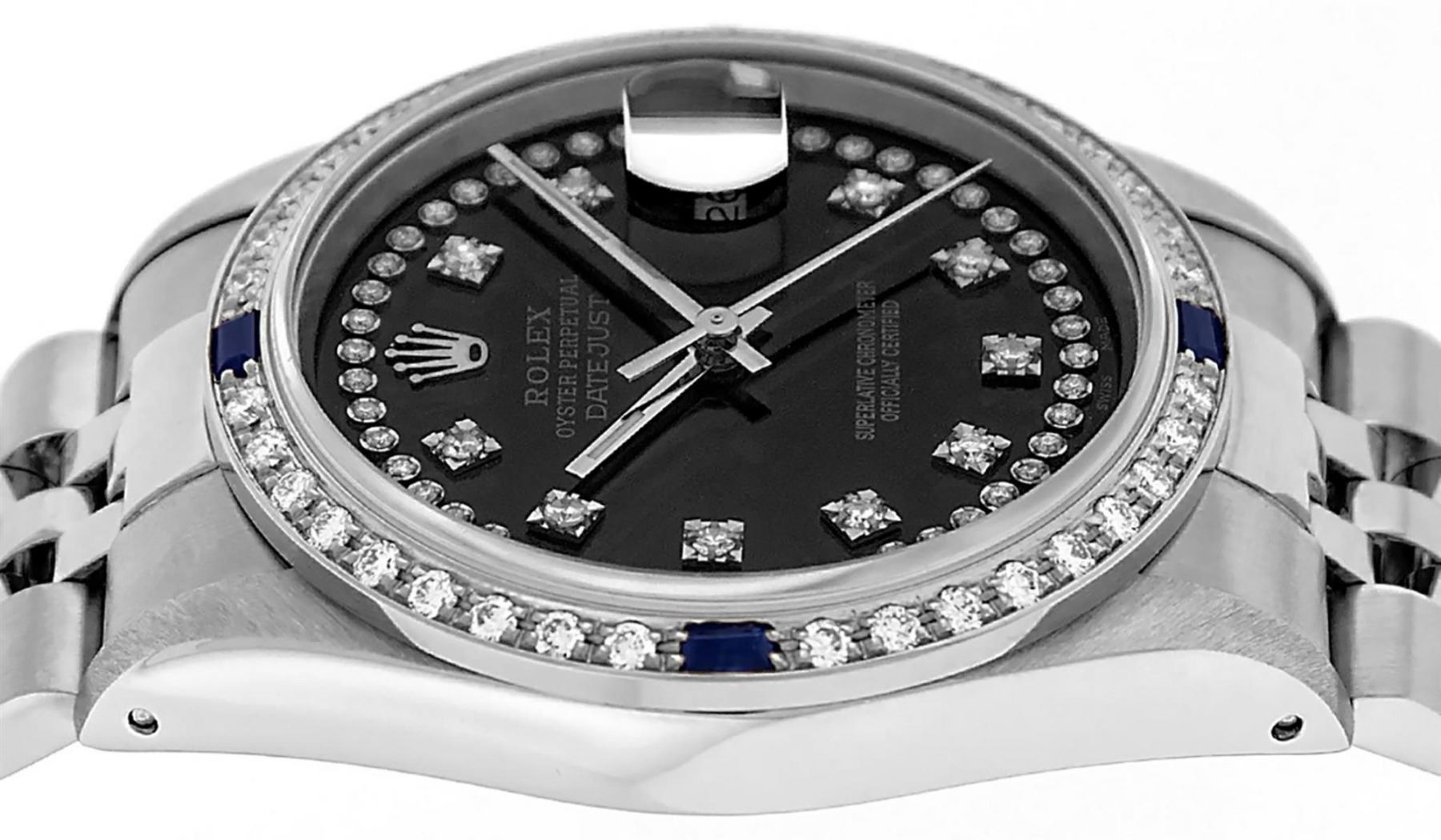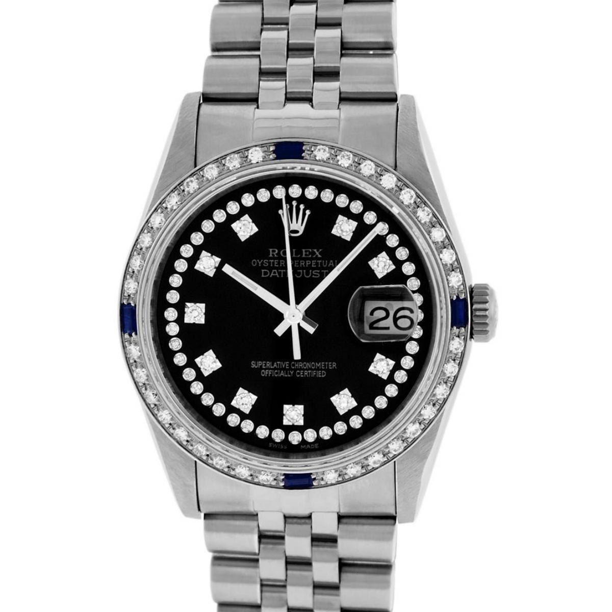 One Mens Stainless Steel Rolex Datejust Polished, Serviced & Electronically Tested, Stainless Steel Case: 36mm, Stainless Steel Crown, Custom Bezel: New 18K White Gold Sapphire Beadset Diamond Bezel, Diamond + Gem Count: 36 Diamonds + 4 Sapphires, Total Weight 1.00 Carat, Clarity: SI-VS, Color: G to H. Custom Crystal: New Scratch Resistant Synthetic Sapphire Cyclops Lens. Custom Hands: New Luminescent Hands. Movement: Automatic Winding Movement Caliber 3035. Custom Dial: Black String Diamond Dial, Diamond Count: 58 Diamonds in Dial, G To H In Color, Clarity: SI-VS. Date Window: 3 O'Clock Position Date Display, Quickset, Model: Datejust. Condition: G-6 Extra Fine. Bracelet: Stainless Steel Jubilee Band. Bright Polish & Satin Finish. 7.0 Inch Length, Adjustable. Standard Clasp, With Rolex Logo. This Watch Has Been Serviced Time Tested And Is In Excellent Condition It Is Free Of All Scratches And Dents.