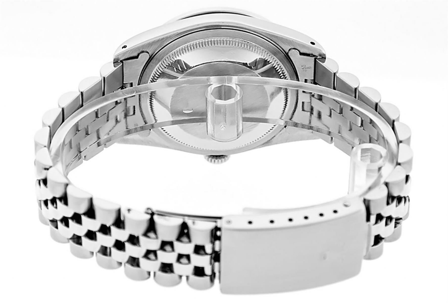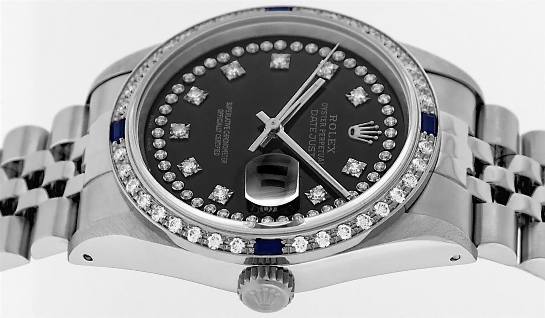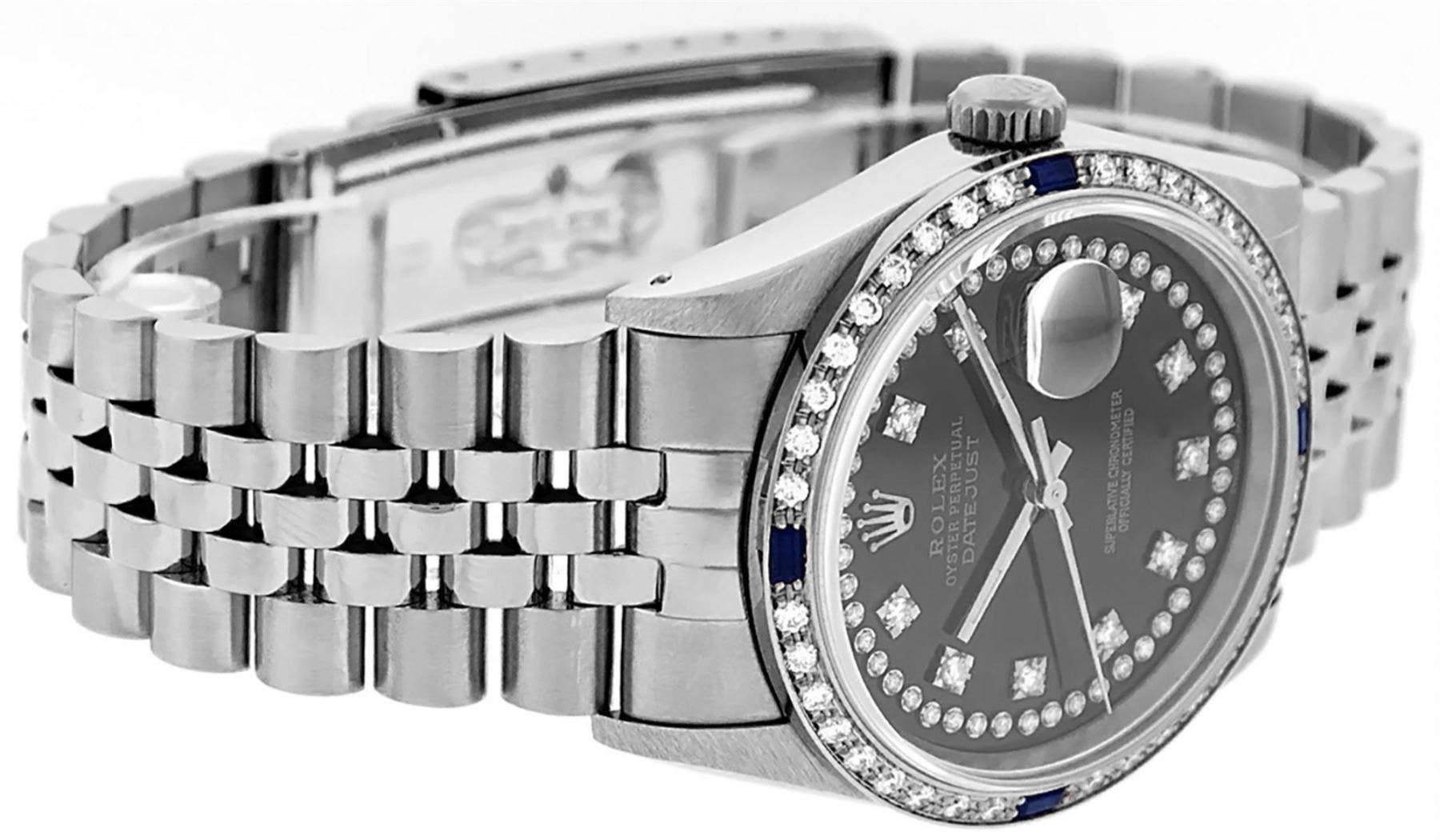 One Mens Stainless Steel Rolex Datejust Polished, Serviced & Electronically Tested, Stainless Steel Case: 36mm, Stainless Steel Crown, Custom Bezel: New 18K White Gold Sapphire Beadset Diamond Bezel, Diamond + Gem Count: 36 Diamonds + 4 Sapphires, Total Weight 1.00 Carat, Clarity: SI-VS, Color: G to H. Custom Crystal: New Scratch Resistant Synthetic Sapphire Cyclops Lens. Custom Hands: New Luminescent Hands. Movement: Automatic Winding Movement Caliber 3035. Custom Dial: Black String Diamond Dial, Diamond Count: 58 Diamonds in Dial, G To H In Color, Clarity: SI-VS. Date Window: 3 O'Clock Position Date Display, Quickset, Model: Datejust. Condition: G-6 Extra Fine. Bracelet: Stainless Steel Jubilee Band. Bright Polish & Satin Finish. 7.0 Inch Length, Adjustable. Standard Clasp, With Rolex Logo. This Watch Has Been Serviced Time Tested And Is In Excellent Condition It Is Free Of All Scratches And Dents.
