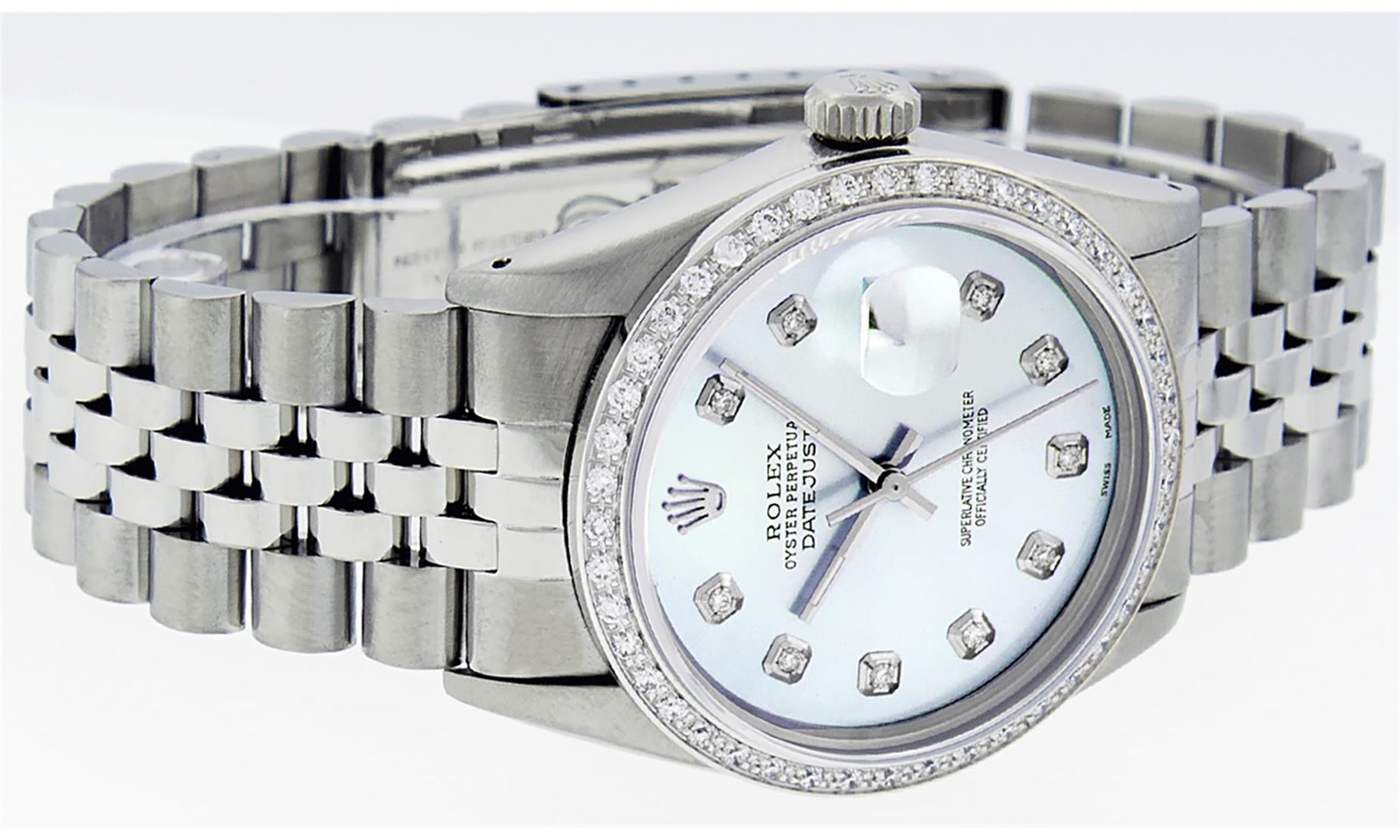 One Mens Stainless Steel Rolex Datejust Polished, Serviced & Electronically Tested, Stainless Steel Case: 36mm, Stainless Steel Crown, Custom Bezel: New 18K White Gold Beadset Diamond Bezel, Diamond Count: 44 Diamonds In Bezel, Total Weight 1.00 Carat, Clarity: SI-VS, Color: G to H. Custom Crystal: New Scratch Resistant Synthetic Sapphire Cyclops Lens. Custom Hands: New Luminescent Hands. Movement: Automatic Winding Movement Caliber 3035. Custom Dial: Blue Diamond Dial, Diamond Count: 10 Diamonds in Dial, G To H In Color, Clarity: SI-VS. Date Window: 3 O'Clock Position Date Display, Quickset, Model: Datejust. Condition: G-6 Extra Fine. Bracelet: Stainless Steel Jubilee Band. Bright Polish & Satin Finish. 7.0 Inch Length, Adjustable. Standard Clasp, With Rolex Logo. This Watch Has Been Serviced Time Tested And Is In Excellent Condition It Is Free Of All Scratches And Dents.