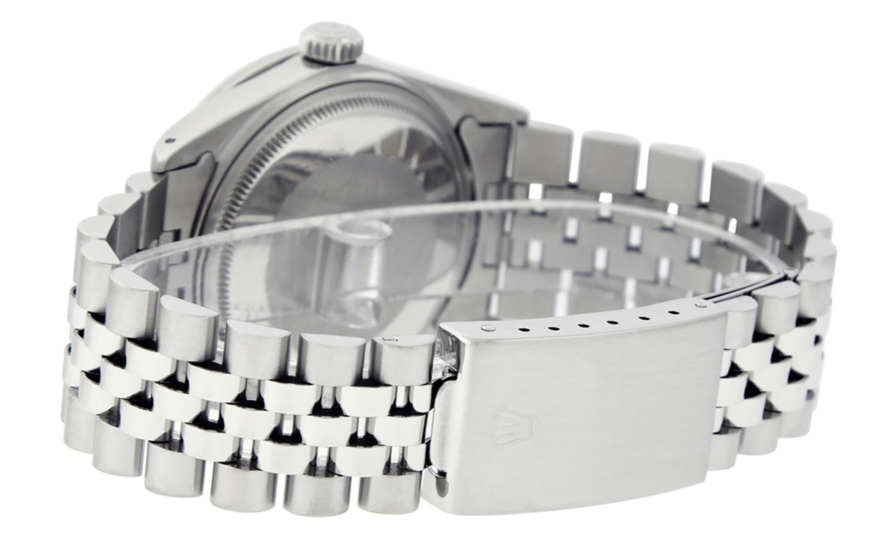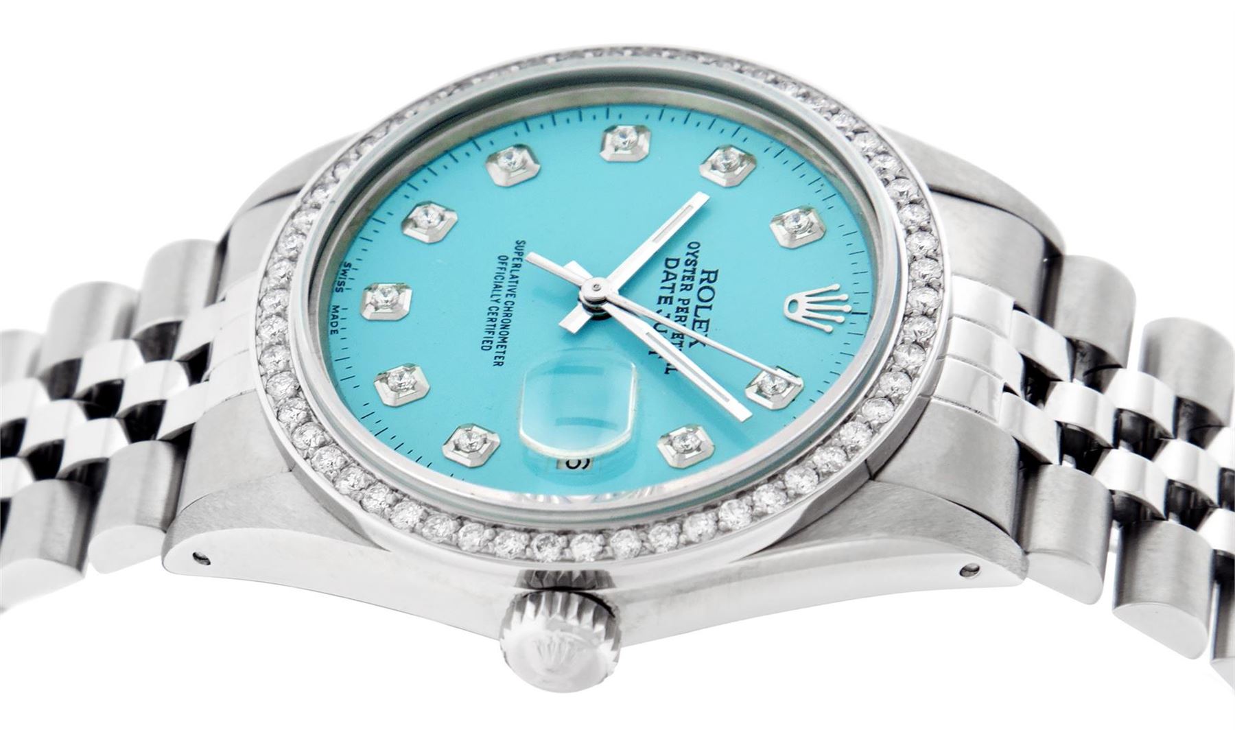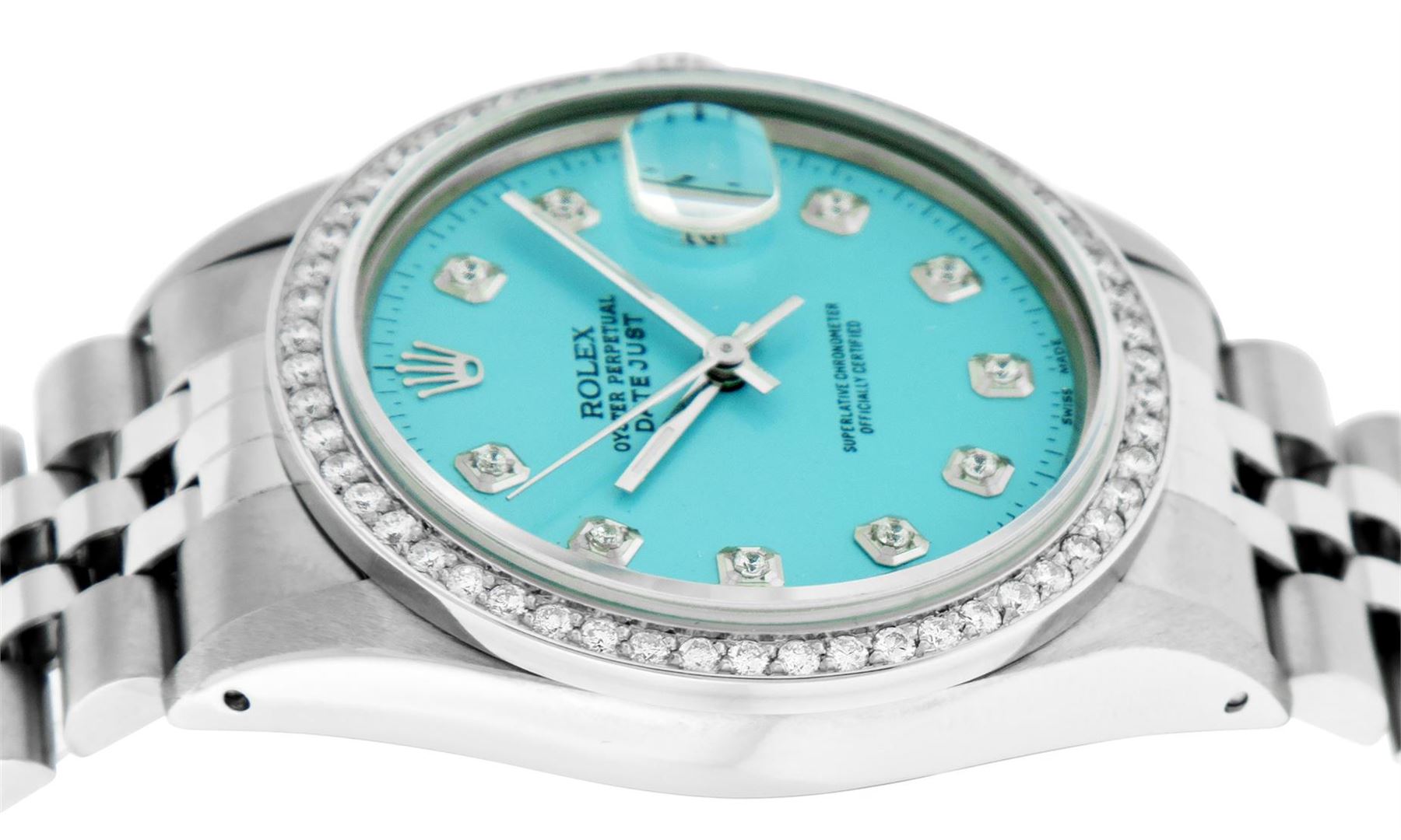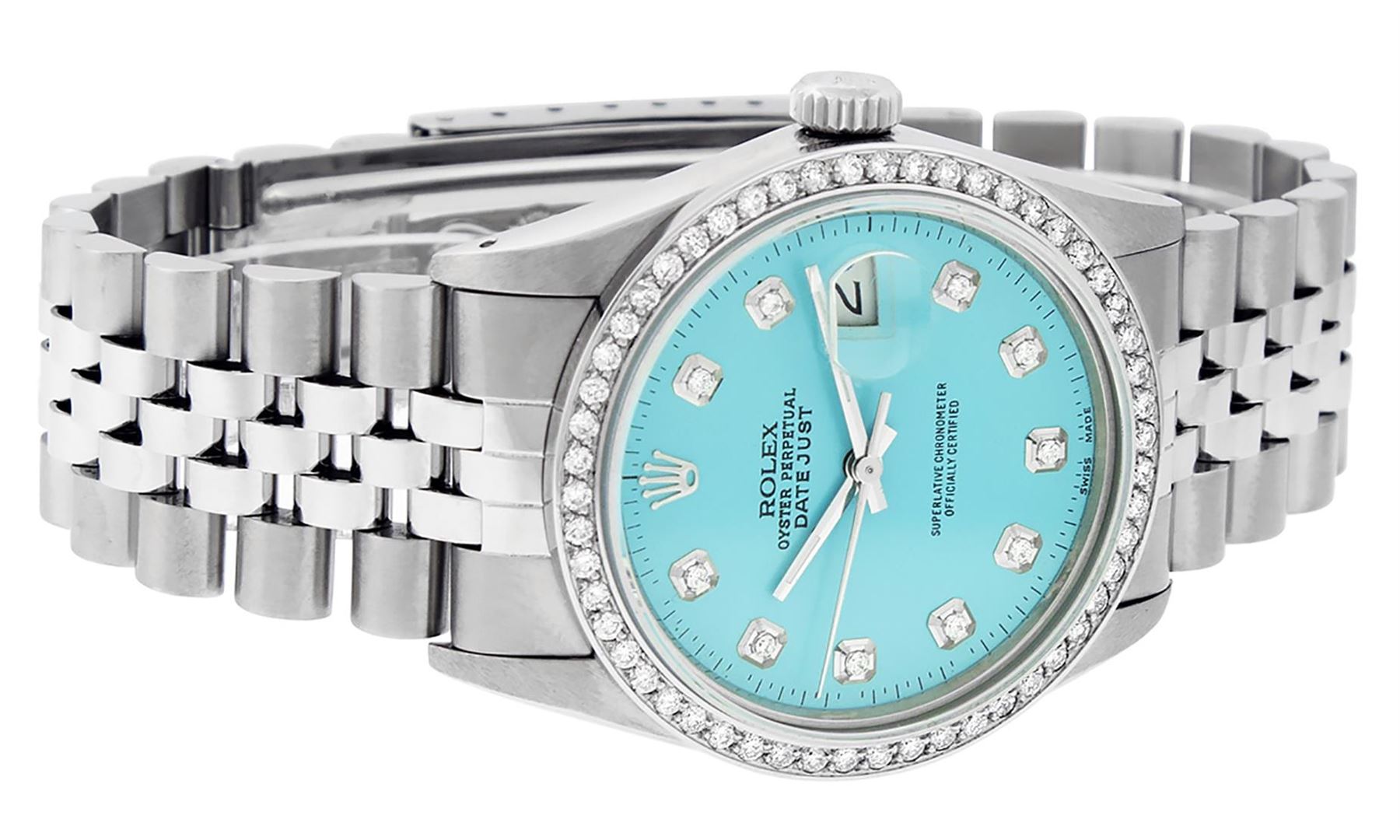 One Mens Rolex Stainless Steel Datejust Polished Bright with Satin Finish, This Watch Has Been Serviced & Electronically Tested, Stainless Steel Case: 36mm, Stainless Steel Crown, Custom Bezel: New Stainless Steel Beadset Diamond Bezel, Diamond Count: 54 Diamonds In Bezel, Total Weight 1.00 Carat, Clarity: SI-VS, Color: G to H. Custom Crystal: New Scratch Resistant Synthetic Sapphire Cyclops Lens. Custom Hands: New Luminescent Hands. Movement: Automatic Winding Movement. Custom Dial: Blue Diamond Dial With Dash Track, Diamond Count: 10 Diamonds On Dial, Color: G to H, Clarity: VS2-SI1. Date Window: 3 O'Clock Position Date Display, Quickset, Model: Datejust. Condition: G-6 Extra Fine. Bracelet: Stainless Steel Jubilee Band. Bright Polish & Satin Finish. 7.0 Inch Length, Adjustable. Standard Clasp, With Rolex Logo. This Watch Has Been Serviced Time Tested And Is In Excellent Condition It Is Free Of All Scratches And Dents.