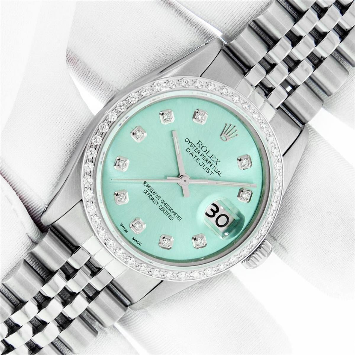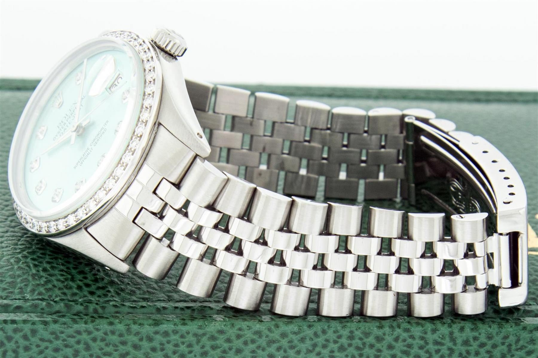 One Mens Stainless Steel Rolex Datejust Polished, Serviced & Electronically Tested, Stainless Steel Case: 36mm, Stainless Steel Crown, Custom Bezel: New 18K White Gold Beadset Diamond Bezel, Diamond Count: 44 Diamonds In Bezel, Total Weight 1.00 Carat, Cl