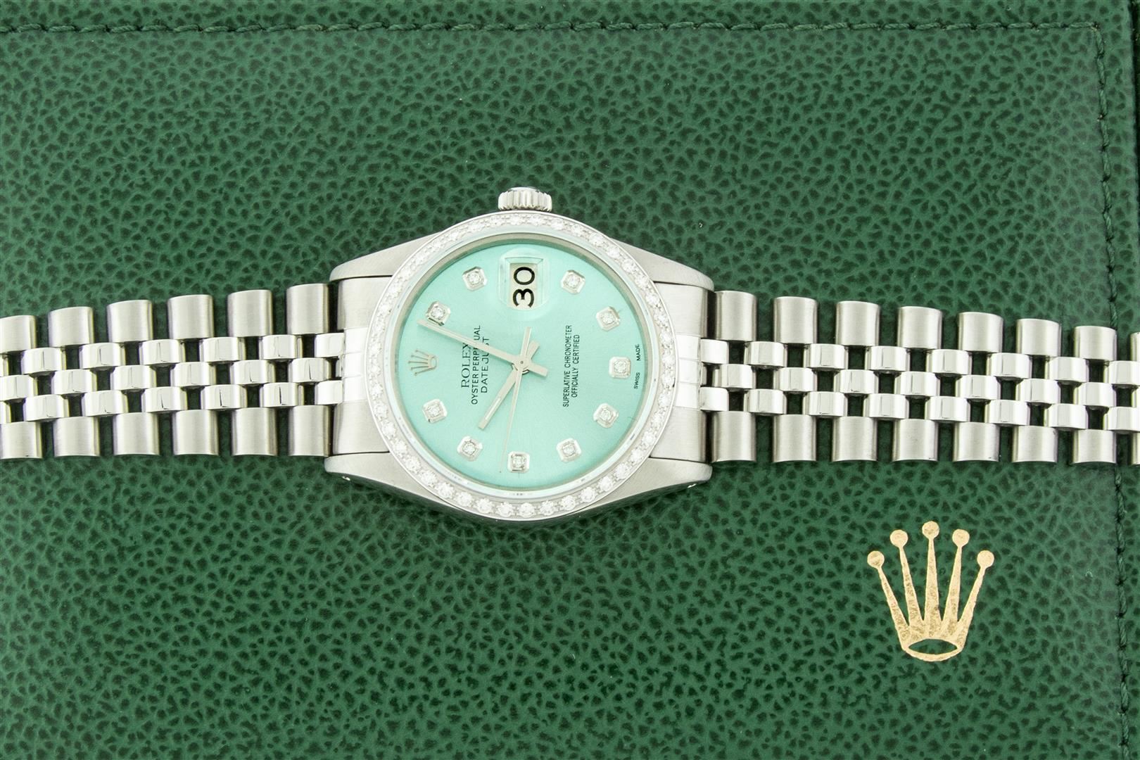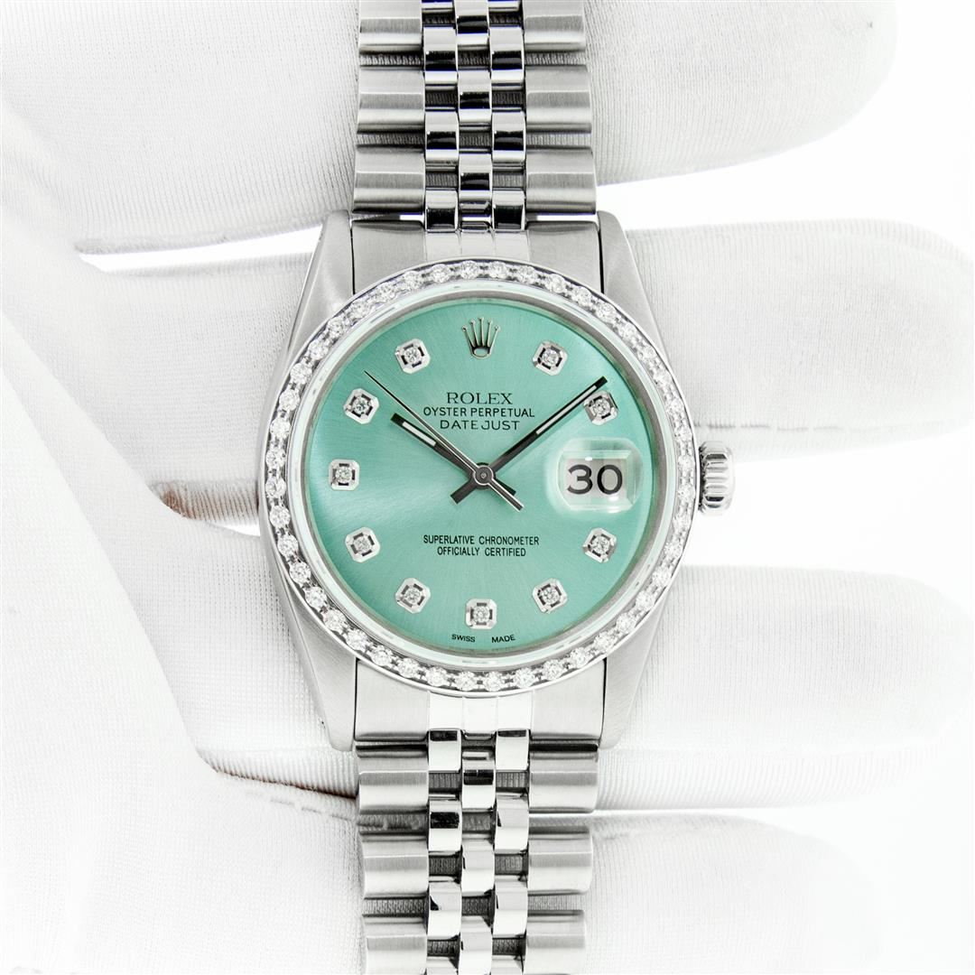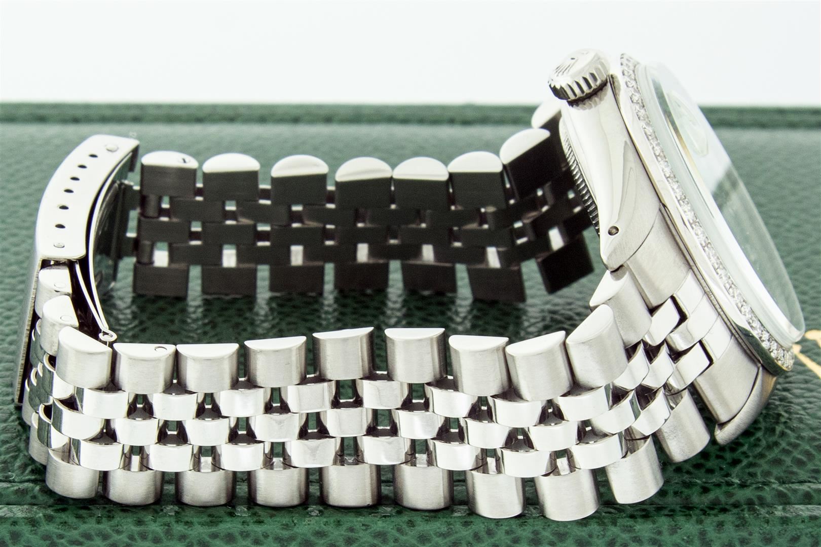 One Mens Stainless Steel Rolex Datejust Polished, Serviced & Electronically Tested, Stainless Steel Case: 36mm, Stainless Steel Crown, Custom Bezel: New 18K White Gold Beadset Diamond Bezel, Diamond Count: 44 Diamonds In Bezel, Total Weight 1.00 Carat, Cl