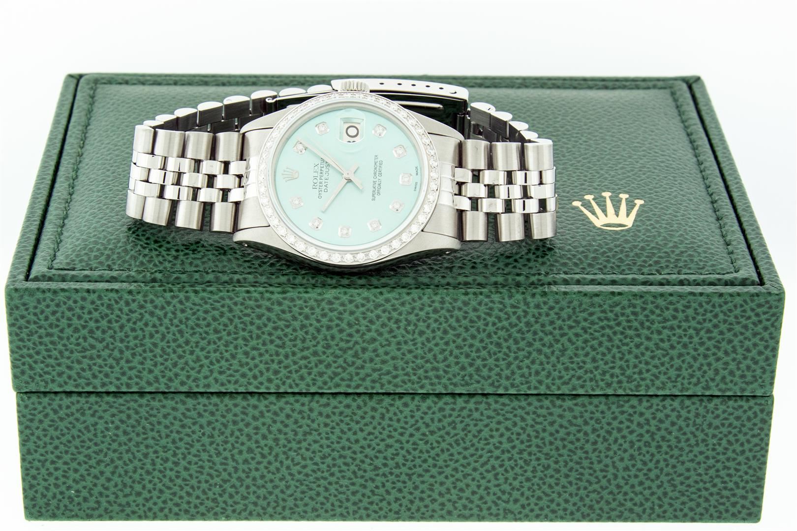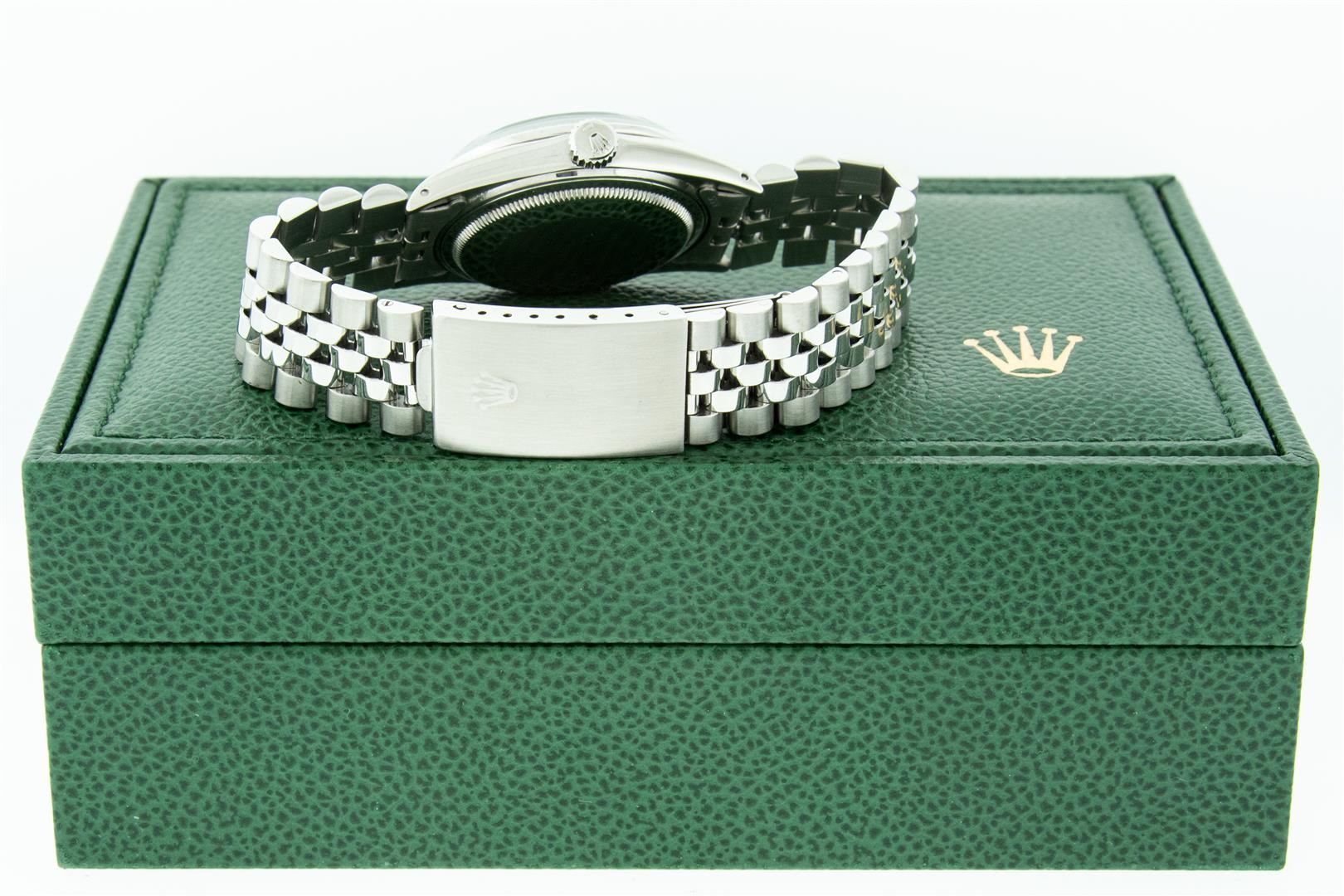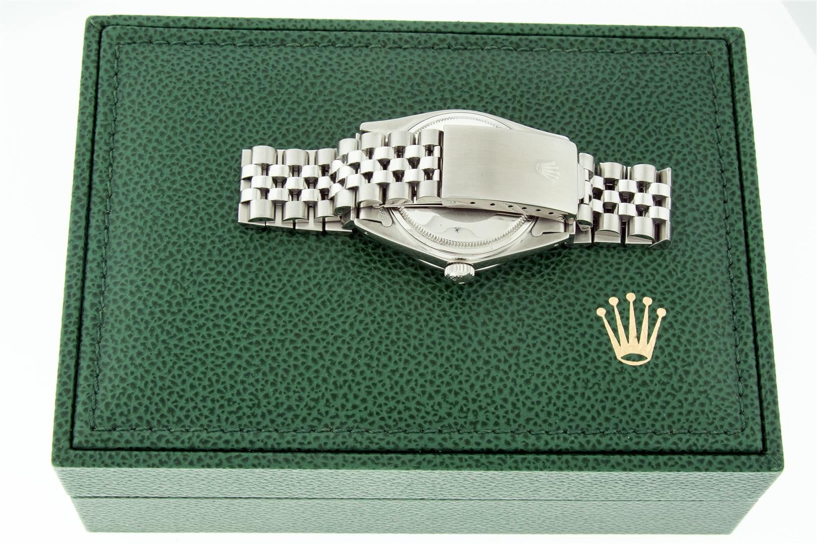 One Mens Stainless Steel Rolex Datejust Polished, Serviced & Electronically Tested, Stainless Steel Case: 36mm, Stainless Steel Crown, Custom Bezel: New 18K White Gold Beadset Diamond Bezel, Diamond Count: 44 Diamonds In Bezel, Total Weight 1.00 Carat, Cl